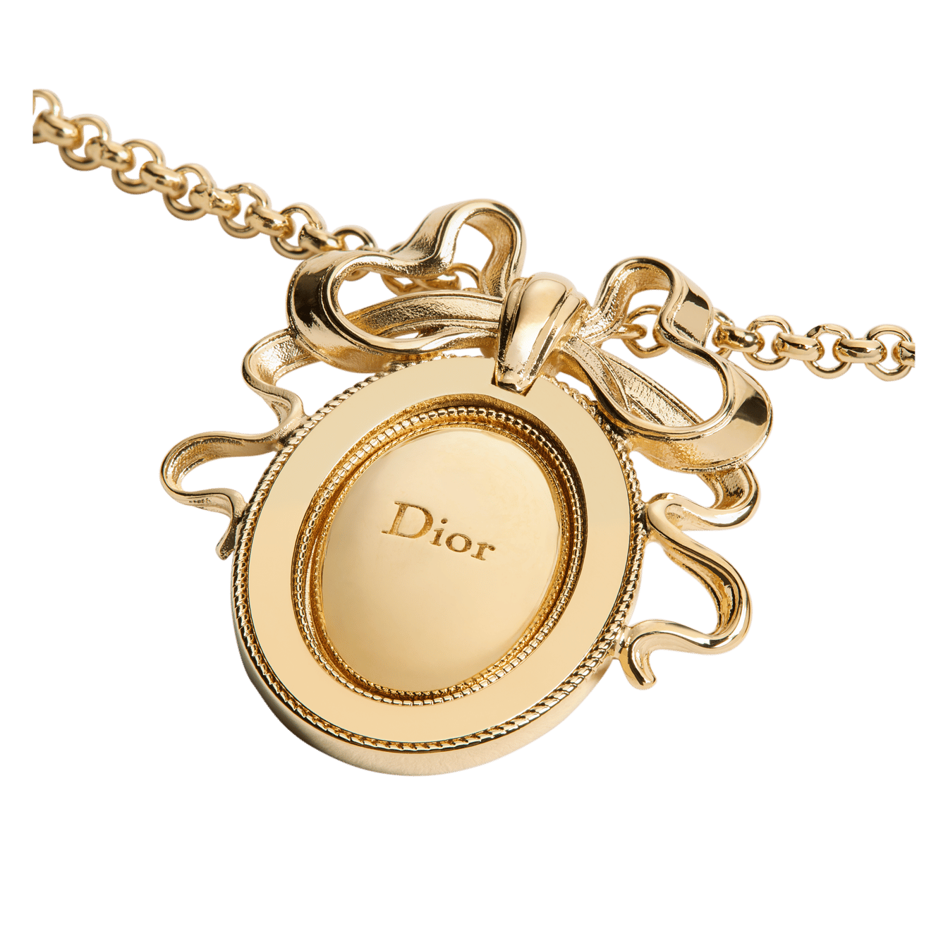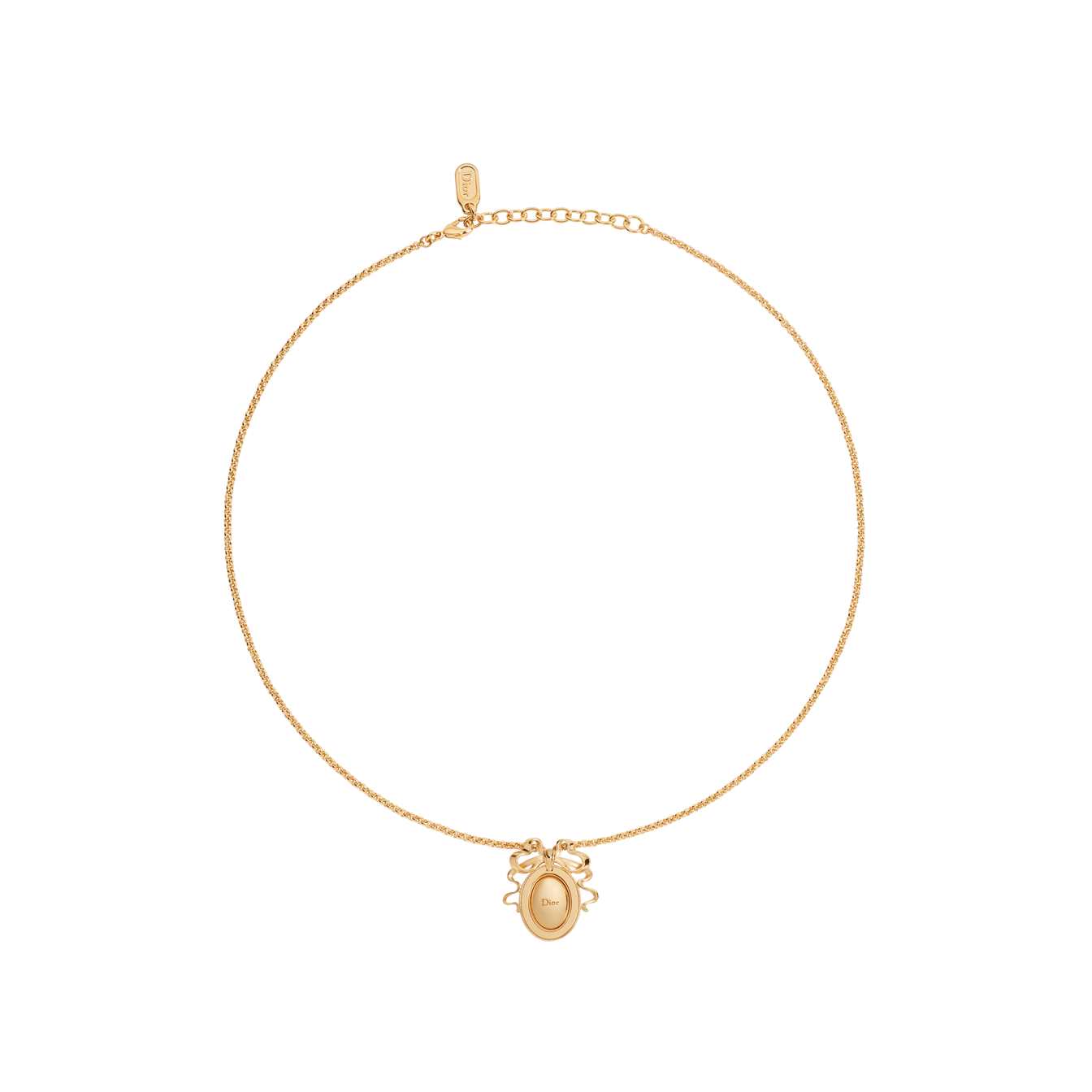ディオールのシンボルである「メダリオンチェア」に着想したネックレス。ゴールドトーンメタルのメダリオン(紋章)に、メゾンが長く大事にしてきたリボンのモチーフとブランドロゴをのせた。