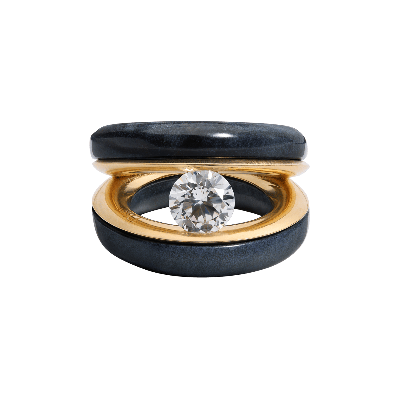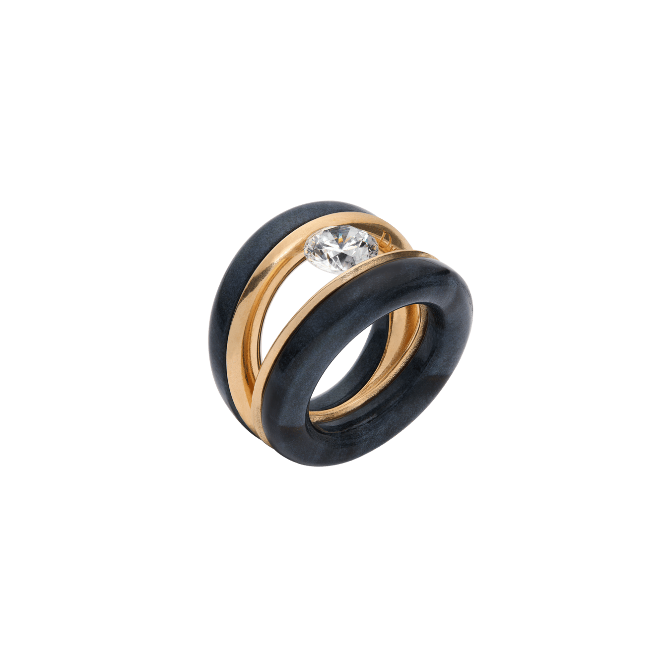 存在感のあるボリュームのリングは、丁寧に研磨することで鮮やかなきらめきを引き出した3Dプリントのストーンエフェクト レジンが手元をモダンな印象に。リングの中央にはクリスタルが輝く。