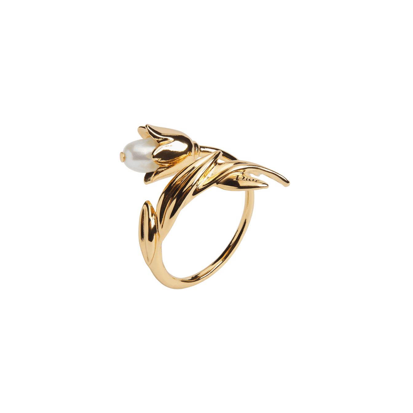 純粋さと喜びのシンボルであるスズランを淡水パールで表現したリング。指に絡みつくように優美な曲線を描く葉の部分には、ブランドロゴをあしらった。単体でもほかのリングとのレイヤードでも馴染むデザイン。