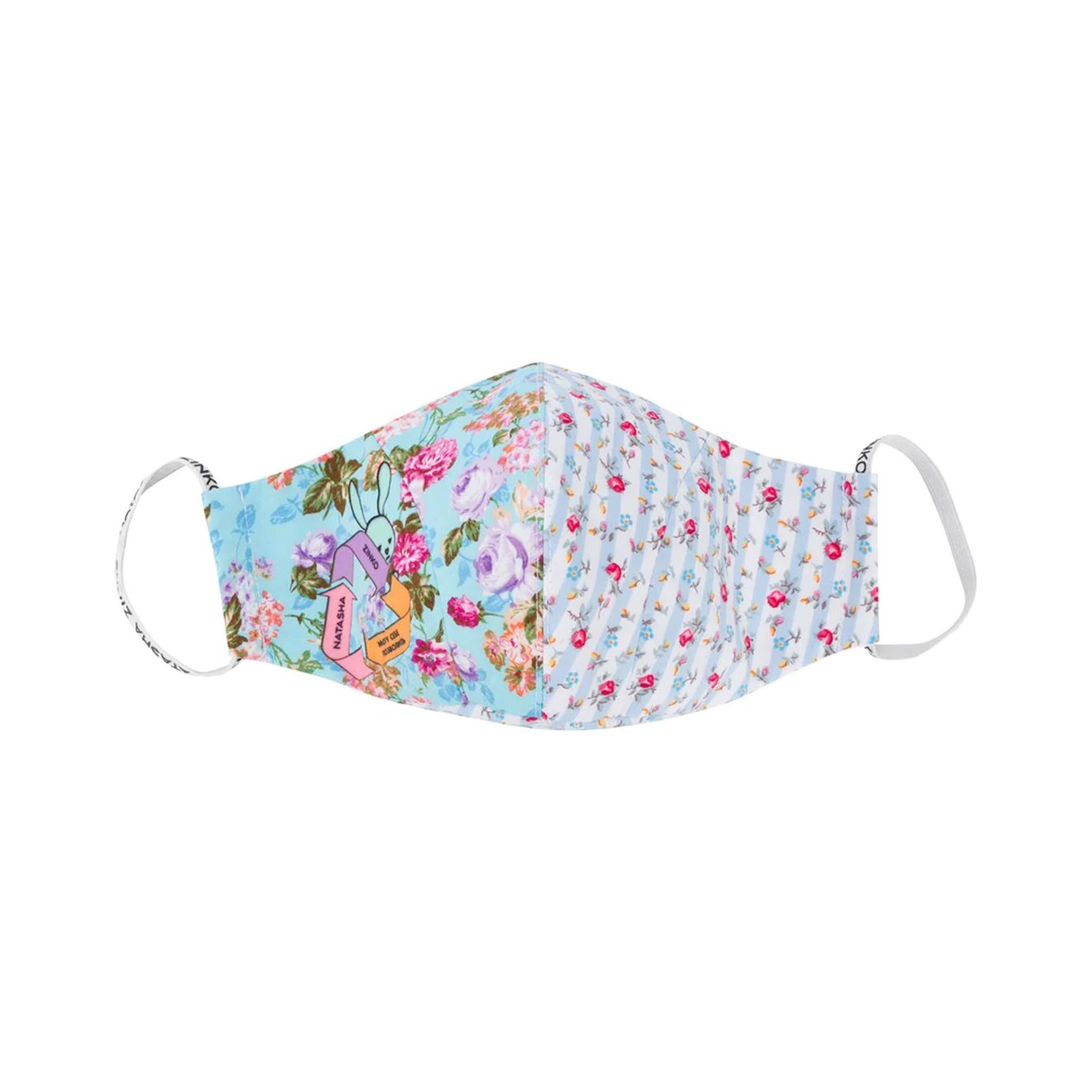 フローラルプリントのパッチワークがスイートでキュートなナターシャ・ジンコのマスク。手作り感がありつつも、リサイクルマークのロゴやストラップに入ったブランド名でさりげなくブランドをアピールできます。