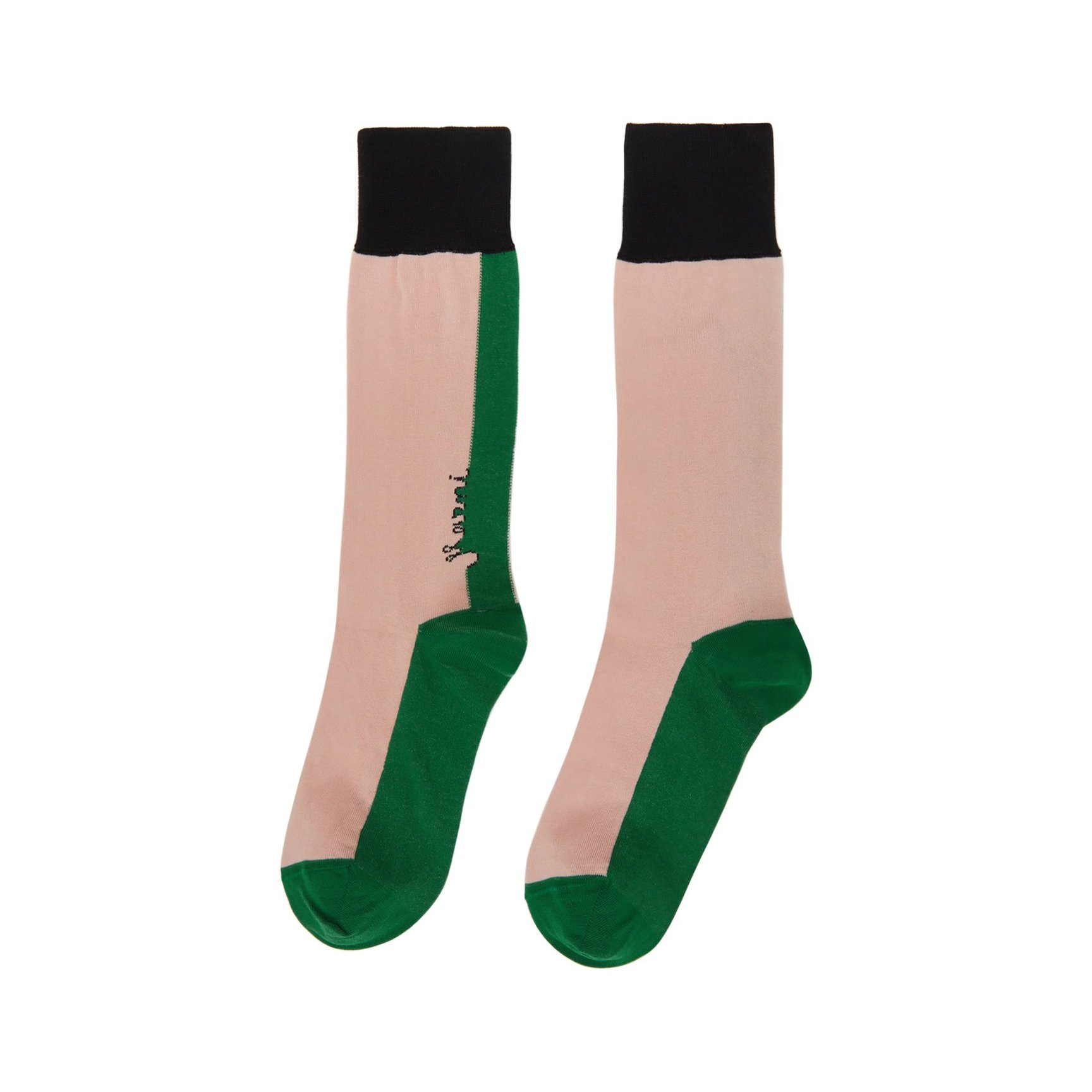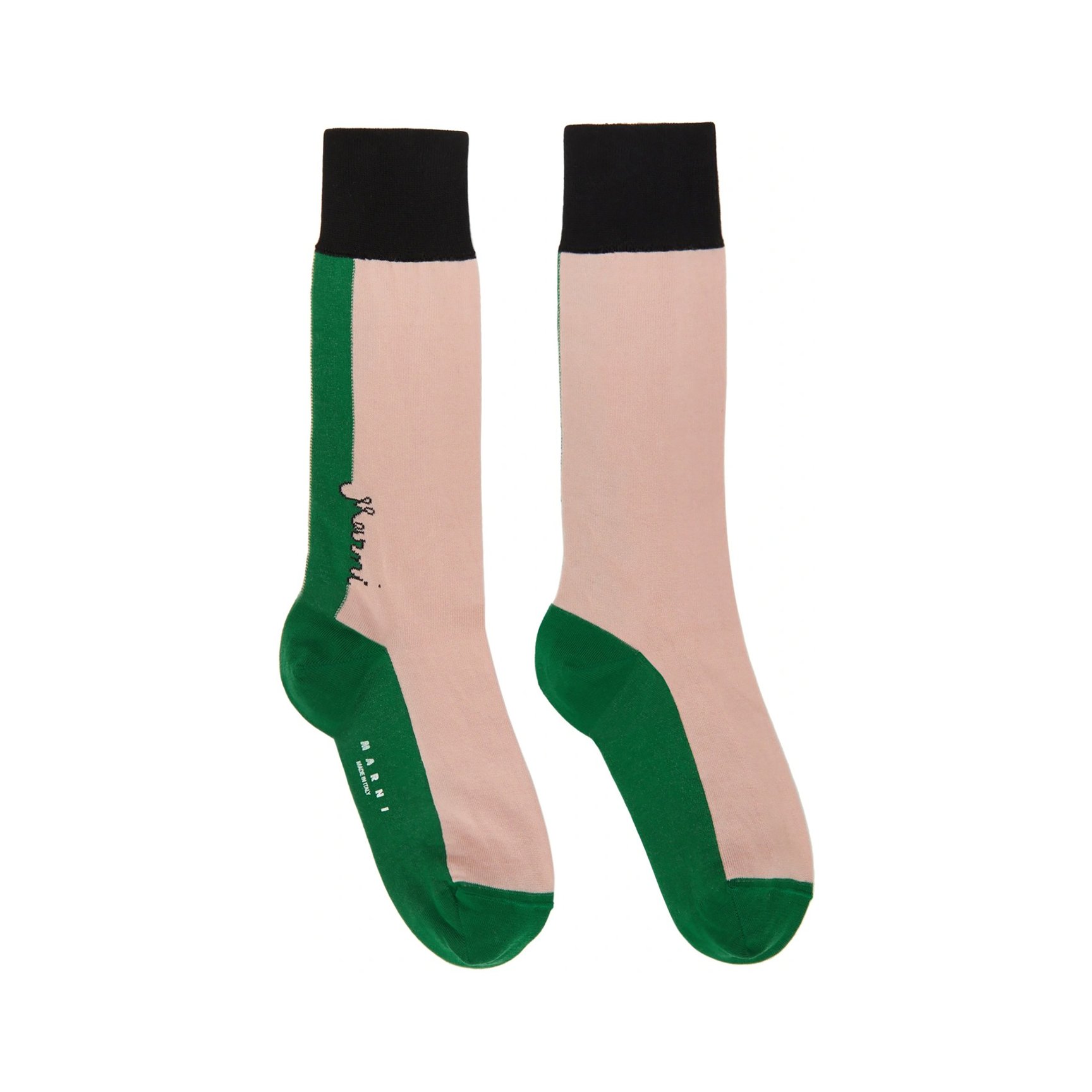 軽やかなグリーンやパステルカラーを可愛くなりすぎない所でキュッと締めるブラックカラーが絶妙な、「マルニ(MARNI)」のソックス。縦に入るグリーンラインに被さるようにして入ったブランドロゴも、主張しすぎないところが本ブランドらしい上品さ。