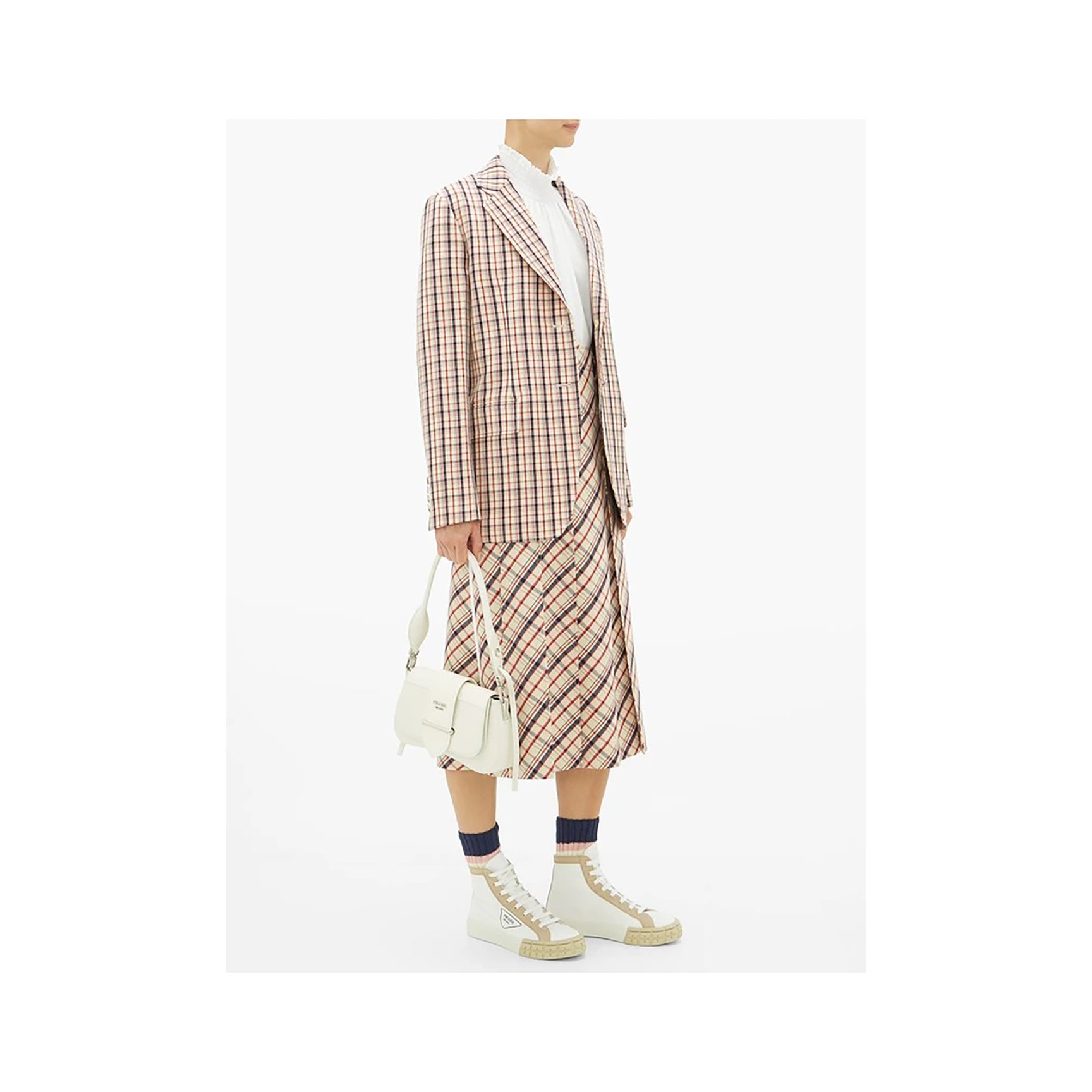 クリームカラーのベースにネイビーとピンクのストライプがあしらわれた「プラダ(PRADA)」のソックスの魅力は何と言っても計算された絶妙なカラーリング。実際に履いてみると実感するハイブランドのパワフルなデザイン力が発揮された、エフォートレスな上質プロダクトです。