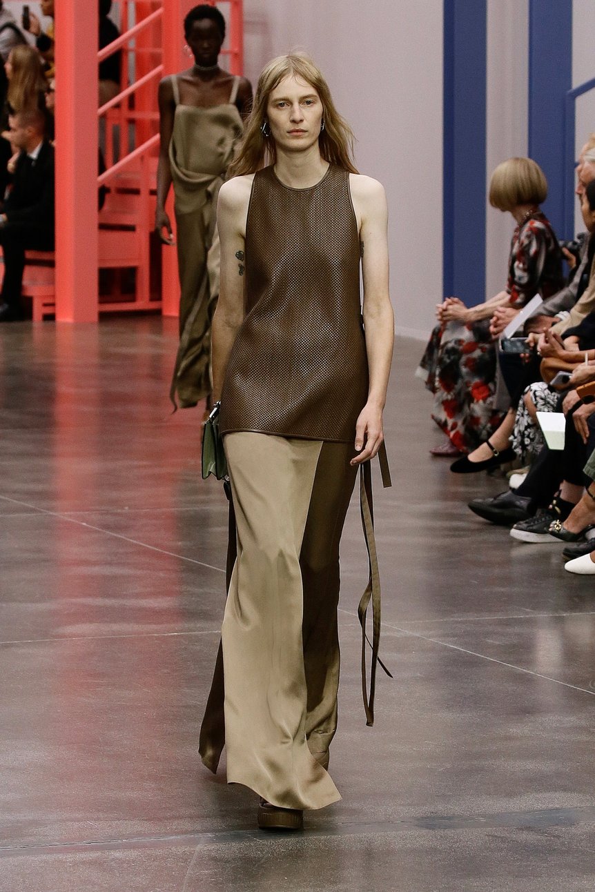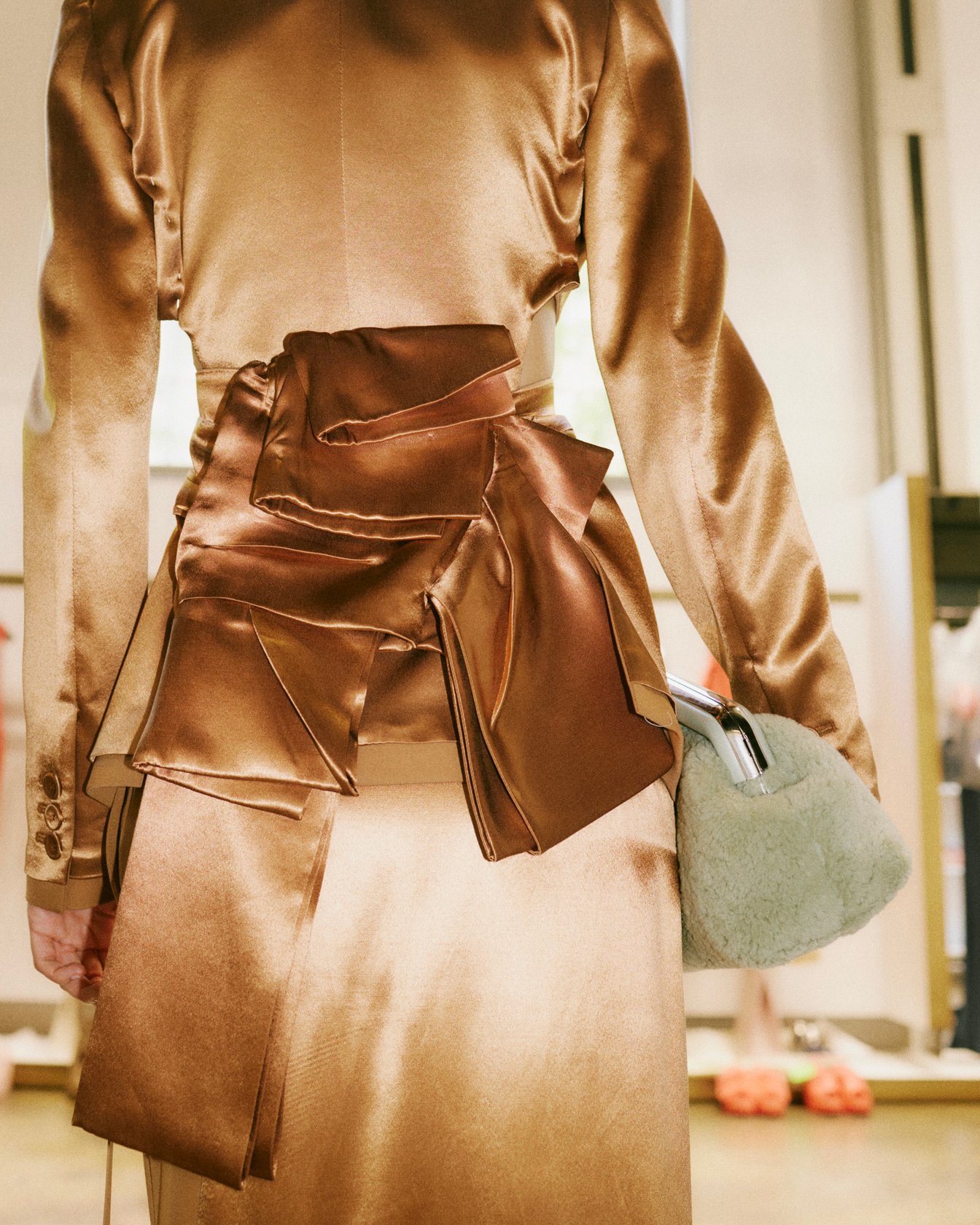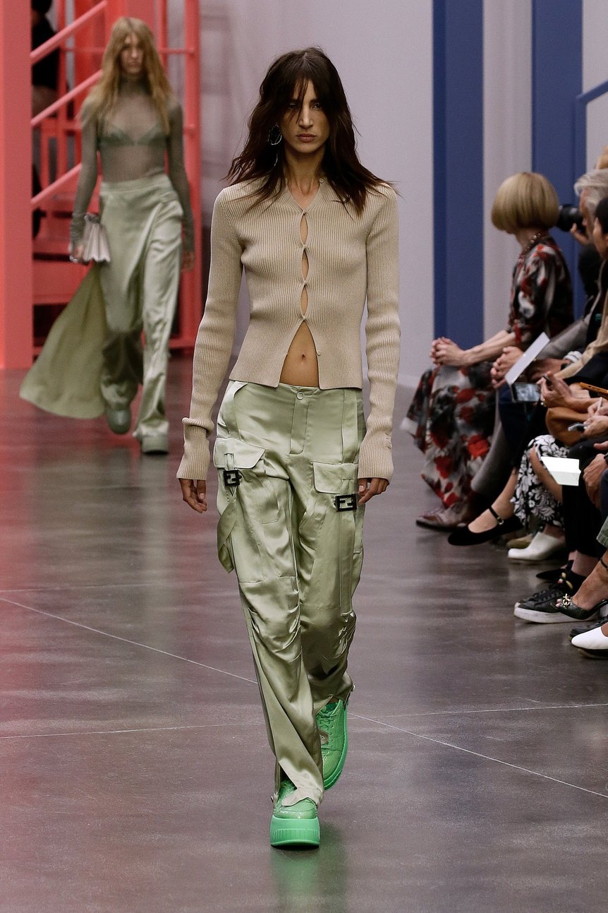 シルキーなサテン素材を多用し、エレガントな雰囲気をまといながらもスポーティーな要素も。フェンディらしいニュートラルカラーをベースに、会場の柱と同色のパキッとしたライトグリーンやサーモンピンクがアクセントとなり、春夏らしくオーガンザやメッシュ、複雑に織り込まれたレザートップスを重ねたほか、テクニカル素材のニットドレスやカーディガンではヘルシーに肌見せ。ボトムスは、バゲットバッグのハードウェアをポケットのデザインとして採用したカーゴパンツなど、エフォートレスなオフスタイルも。