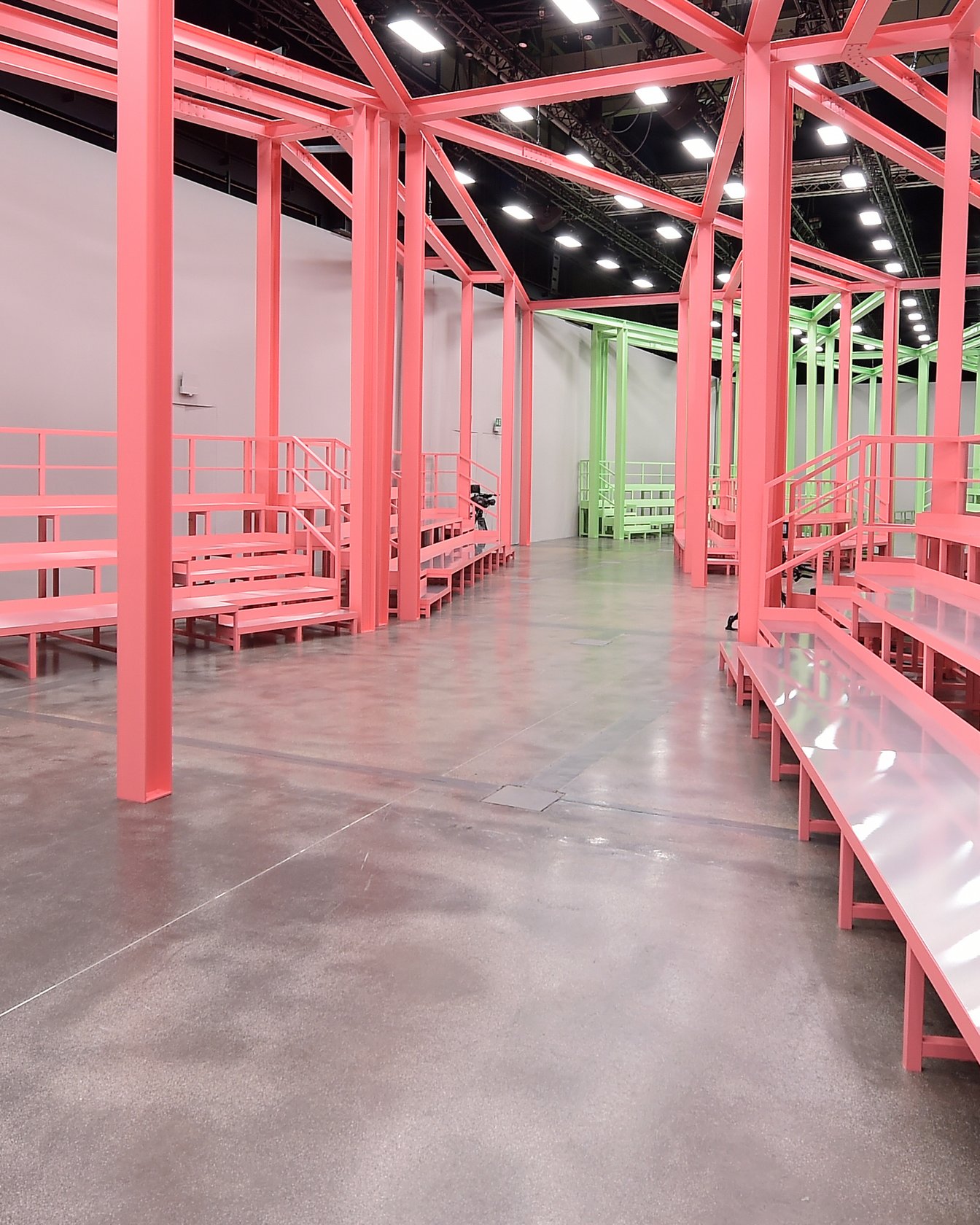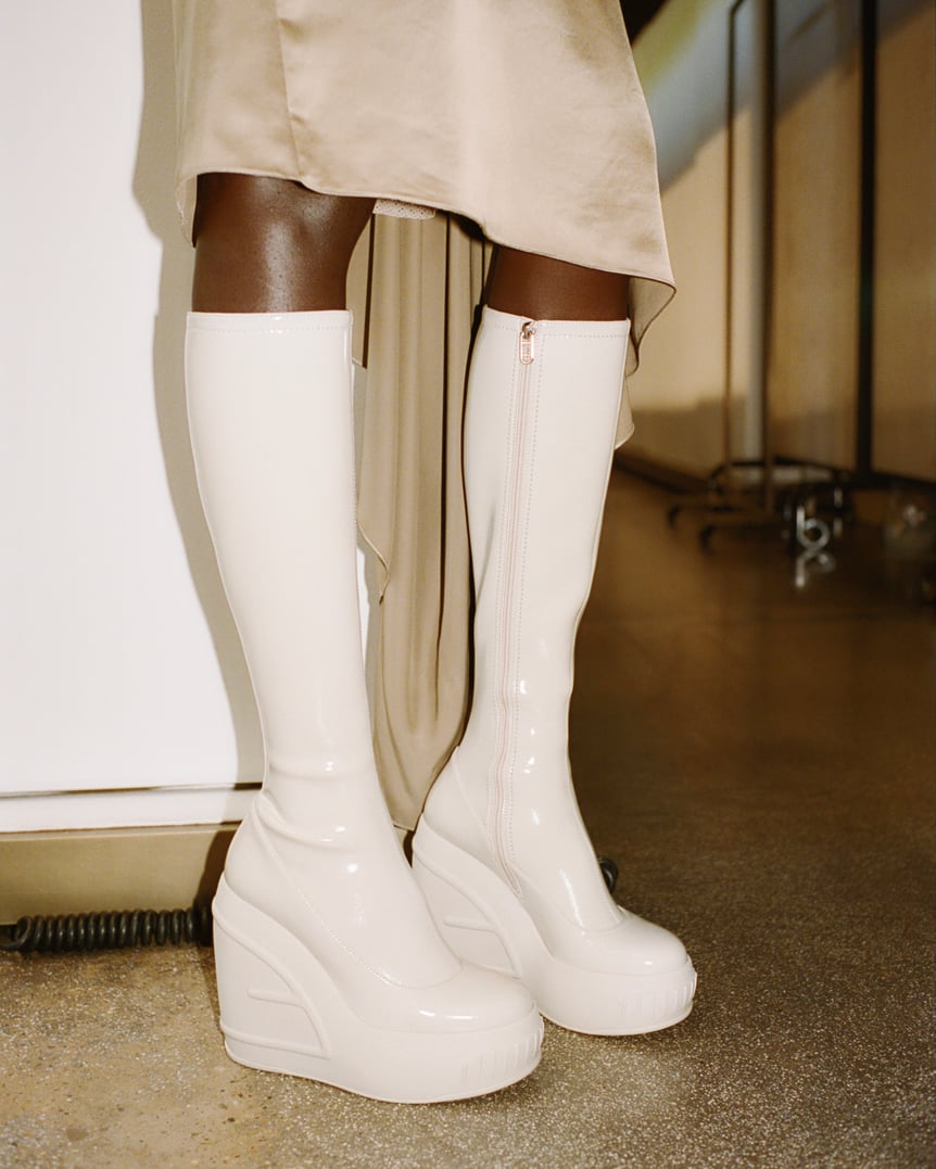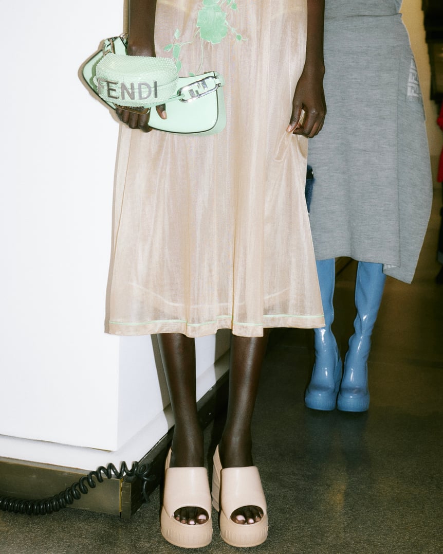 シューズはすべて「F」のレターがラバーソールにあしらわれた厚底プラットフォームで、コートシューズやサンダル、ブーツなどウェアのモノトーンカラーに呼応したカラーリングでバリエーション豊富に登場。足元から存在感を放ち、シーズンを象徴する特徴的なスタイリングを完成させた。