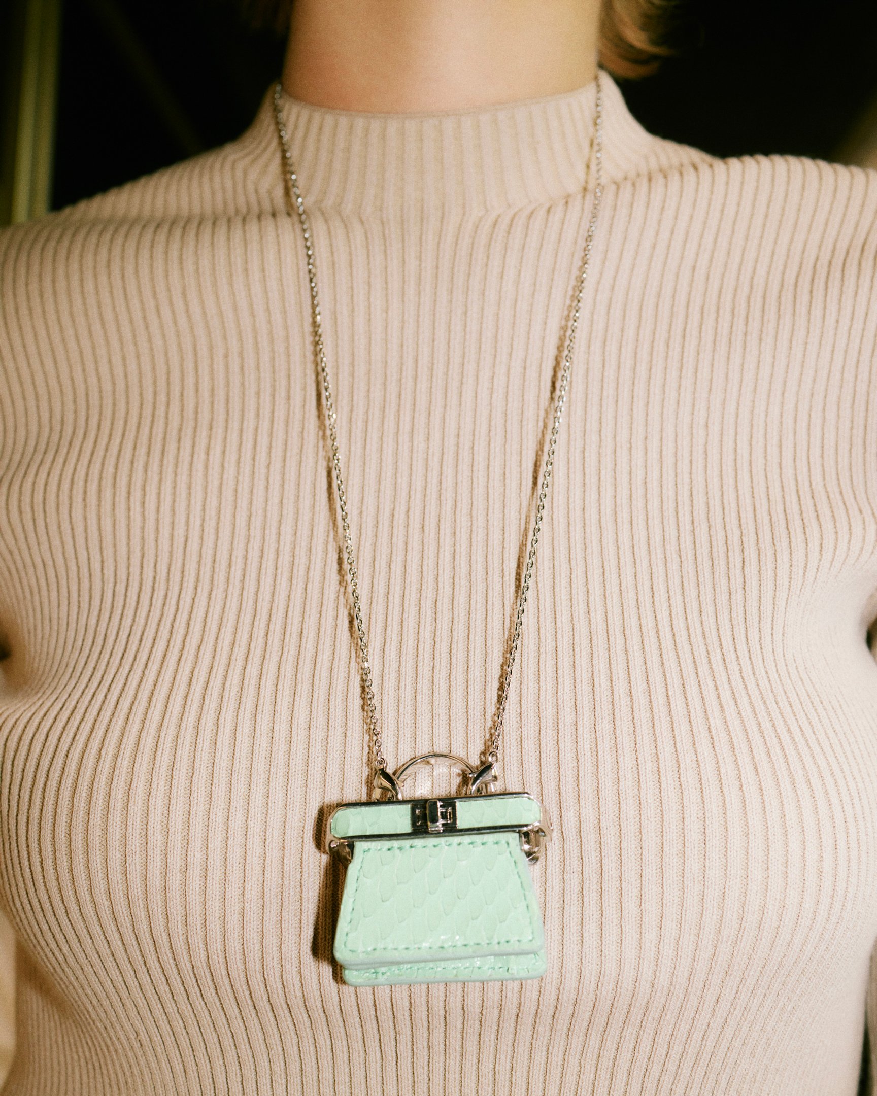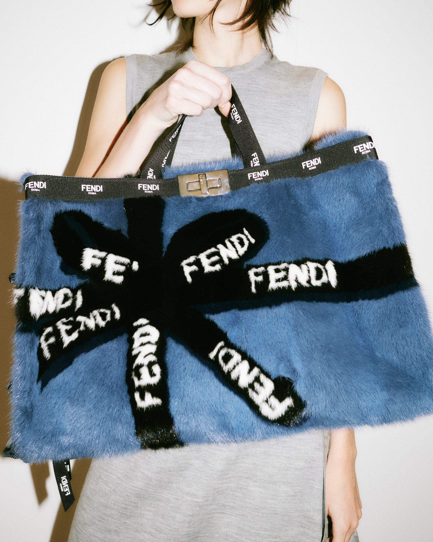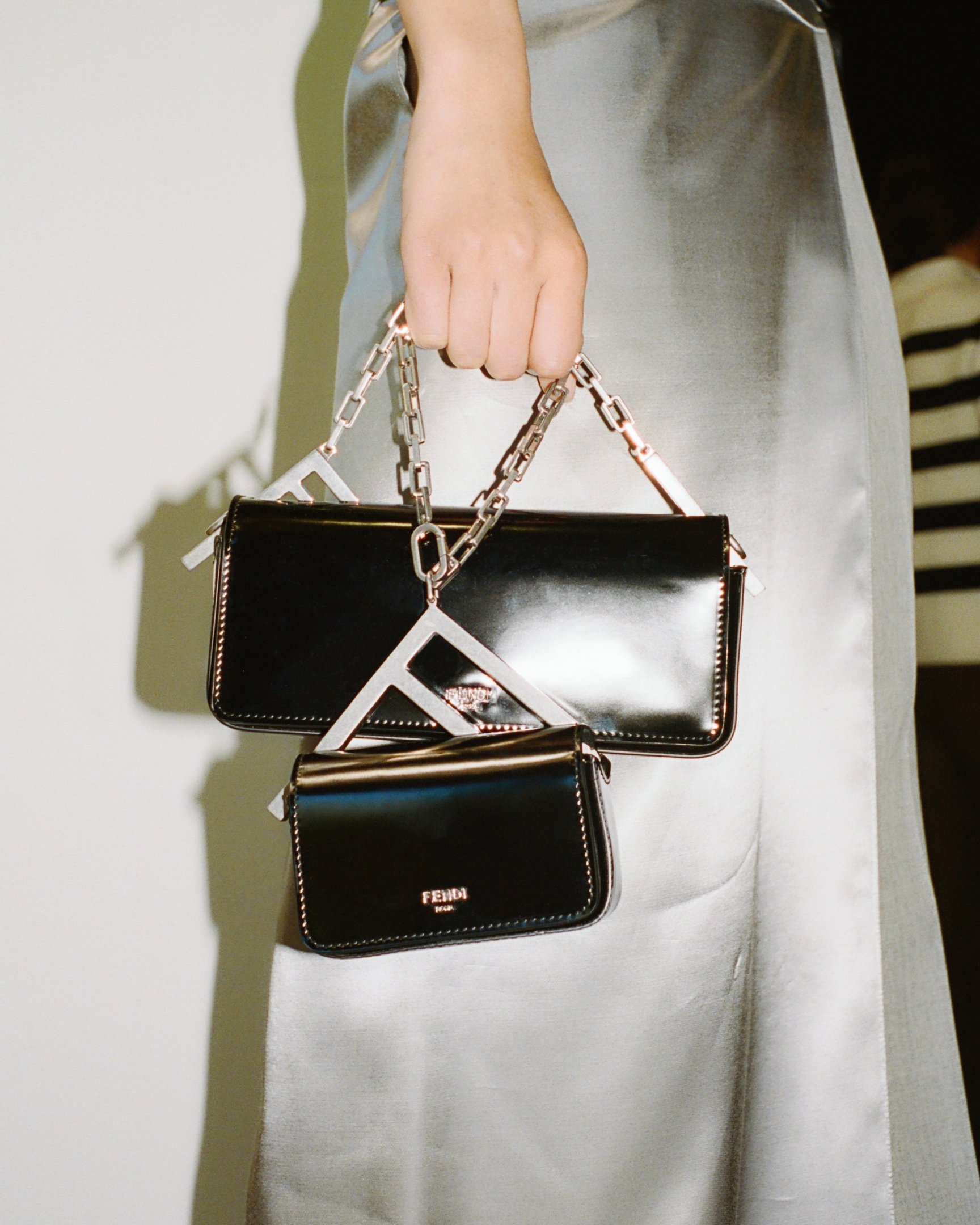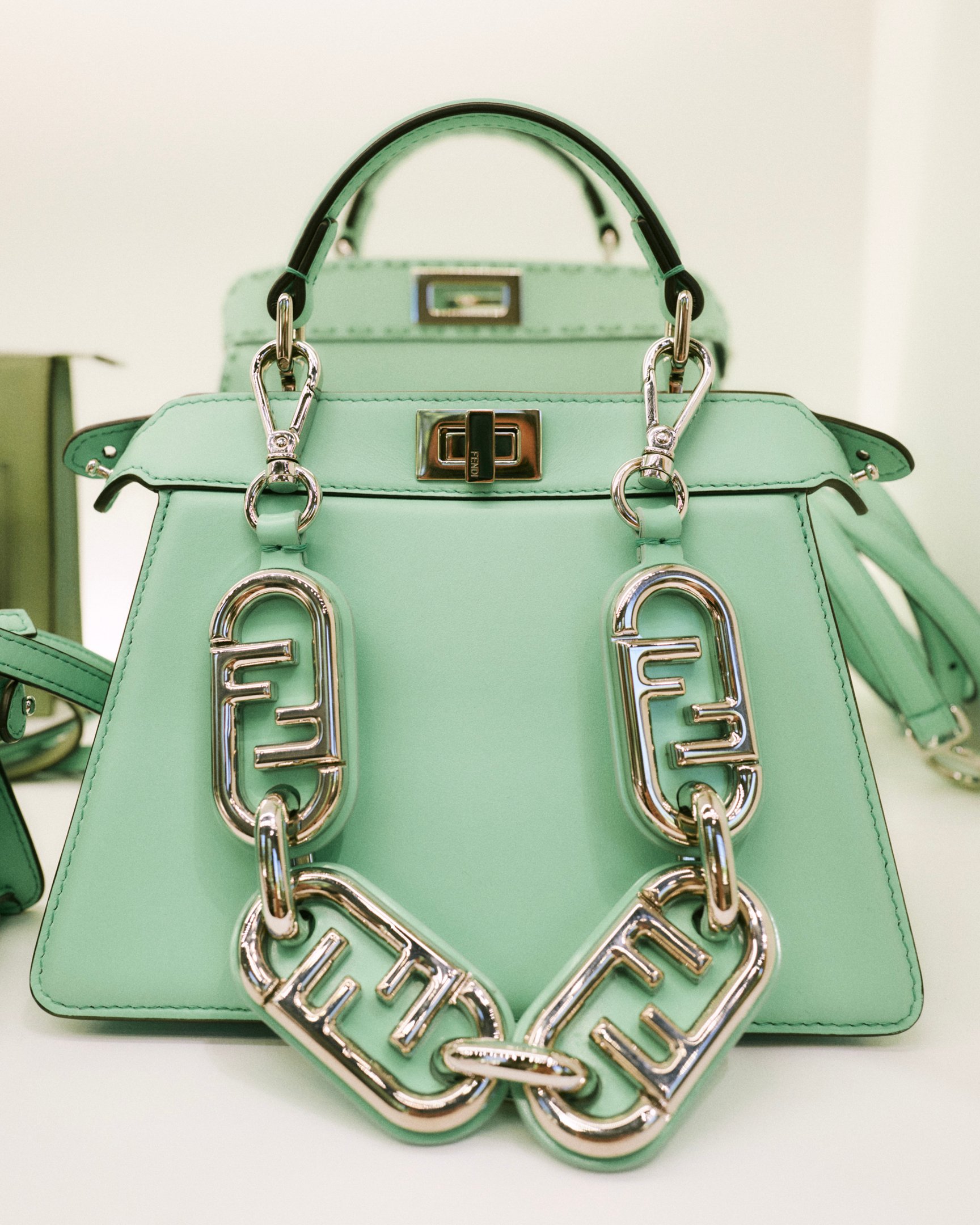 重ね持ちしているように見えるバッグは、「F」のモチーフがハンドル化しチェーンで繋がれた一つのバッグ。「ピーカブー」はフェンディ オーロックの巨大チェーンが取り付けられたモデルや、アクセサリーとして首からぶら下げるマイクロサイズなどで登場した。