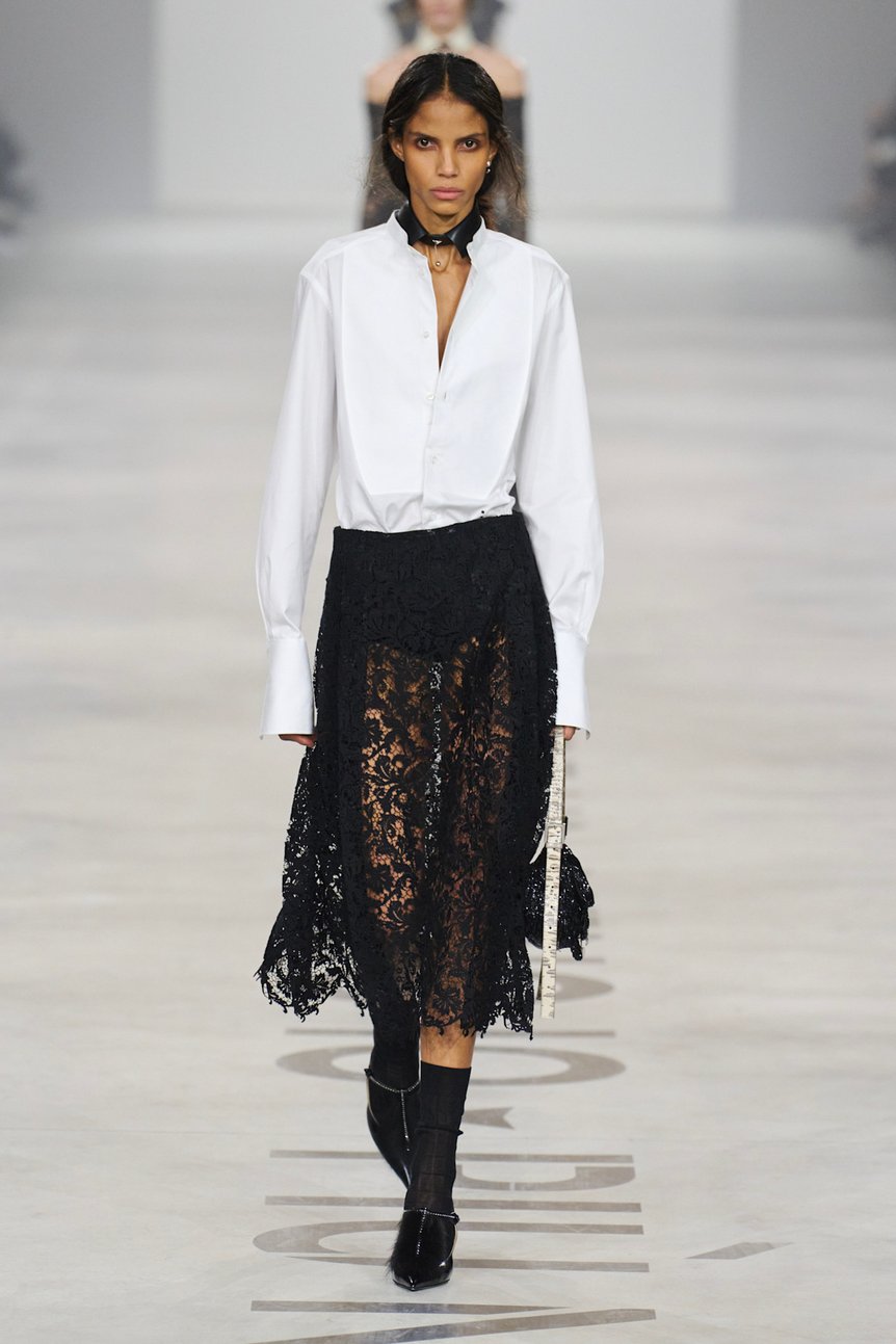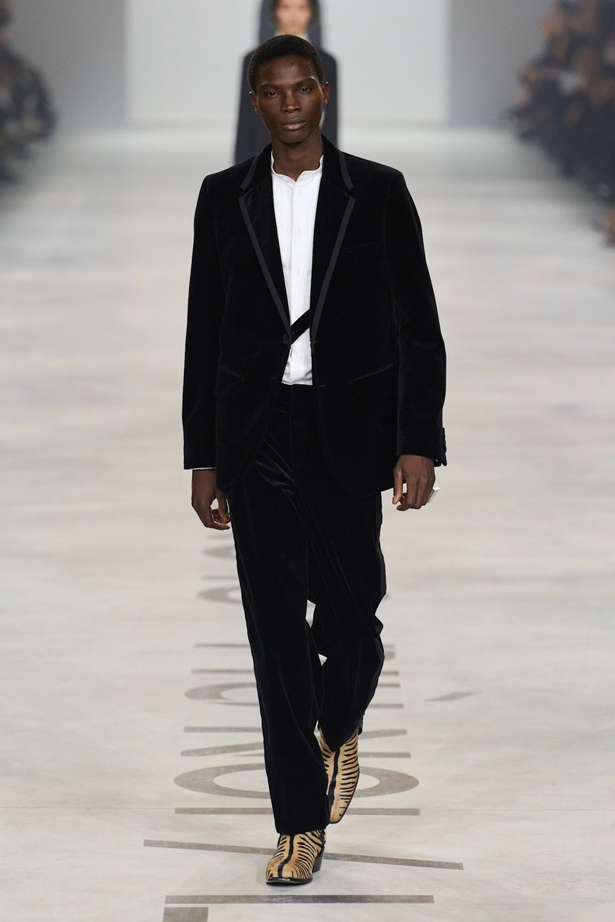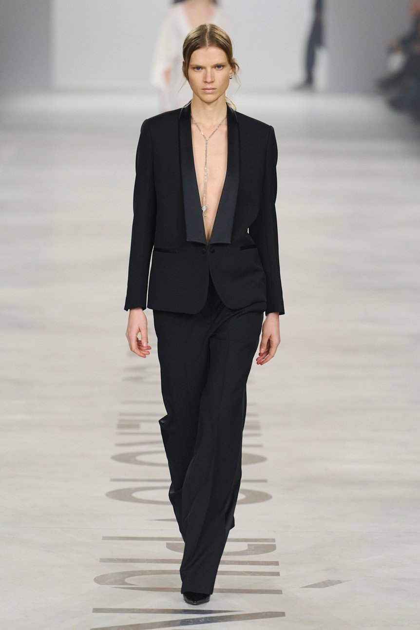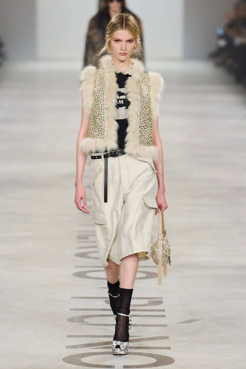 ジャケットとパンツを起点に「フェンディに明確なシルエットを与えること」に集中し、フェミニンとマスキュリンの概念を対立構造から「共有される資質」へと昇華させたという今シーズン。端正なテーラリングのタキシードやミニマルなジャンプスーツが構築的な規律を描き出す一方で、繊細なレースドレスやスパンコール、レーザーカットを施したレザーワンピースが衝動と欲望を可視化する。さらに、バイカージャケットやカーゴパンツ、ウエスタン調のデニムやサファリテイストのルックが躍動感を与え、ゼブラや虎柄、足元を飾る豹柄の靴が野生的なエレガンスを主張した。首元にはつけ襟チョーカーが添えられ、多様な要素が交錯するワードローブを見事に完成させている。