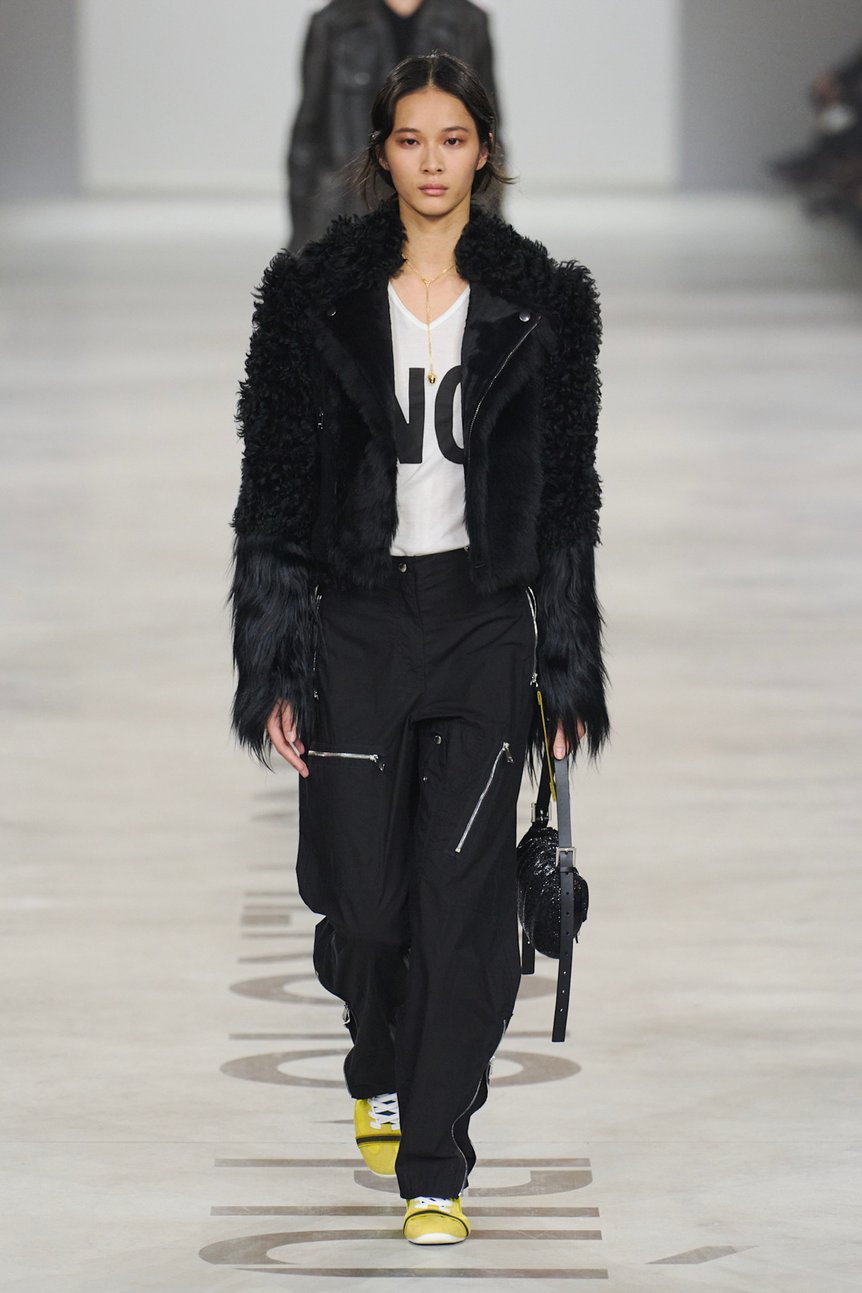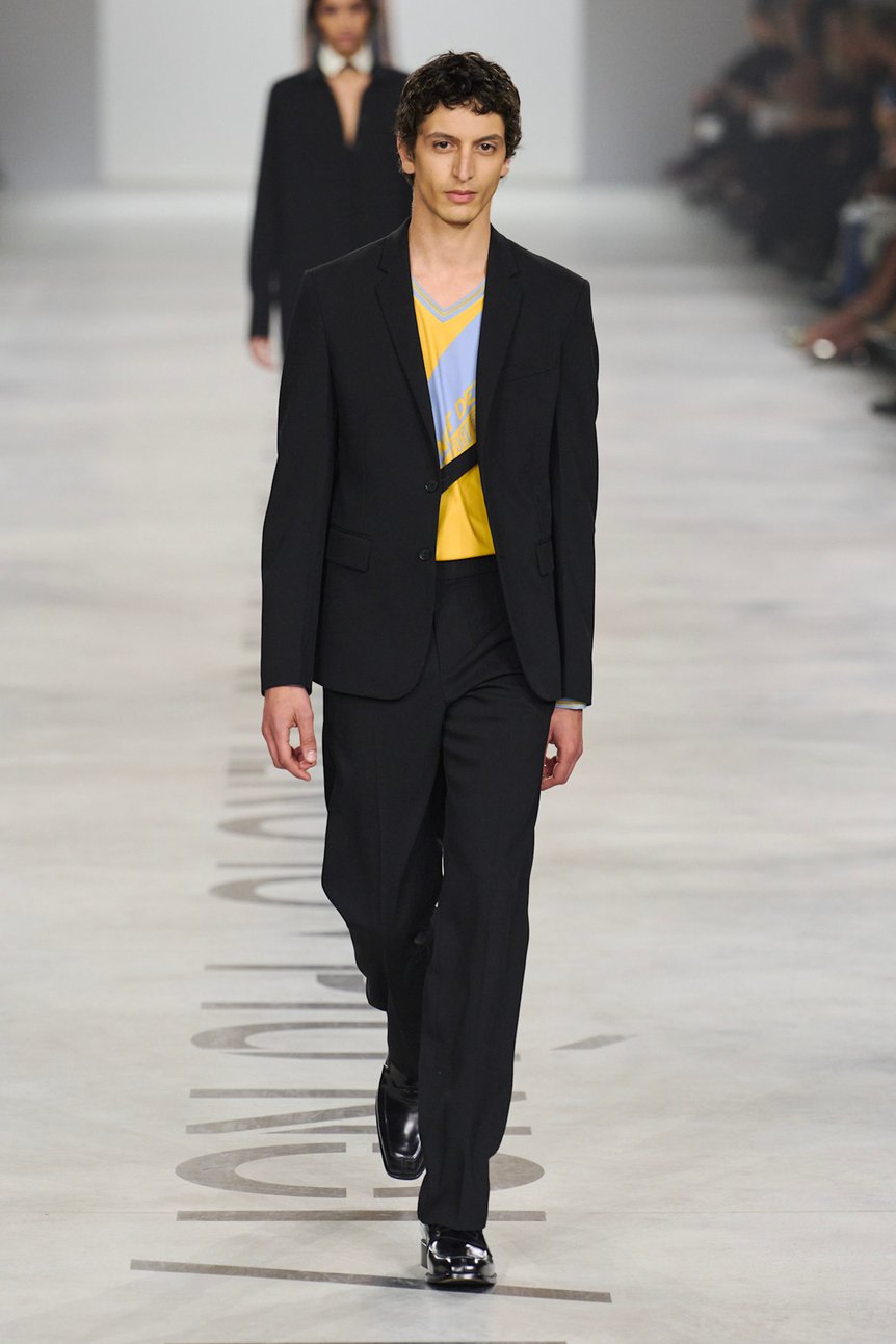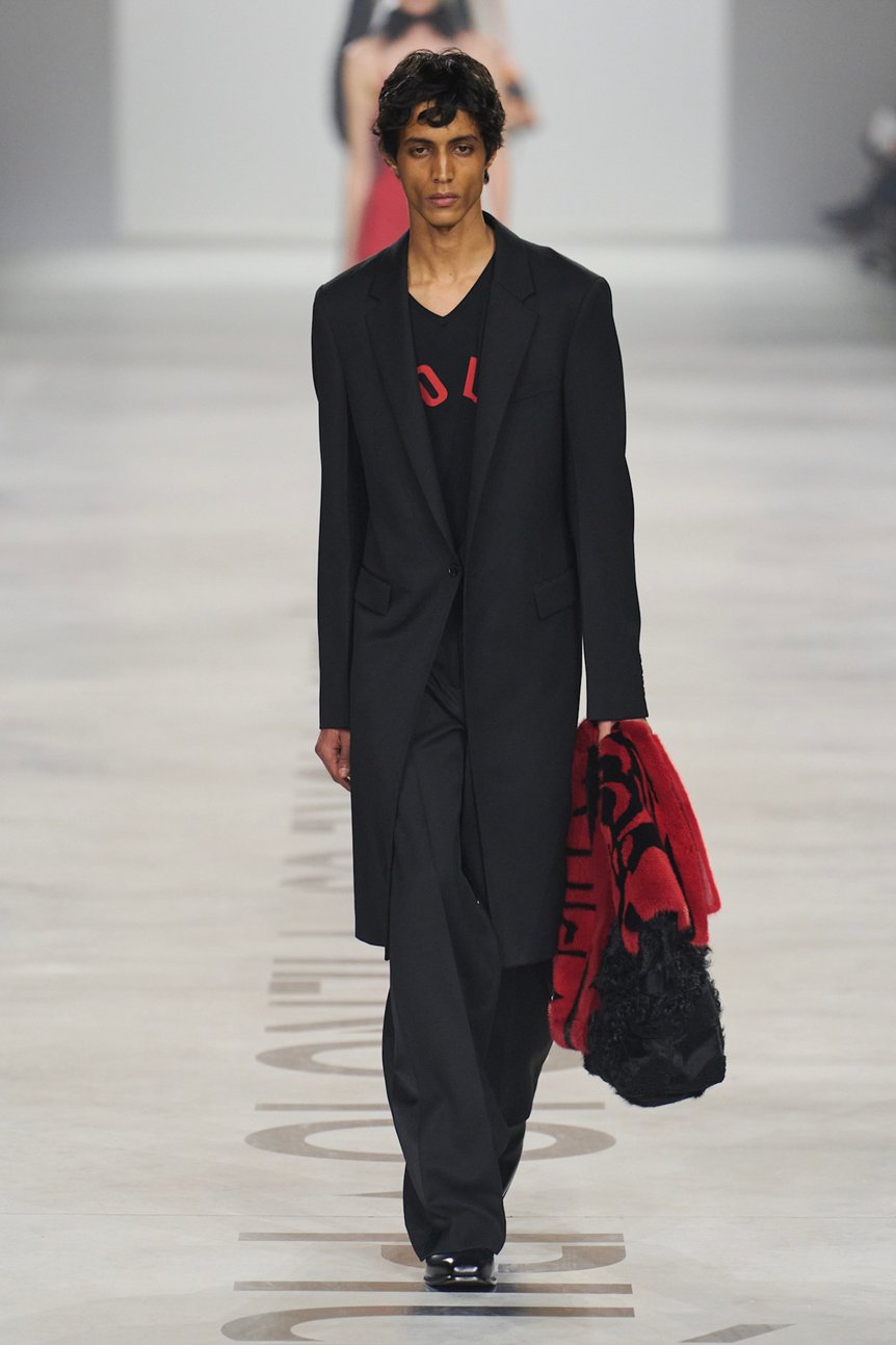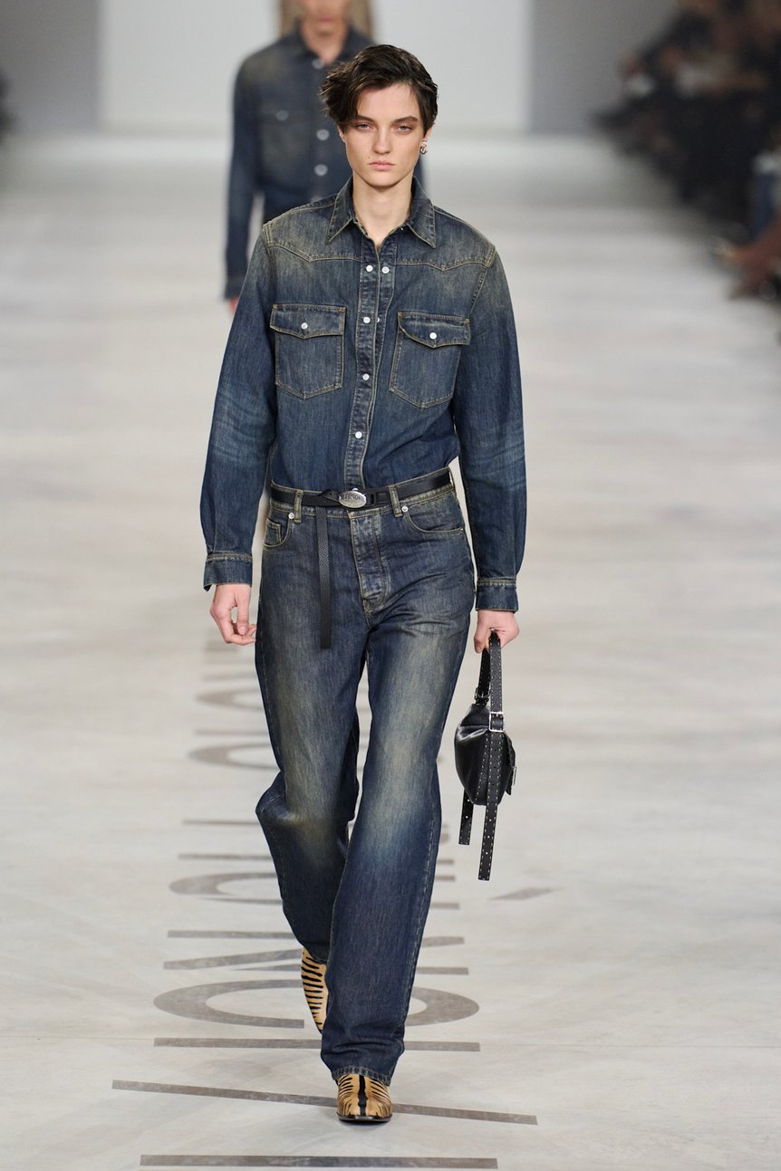 ジャケットとパンツを起点に「フェンディに明確なシルエットを与えること」に集中し、フェミニンとマスキュリンの概念を対立構造から「共有される資質」へと昇華させたという今シーズン。端正なテーラリングのタキシードやミニマルなジャンプスーツが構築的な規律を描き出す一方で、繊細なレースドレスやスパンコール、レーザーカットを施したレザーワンピースが衝動と欲望を可視化する。さらに、バイカージャケットやカーゴパンツ、ウエスタン調のデニムやサファリテイストのルックが躍動感を与え、ゼブラや虎柄、足元を飾る豹柄の靴が野生的なエレガンスを主張した。首元にはつけ襟チョーカーが添えられ、多様な要素が交錯するワードローブを見事に完成させている。