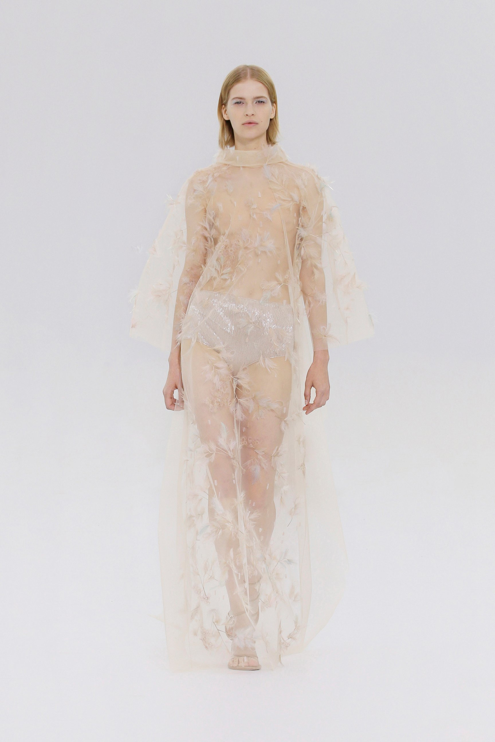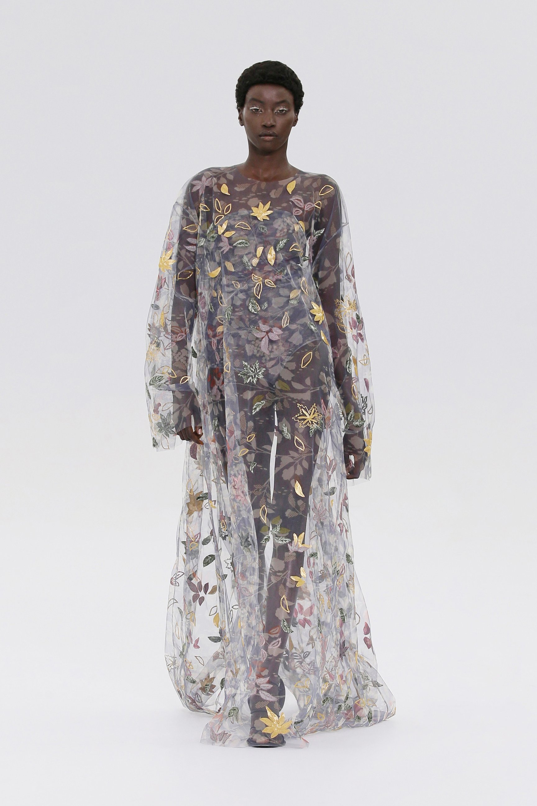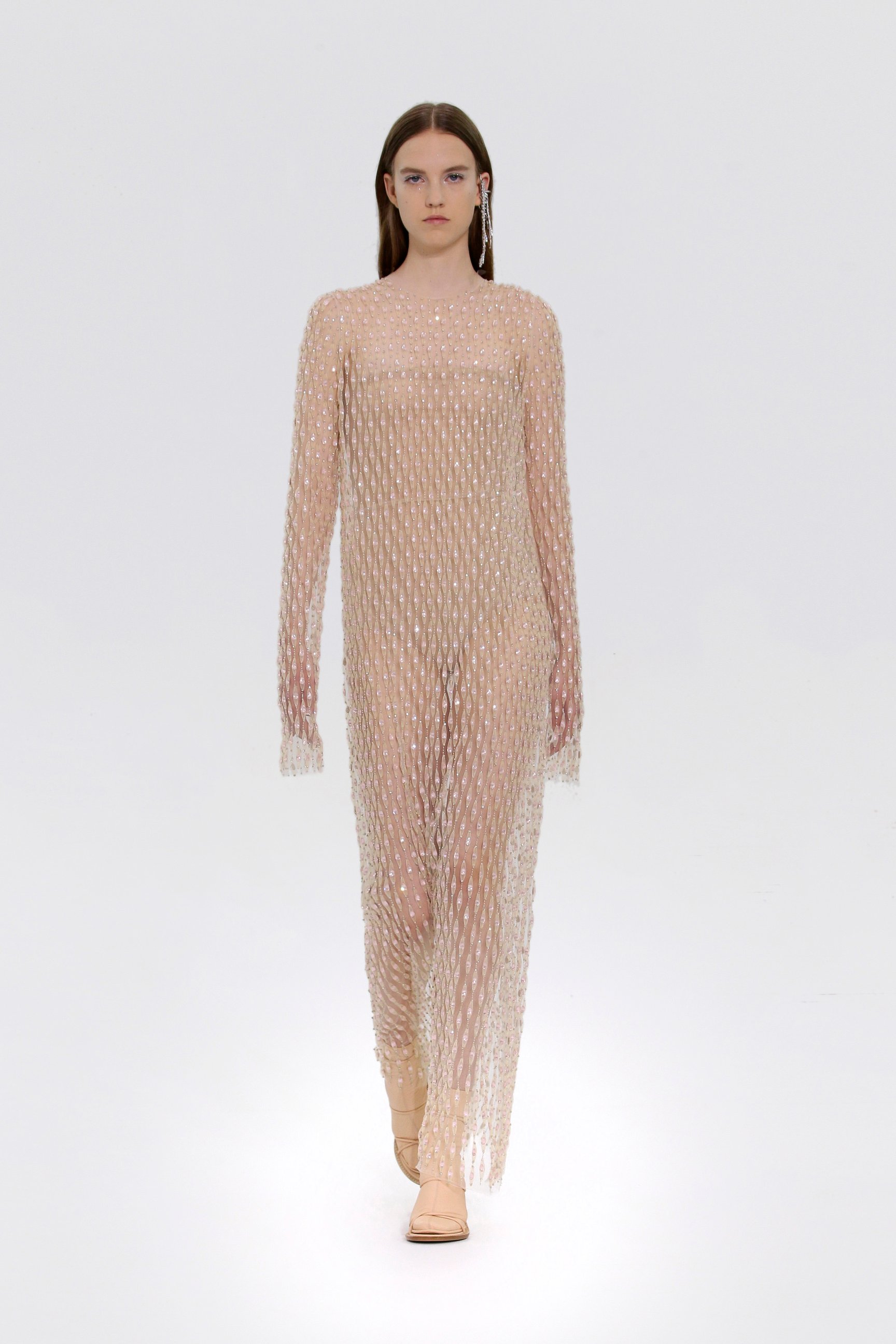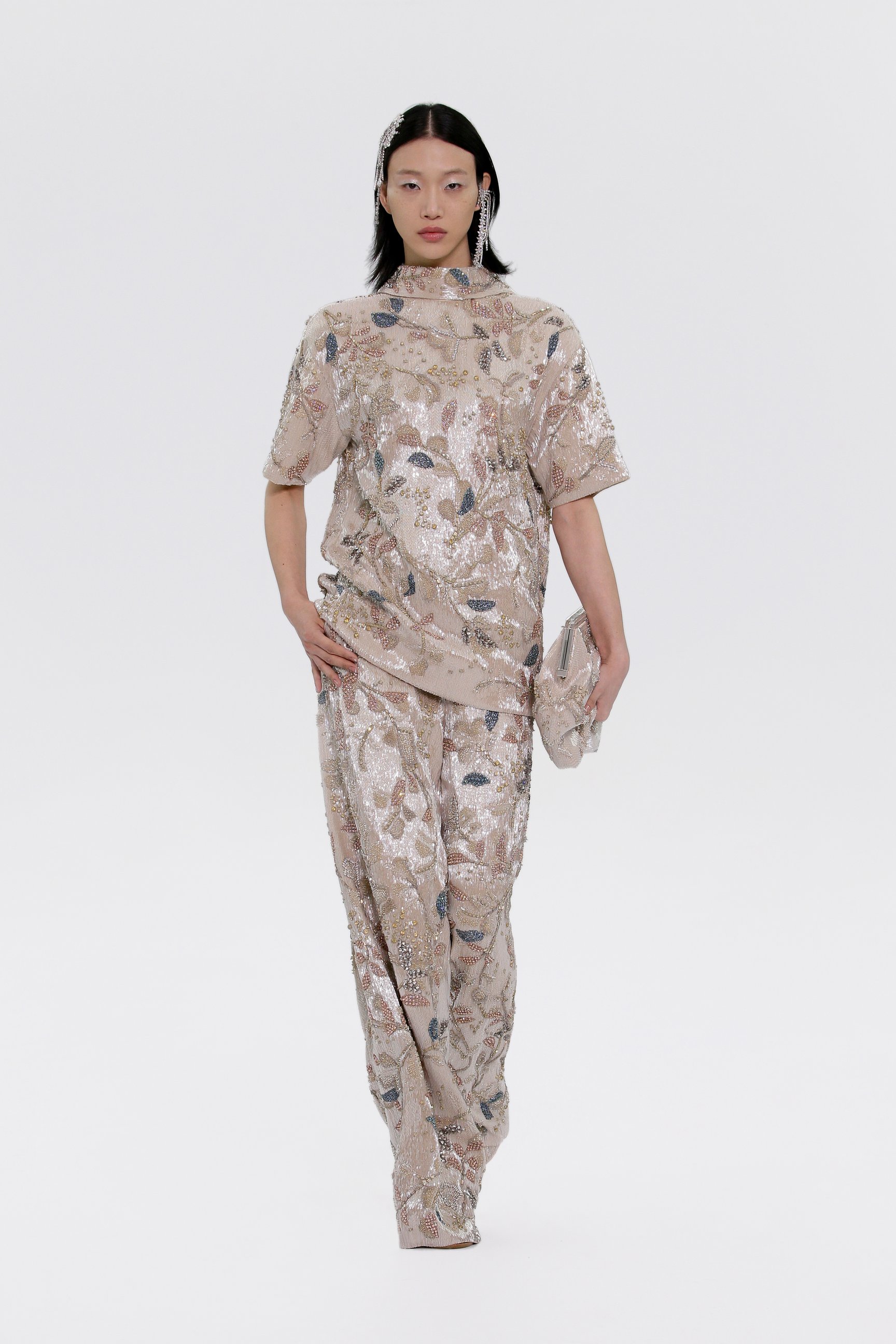 コレクションのキーワードは「パリンプセスト」。記された字句を消し、別の内容を上書きした羊皮紙の写本のことで、「反復され、透けて見える過去の断片が現在を作り上げ、未来へとさりげなく移り変わっていく」というコンセプトを反映している。ヌーディなカラーパレットやしなやかな素材は、羊皮紙そのものを思い起こさせた。