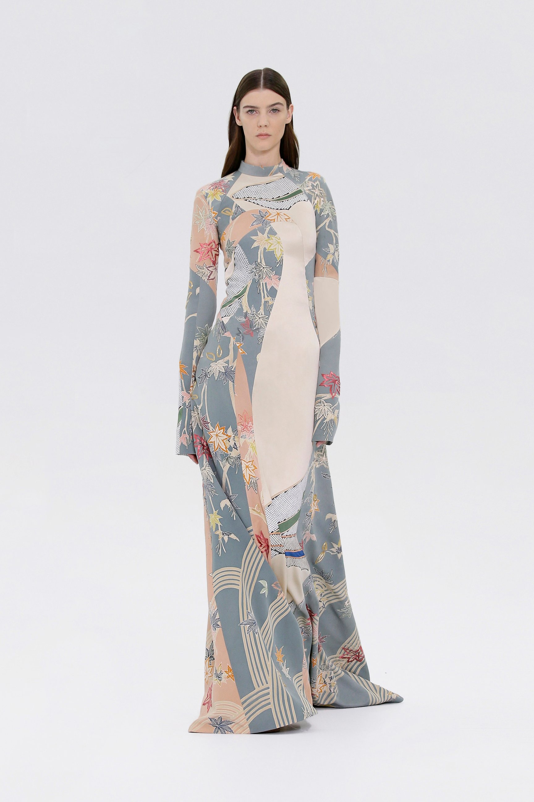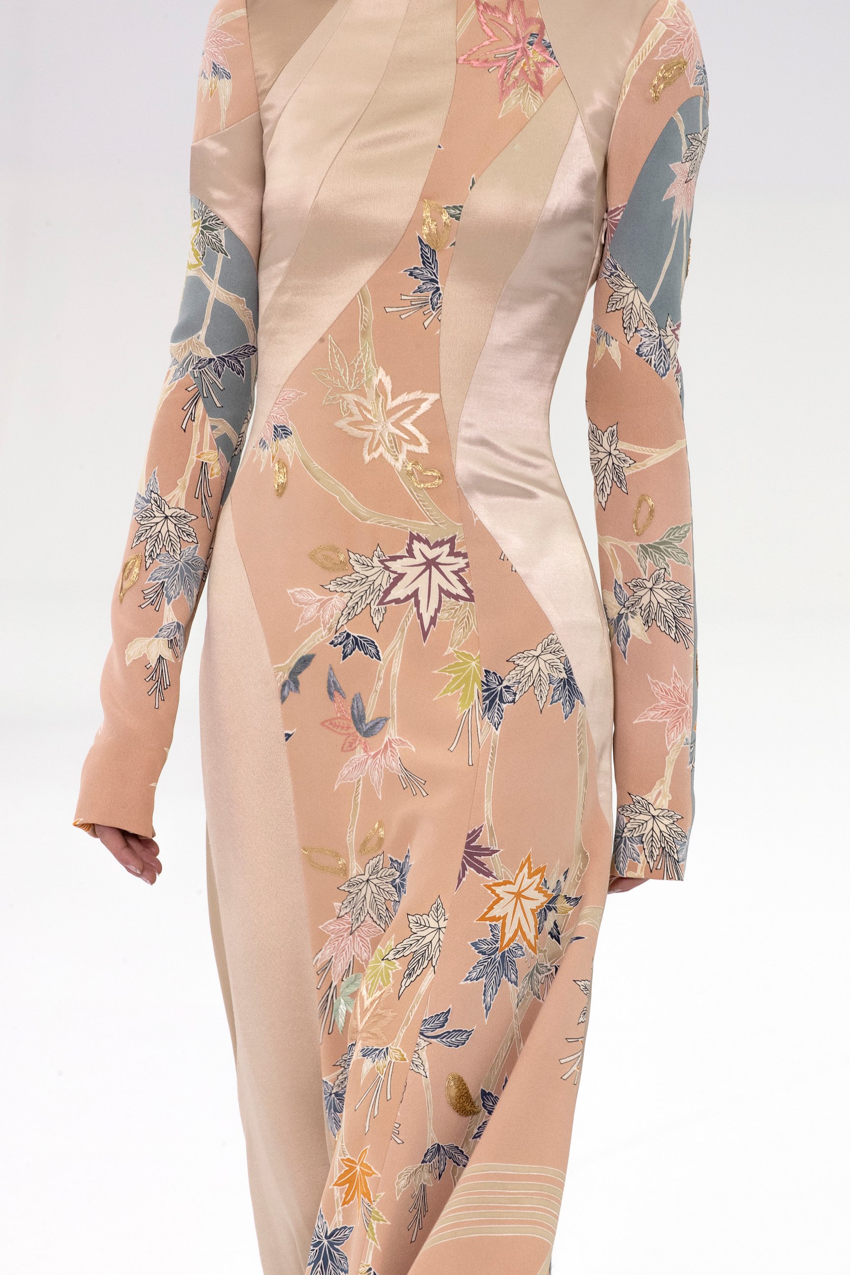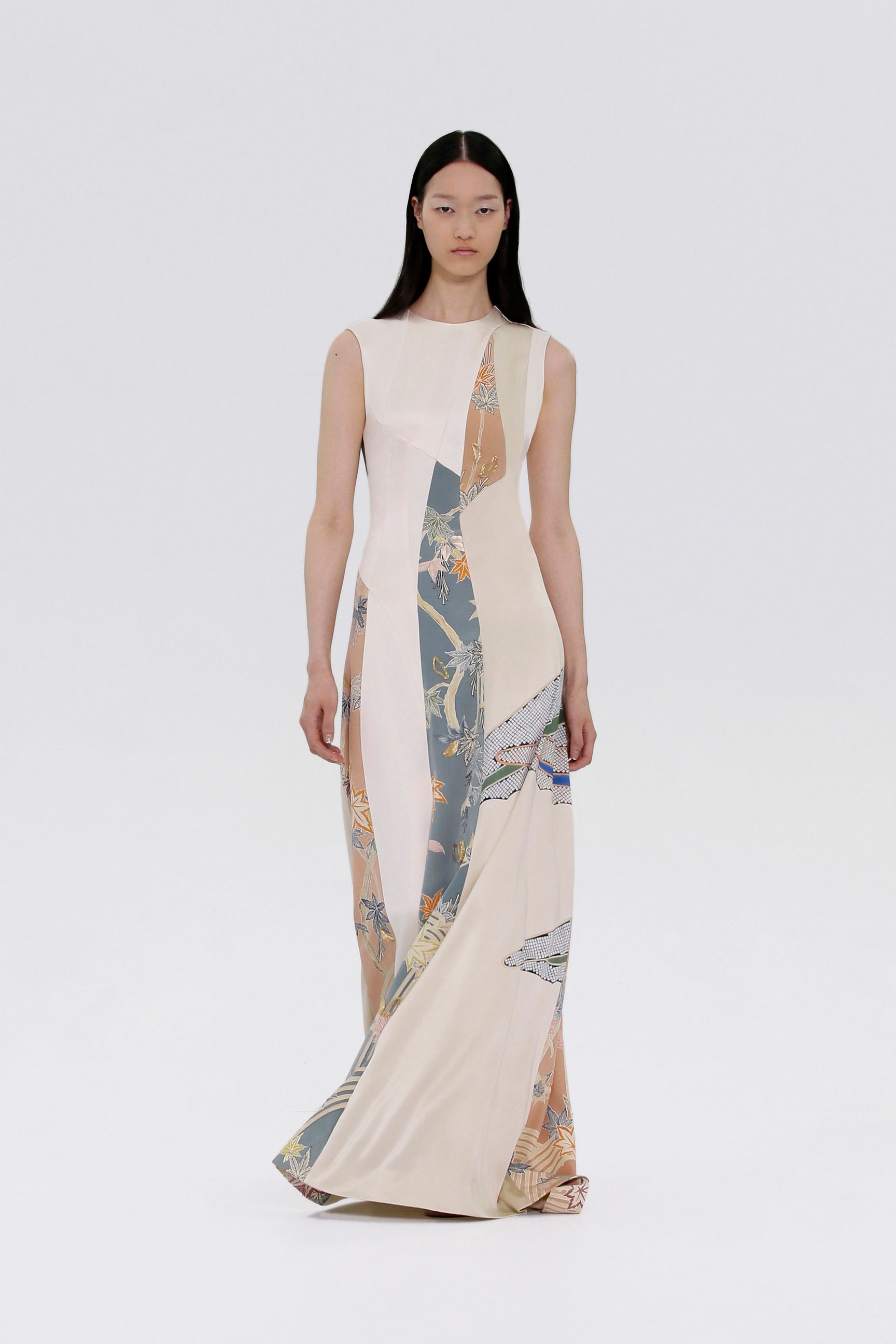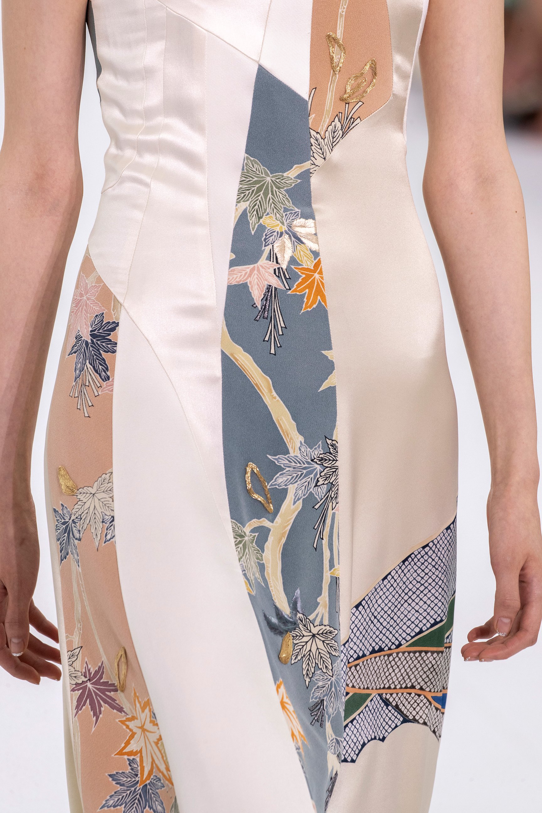 特に際立っていたのは、キム・ジョーンズもよく訪れている地で、コレクションの出発点になったという京都のリファレンス。現地で見つけた18世紀の着物の端布に再解釈を加え、伝統的な型友禅(型紙を用いる染織技法)を用いてテキスタイルを制作した。アシンメトリーで曲線を描くパッチワークによってしなやかに体を包み込む型友禅ドレスは、シックかつモダンに仕上がっている。
