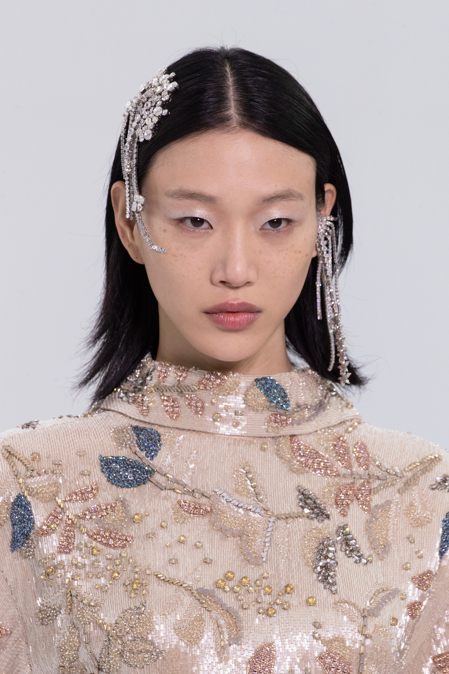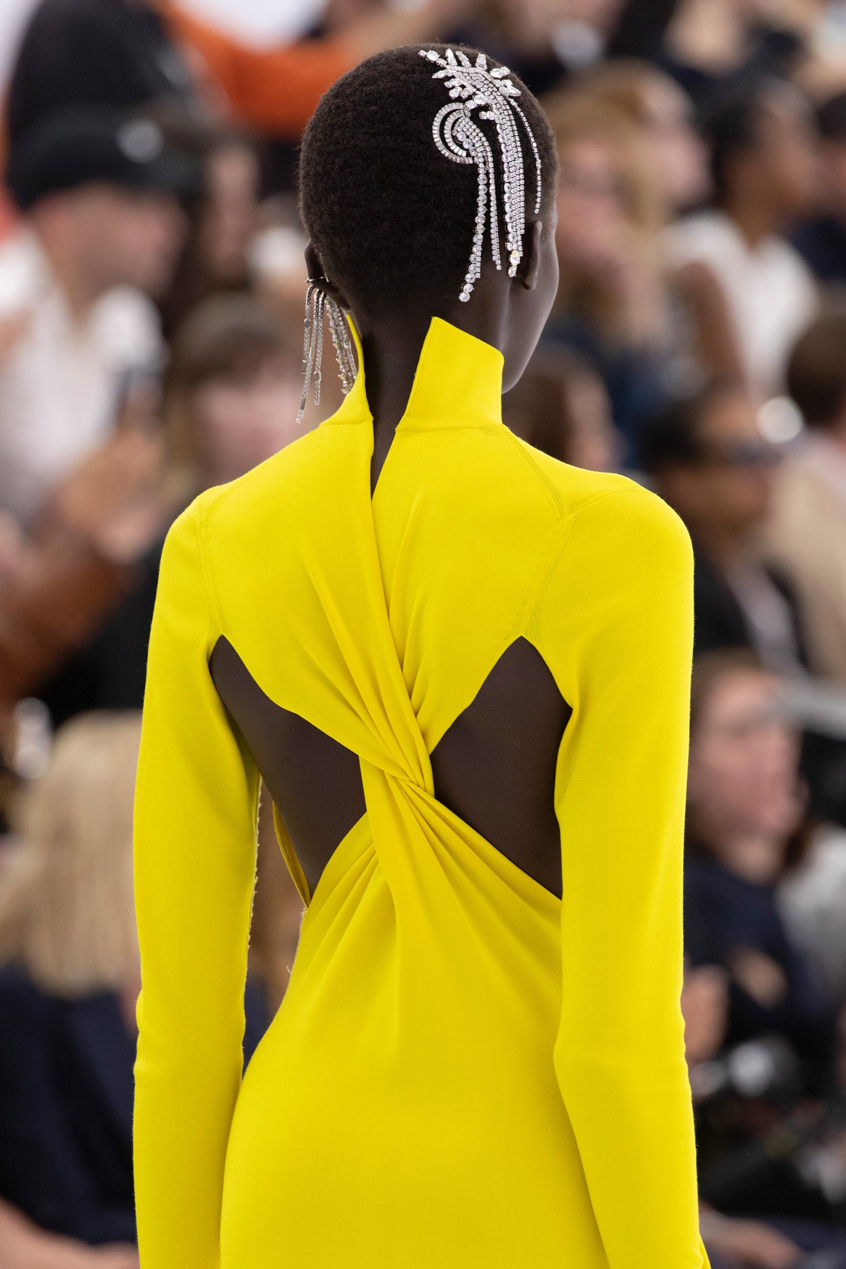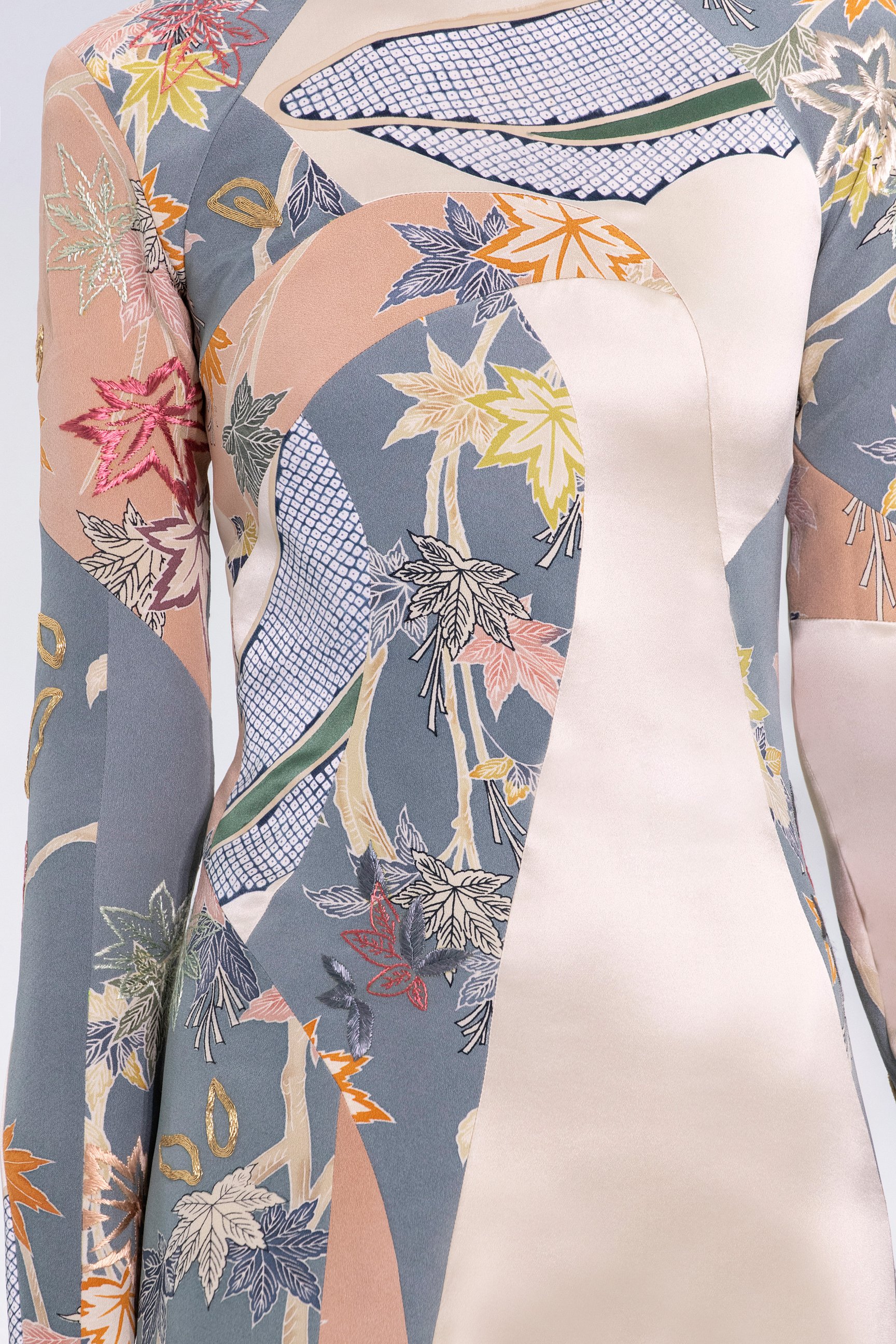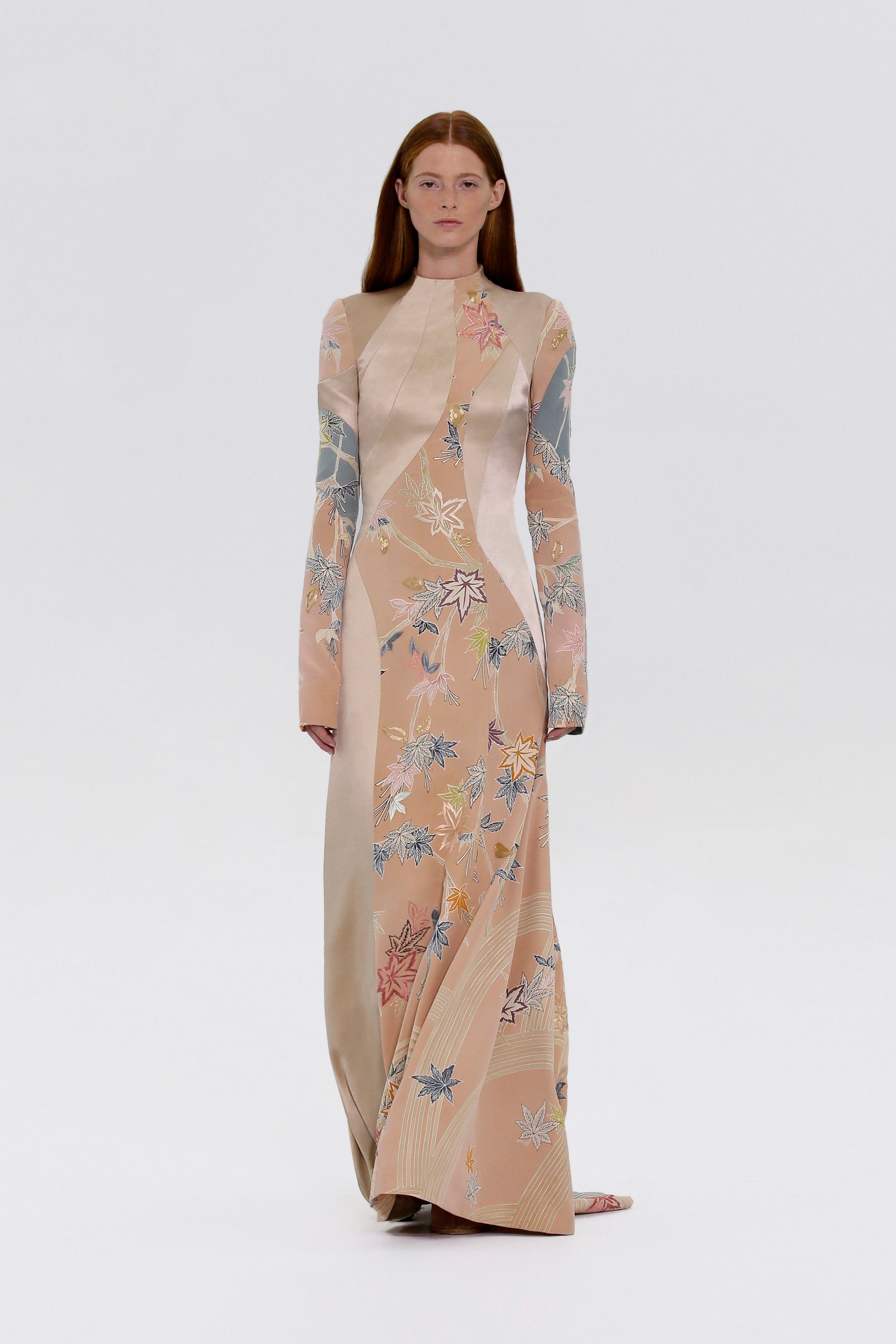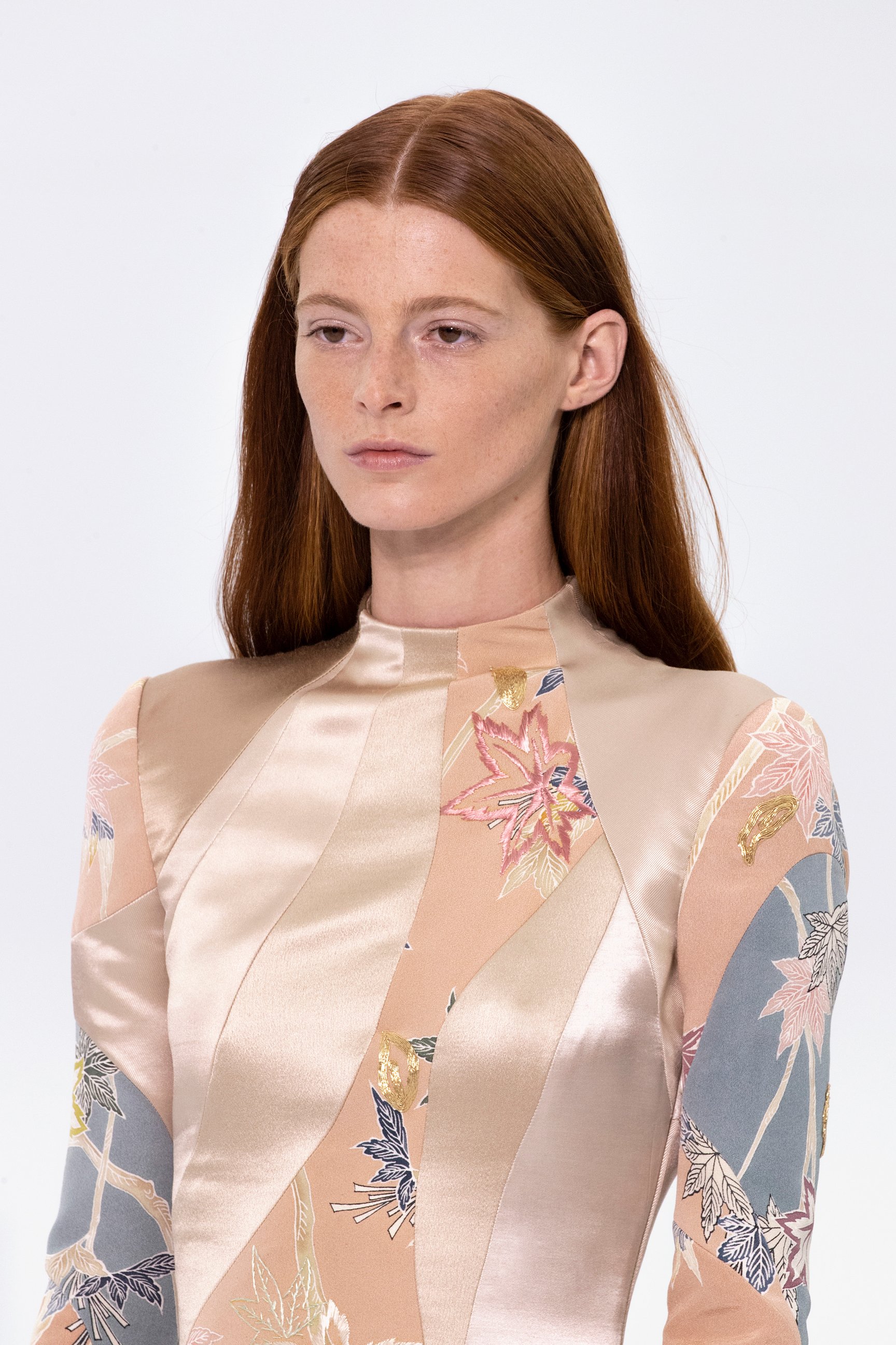 特に際立っていたのは、キム・ジョーンズもよく訪れている地で、コレクションの出発点になったという京都のリファレンス。現地で見つけた18世紀の着物の端布に再解釈を加え、伝統的な型友禅(型紙を用いる染織技法)を用いてテキスタイルを制作した。アシンメトリーで曲線を描くパッチワークによってしなやかに体を包み込む型友禅ドレスは、シックかつモダンに仕上がっている。