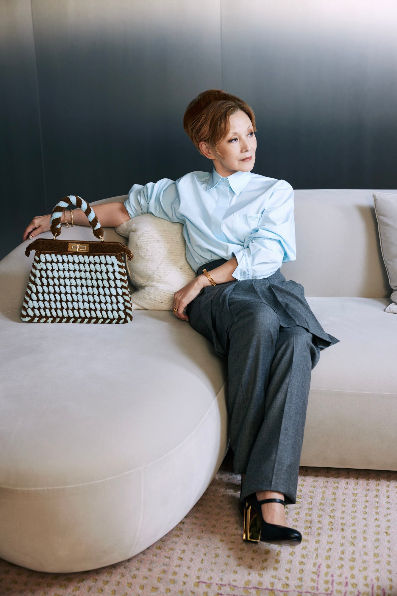 夏木:常に今を表現したい。フェンディというブランドが約100年続いているのも「今」を積み重ねた結晶だと思うし、今を積み重ねる過程で生まれたのが「ピーカブー」なんじゃないかな。私たちも、「今」を見ていただく作品になれば良いなと思って演じるじゃない。例えば、過去既に誰かがやった役を自分が演じることになった時って、荷が重いと感じるかもしれないけど「今、その役を頂いたんだから、2023年の夏木マリが考えるこの役でいいじゃん」と割り切らなければならない。そうすれば、たとえ過去に誰かが同じ役を演じていたとしても、私のインテリジェンスがその役には宿るものなんです。今の自分が感じることを、見ていただく皆さんに共有するつもりでいれば、長く愛される作品になりえるんじゃないかな。
