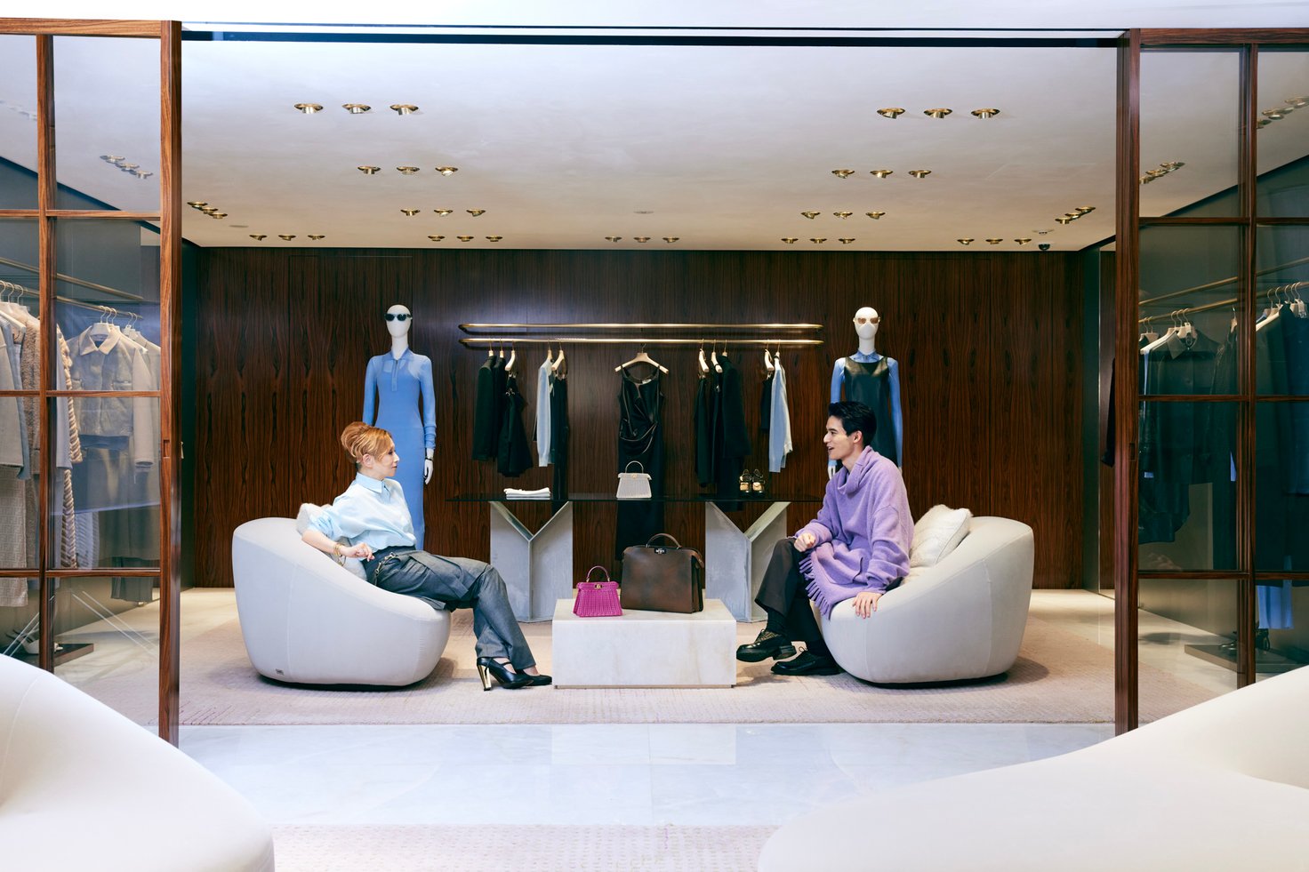 舞台は、今年2月にフェンディの世界観を体現する旗艦店としてオープンした 「パラッツォ フェンディ 表参道」。久しぶりの再会を果たした2人。会っていない時間を埋めるかのように自然と会話に花が咲き、最新コレクションに囲まれた空間で対談が始まった。