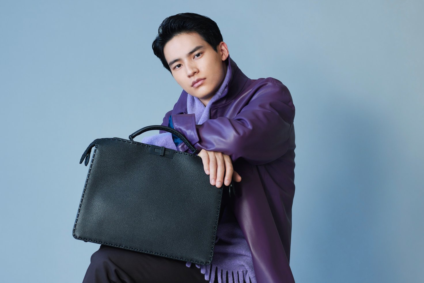 水上恒司着用アイテム、バッグアクセサリー 17万3800円、ジャケット 104万7200円、ニット 23万1000円、パンツ 11万5500円、シューズ 15万700円、/すべてFENDI(フェンディ ジャパン) *価格はすべて税込価格