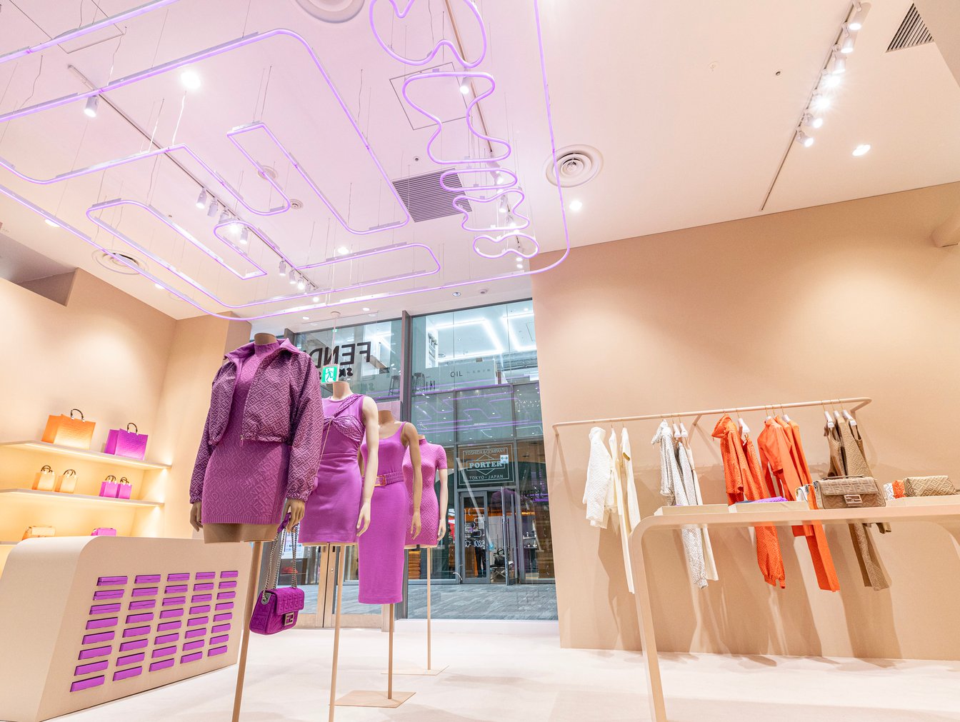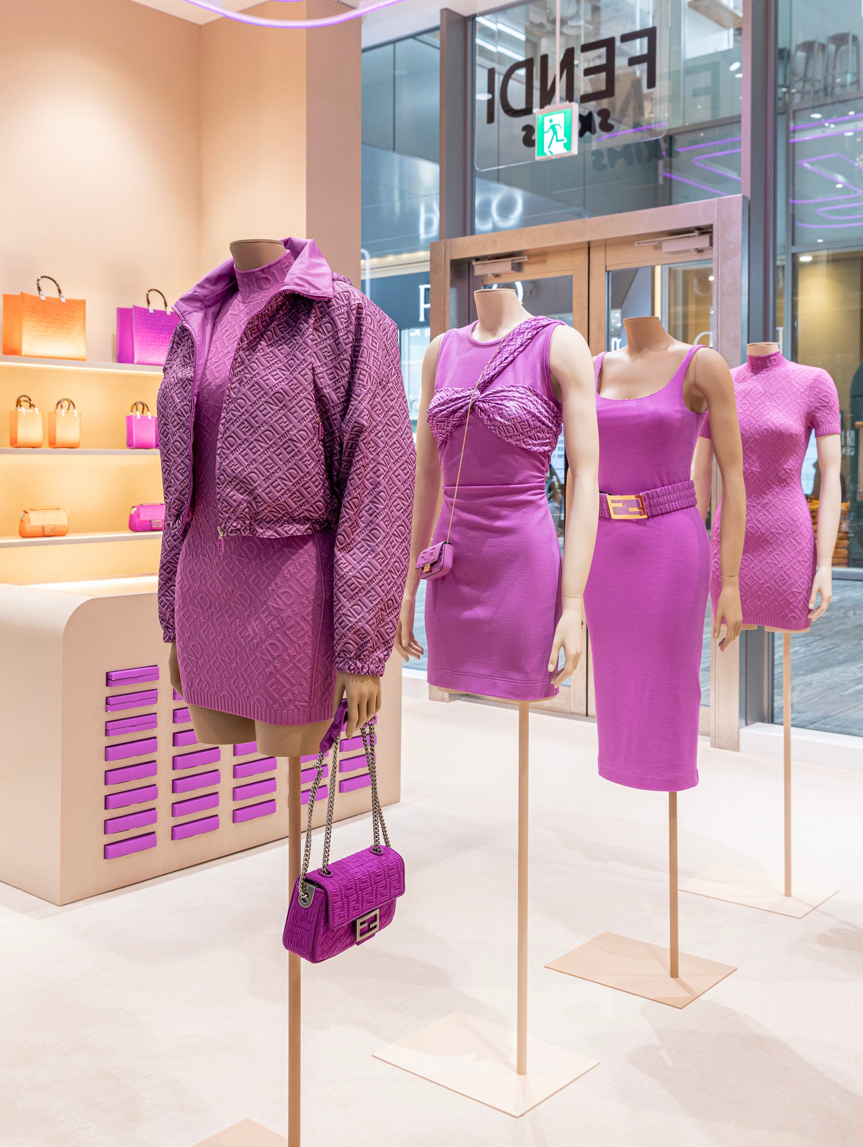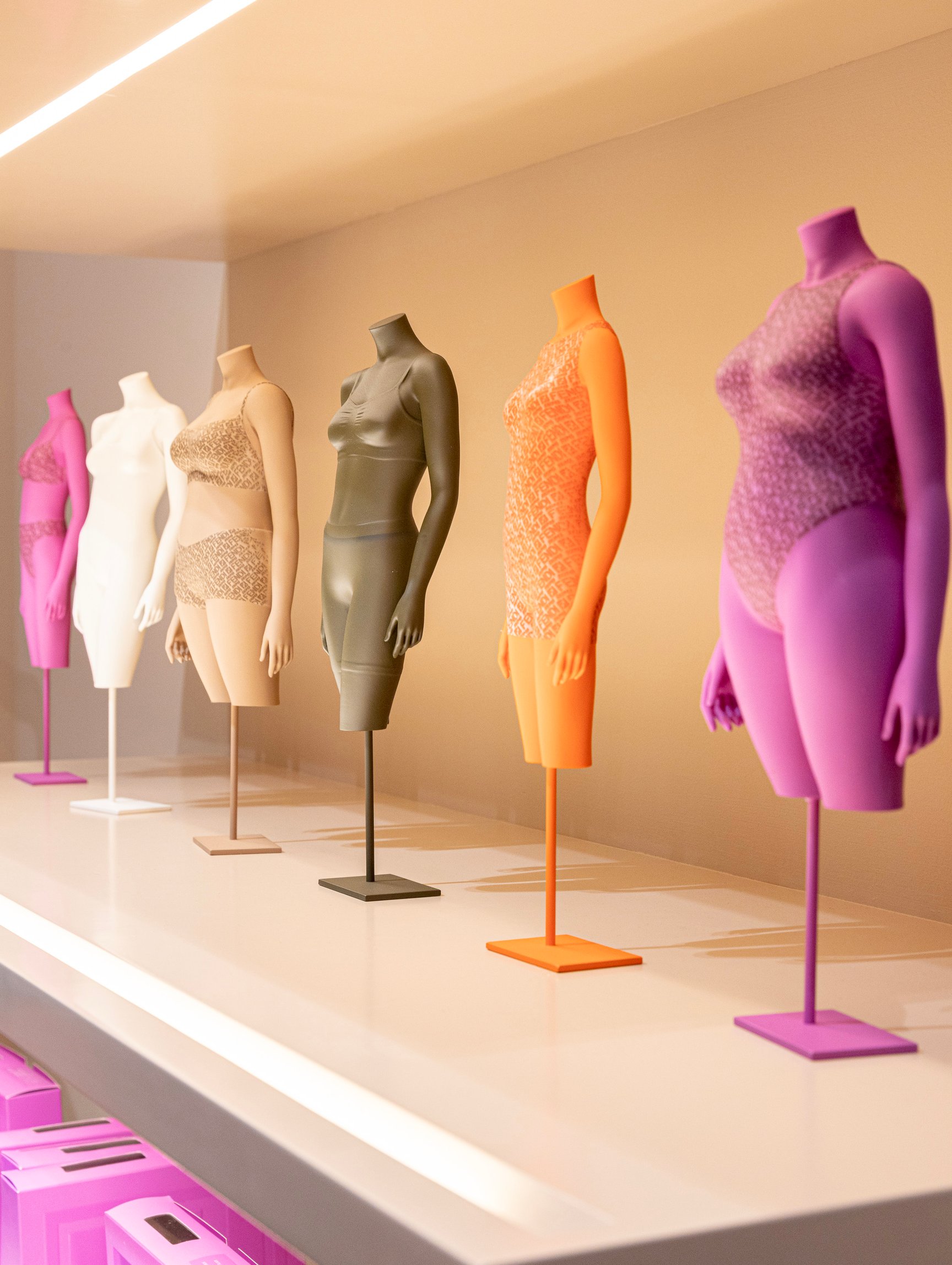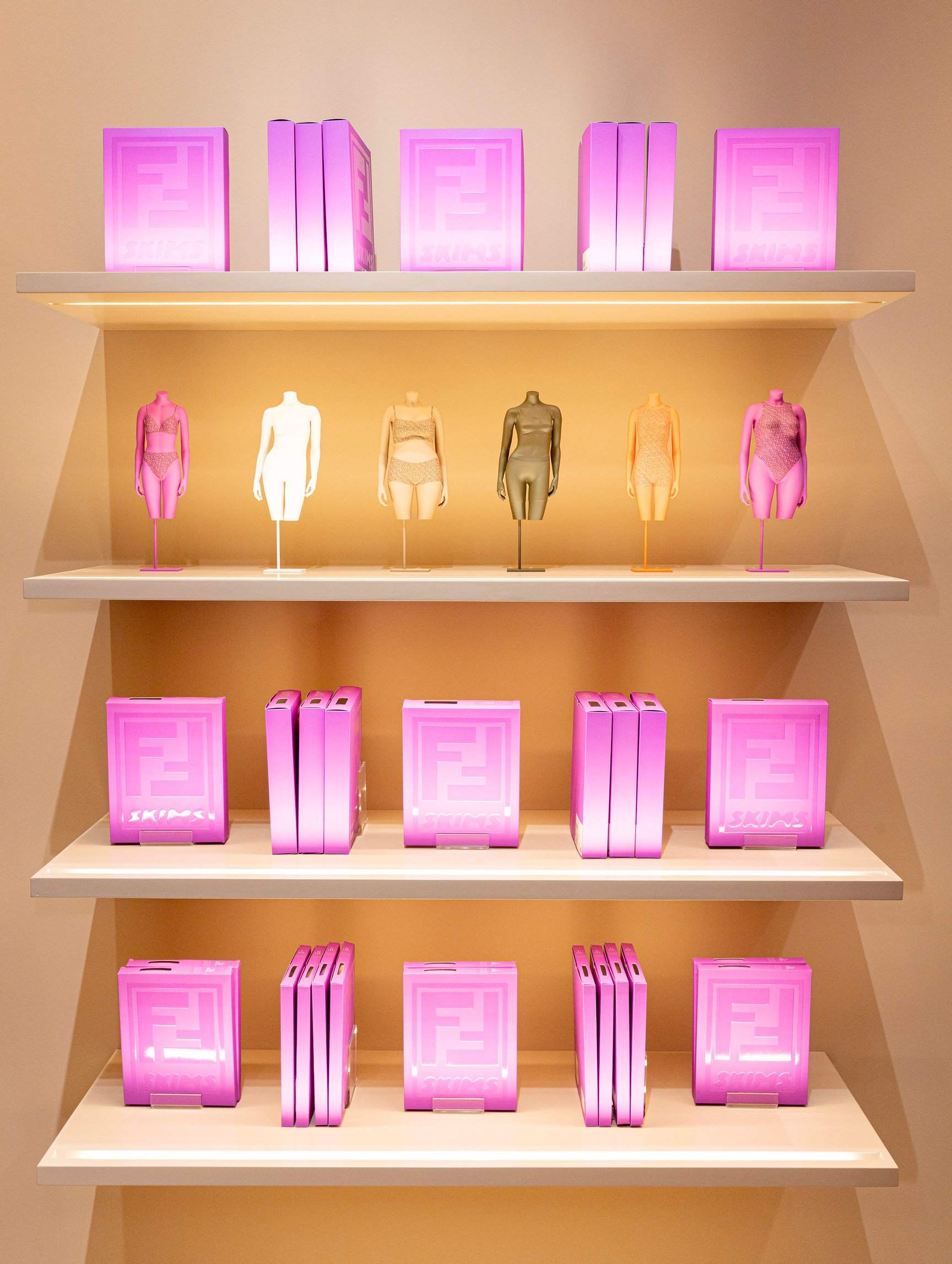 店内のマネキンをよく見ると、肌の色や体格が違っていたり、ミニチュアサイズのマネキンも様々な体型だったりと、スキムスのブランド精神が反映された空間に。会期は11月15日まで。(9日〜全国のフェンディ直営店およびFendi x Skims 特設サイトで展開)