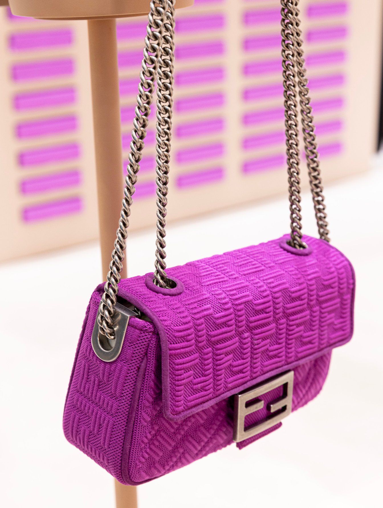 そしてコレクションとも連動するカラーリングのバッグやシューズのアクセサリーもお見逃しなく。スポーティーなファブリックで登場するフェンディのアイコンバッグ「バゲット」の新作「バゲット チェーン」や「サンシャイン ショッパー」、そして足元のポイントとなるシアリングサンダルなどは、思わずウェアとマッチングさせたくなるほど。