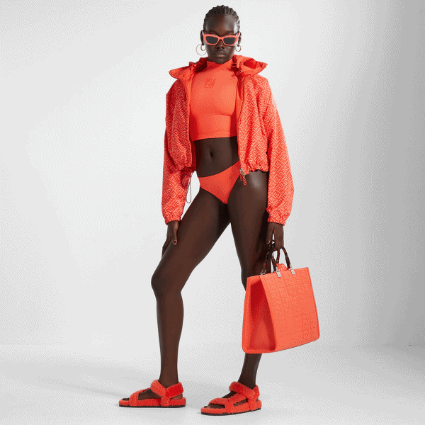 カラーとダブルネームのロゴパターンが特徴の「フェンディ×スキムス」。シェードカラーが多い普段のスキムスとは一味違い、スタイリングにアクセントを加えてくれそうなポップなピンクやオレンジ、そしてデイリーで使えそうなブラック、ホワイト、カーキ、ヌードなどのラインナップが揃います。体にぴったりとフィットするボディコンシャスなアイテムの数々は、一枚でグラマラスに着ても、服の下にインナーとして着ても、スキムスのパワフルなDNAとフェンディの持つエレガンスの融合を感じられるはず。