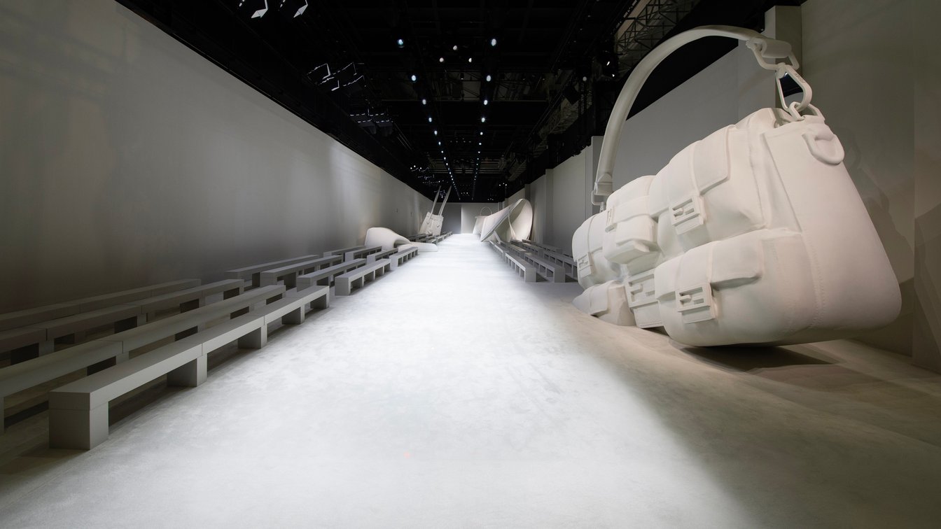 白を基調とした会場には、「あなたはどのバッグを選ぶ?」と言わんばかりに、フェンディの代表的なバッグを模した巨大なオブジェを設置。「ピーカブー」や「バゲット」「フェンディ オリガミ」「フェンディ ファースト」といった個性の異なるアイコンバッグに加え、今シーズンは新作「フリップ」も登場した。金具などを使わないシンプルな構造ながら、面を折り畳むことでクラッチバッグとしても使え、面によって異なるカラーを配し、マチをつけることでフラットであるトートバックを立体的に表現している。