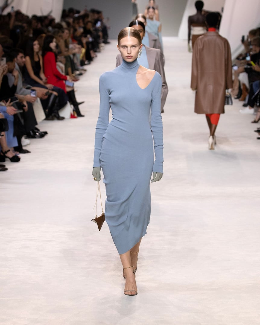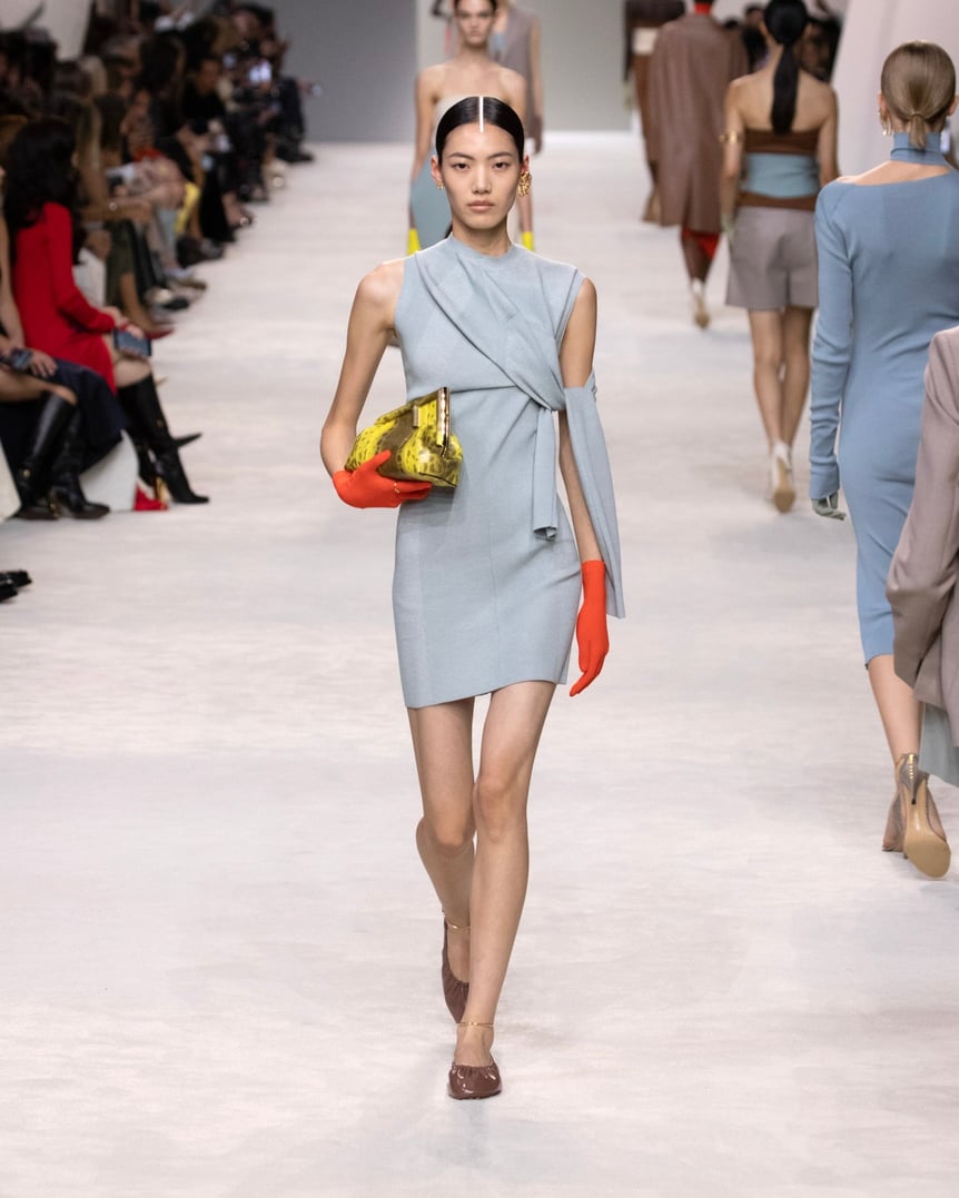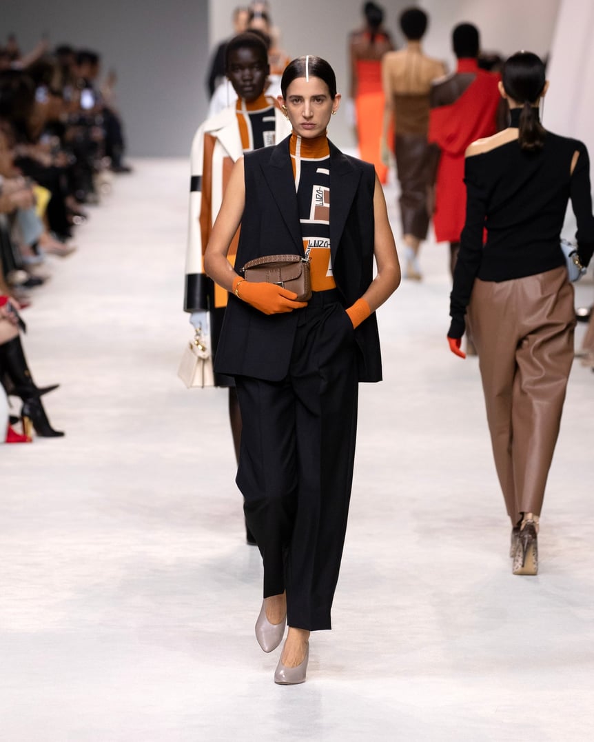 また、メゾンの繰り返されるコードやモチーフも随所に取り入れられ、現代のフェンディウーマンを構築。職人技が光る「セレリア」ステッチはバッグのみならず、ボトムスのウエスト部分や、アンクレット付きシューズの後ろの踵部分、デルフィナ・フェンディによるジュエリーにも取り入れられ、コレクションの全てのカテゴリを結びつけるキーモチーフとして採用された。