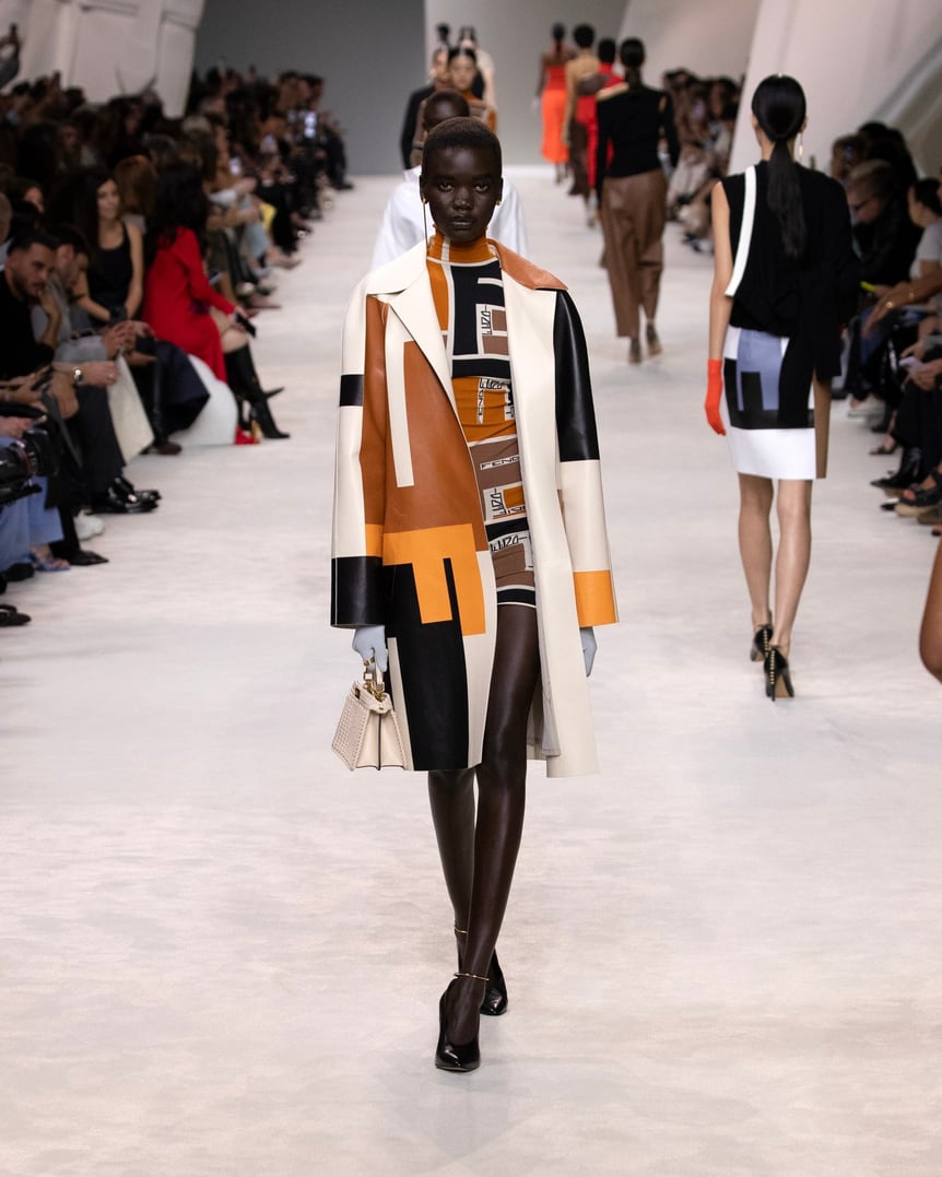 カール・ラガーフェルドが手掛けた1999年春夏コレクションから引用されたダブルFのプリントや、抽象的なカラーブロックは、レザーに施されたほか、帯のようにパネルデザインされ、ペールブルー、ブラウン、オレンジといったコレクションのカラーパレットを表現する上で効果的に用いられた。