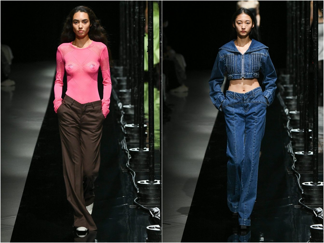 舟山の鈴木へのリスペクトはもちろんデザインにも落とされている。彼女が活躍した1970年代のエッセンスが取り入れられた、フレアシルエットのジーンズやスカート、ペイズリー柄のジャカードブラウス、ヒッピーエッセンスを感じるサイケデリックなネオングリーンやピンクを用いたボディースーツ、女優帽を想起させる鍔の大きなハットなどが登場。中でも、深いVカットが印象的なノーカラージャケットのセットアップは鈴木が着用していたドレスからヒントを得たという。ランウェイには、ブランド初のシューズも登場。スクエアトゥが印象的なプラットフォームシューズとフラットシューズ2型が披露された。