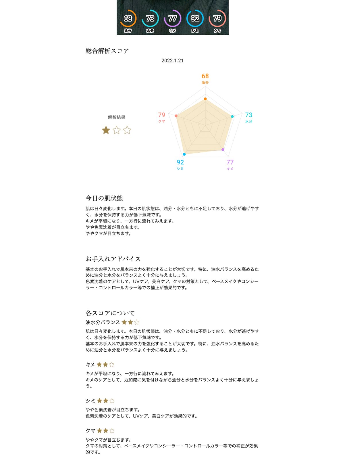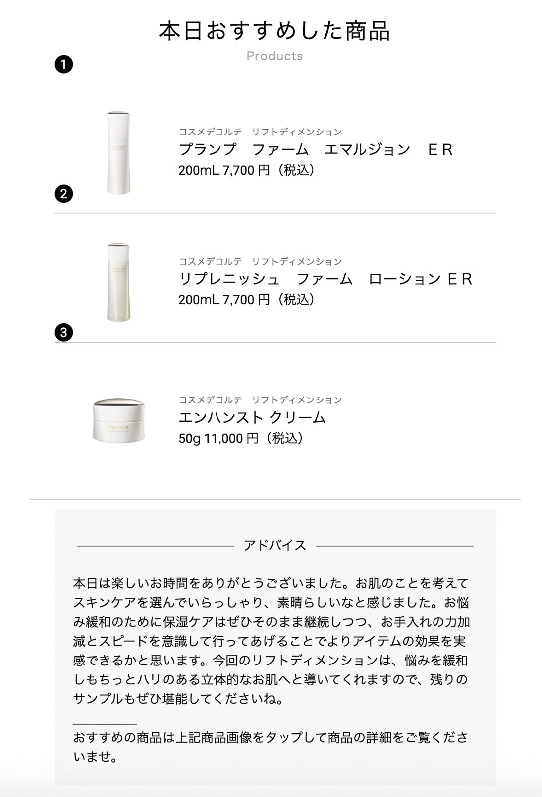 終了してから数分後にはスキンアナライザーの解析結果、おすすめの商品リスト、カウンセリング内容を踏まえたお手入れのアドバイスがデジタルカルテとして送られてきます。