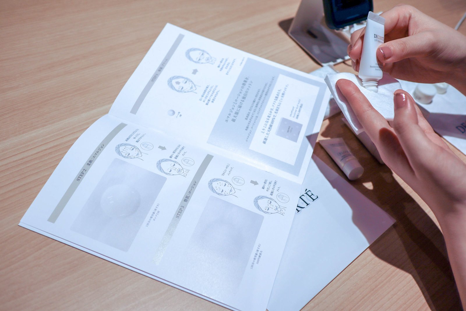 MIKI:では早速、一緒にスキンケアをしていきましょう。今回はすでにすっぴんの状態でご参加いただいているので、クレンジング・洗顔後からお伝えしていきます。今回キットをお送りした「リフトディメンション」は、ハリや弾力にアプローチするエイジングケアラインで、コスメデコルテの中でも代表的なラインの一つ。洗顔後はまず乳液から塗ることで、肌を柔らげ、弾力感を与えることで化粧水のなじみをサポートしてくれるんです。