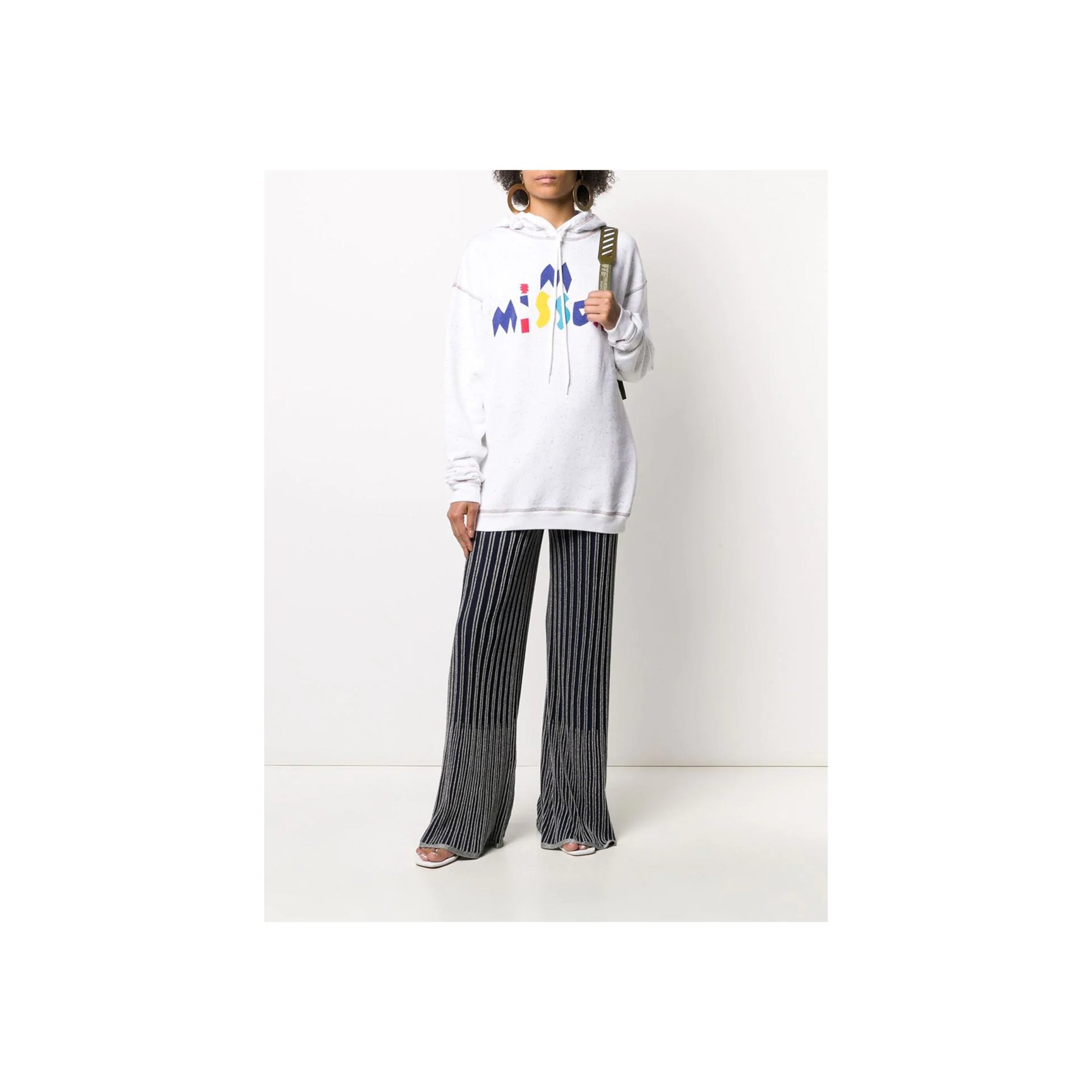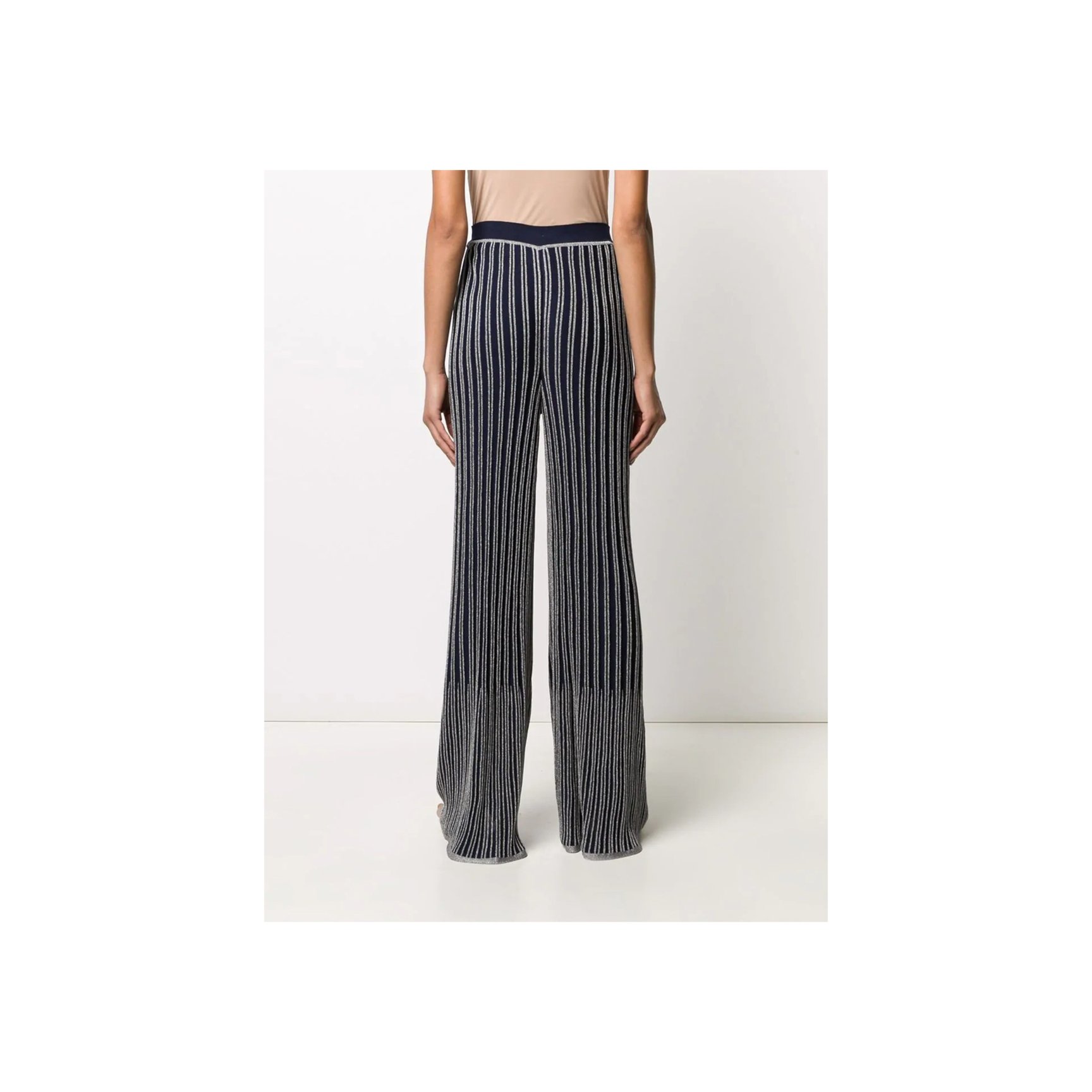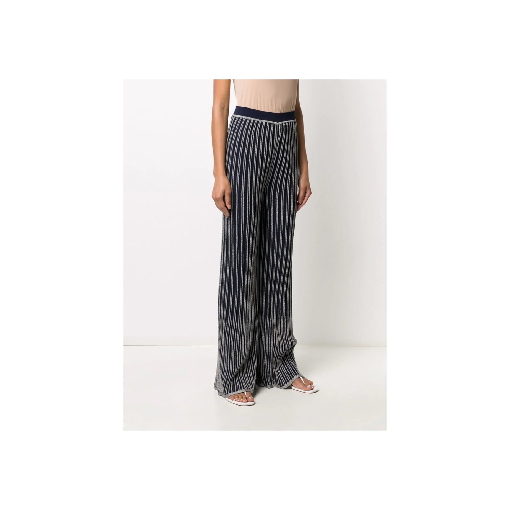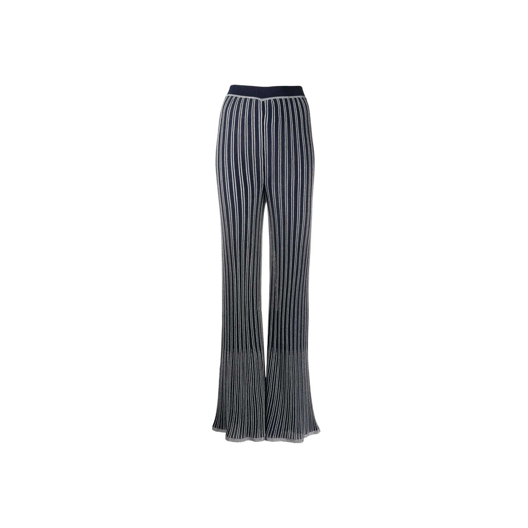 「エム・ミッソーニ(M Missoni)」のフレアパンツは、ゆったりと履けてこなれ感を演出できます。ネイビーに映えるシルバーメタリックのラインが個性をアピール。ストライプで脚長効果も期待できそう。