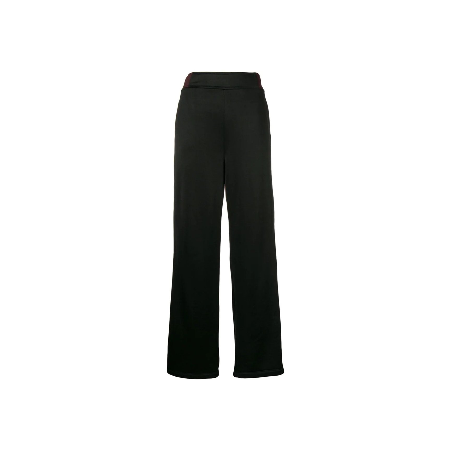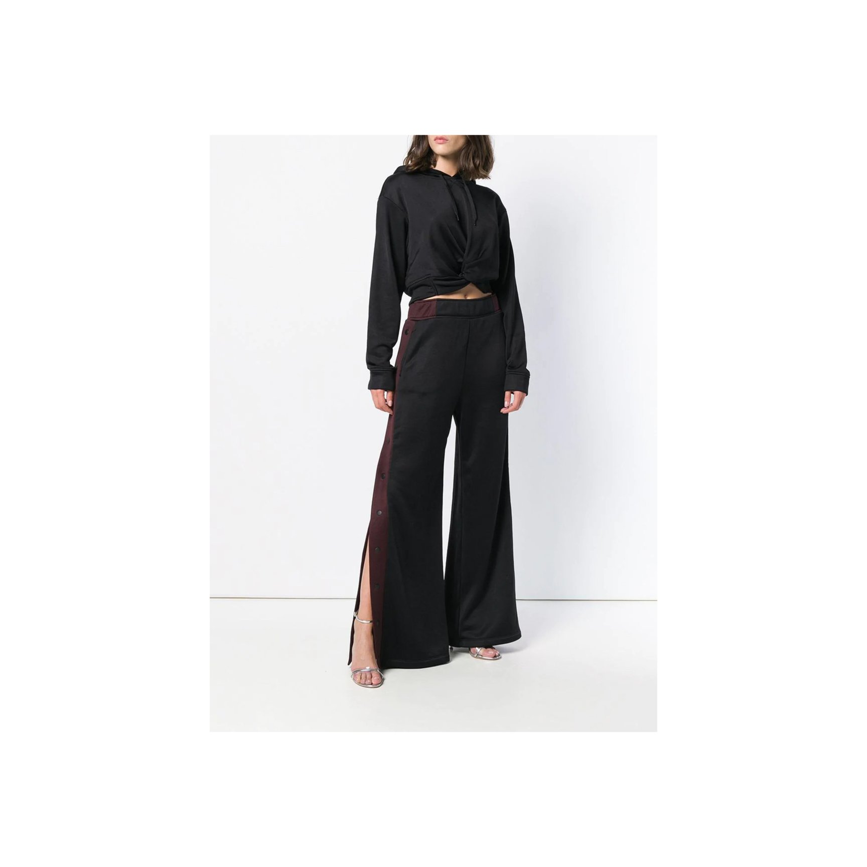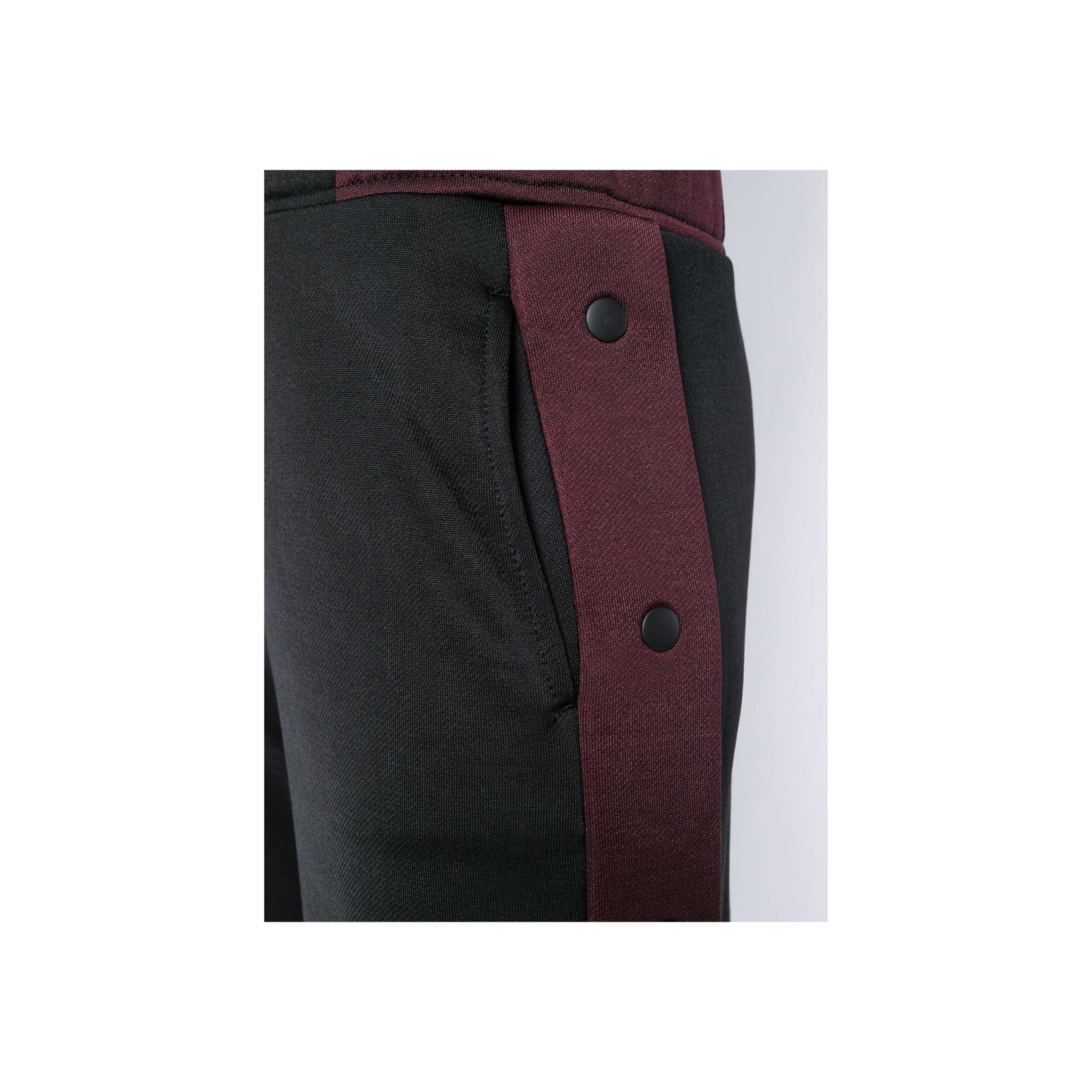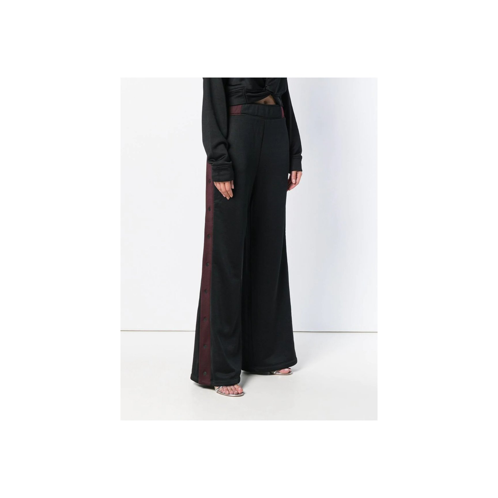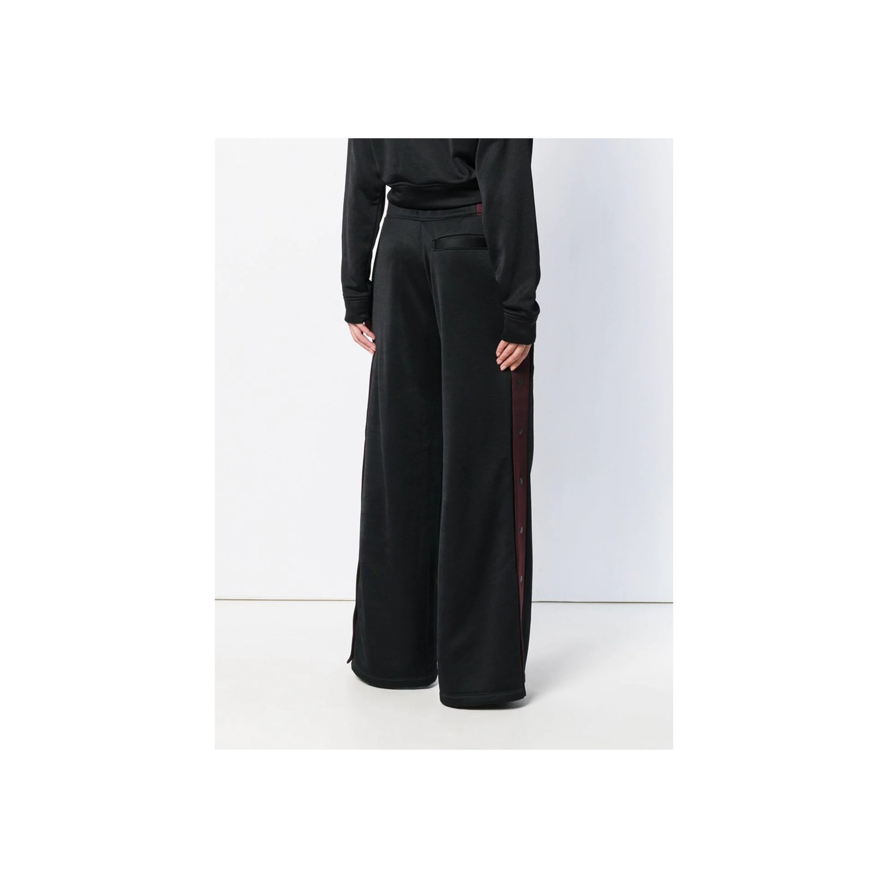 「T by アレキサンダーワン(T by ALEXANDER WANG)」のブラックパンツ。ボルドーカラーのサイドストライプはスナップボタン仕様で、開閉が可能。サイドスリットパンツにして、ヘルシーな肌見せに挑戦してみるのも。