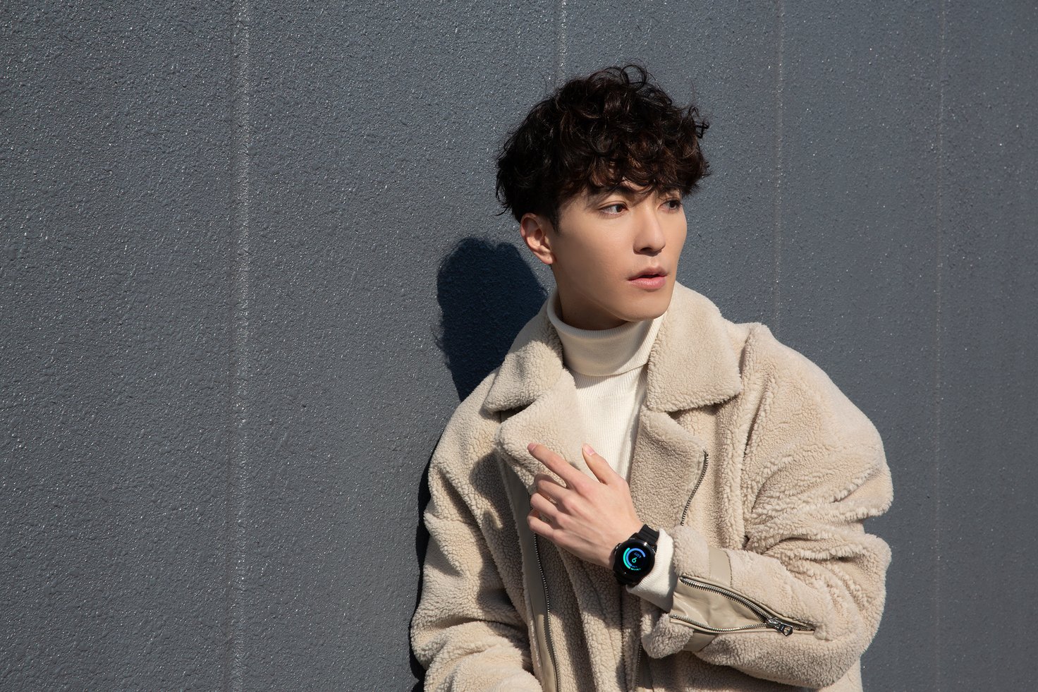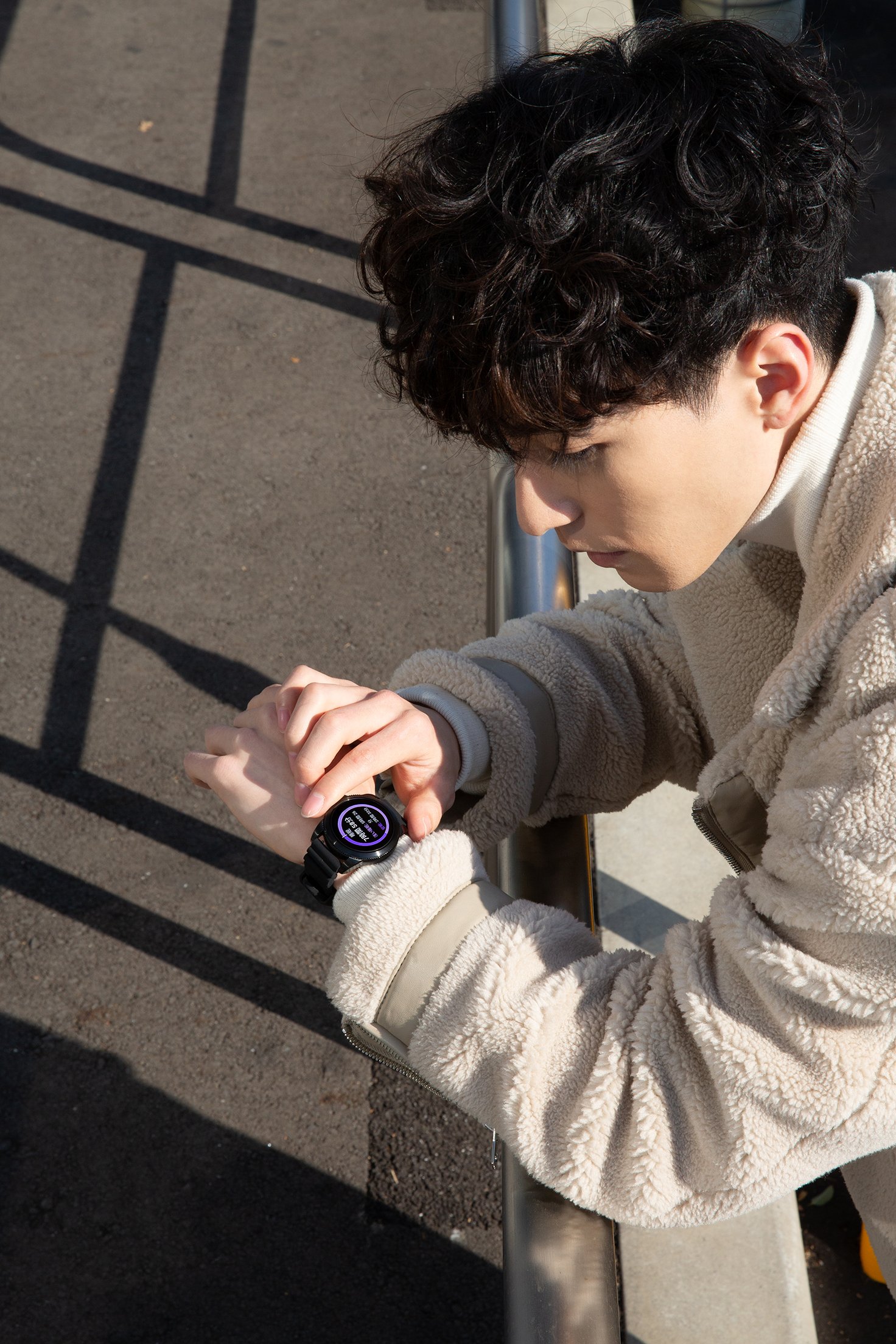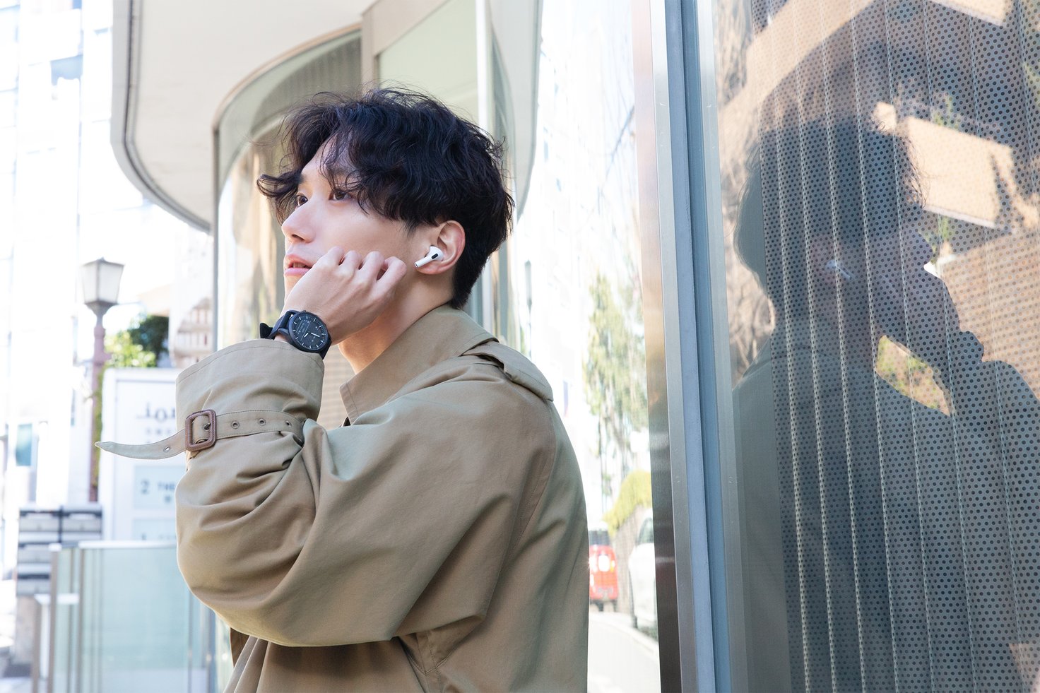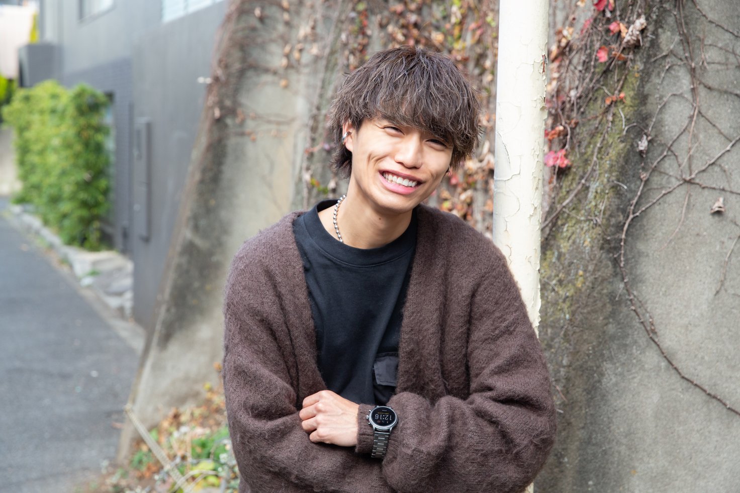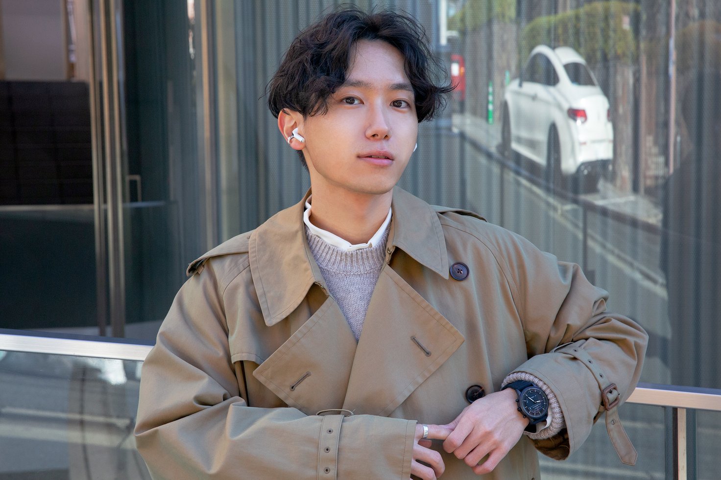 Taku.さんは、シックなデザインのスマートウォッチ「COLLIDER ブラックシリコン」を着用。音楽の再生や一時停止が可能で、ちょっとした散歩や移動の時間も快適に。1回の充電で約2週間バッテリーが持つのも魅力。