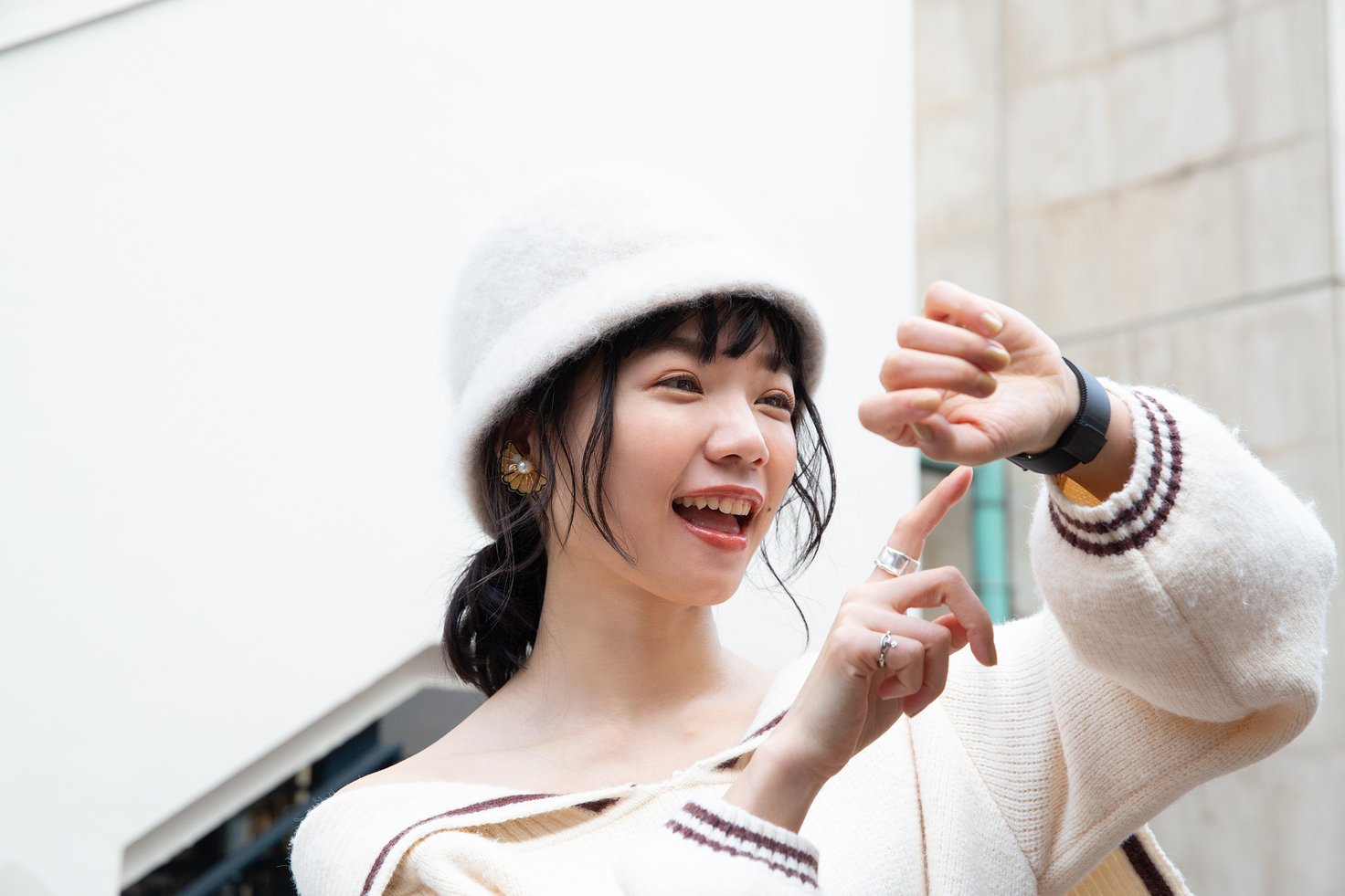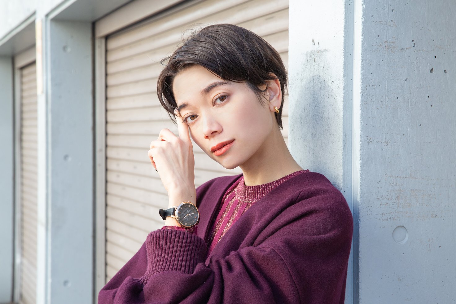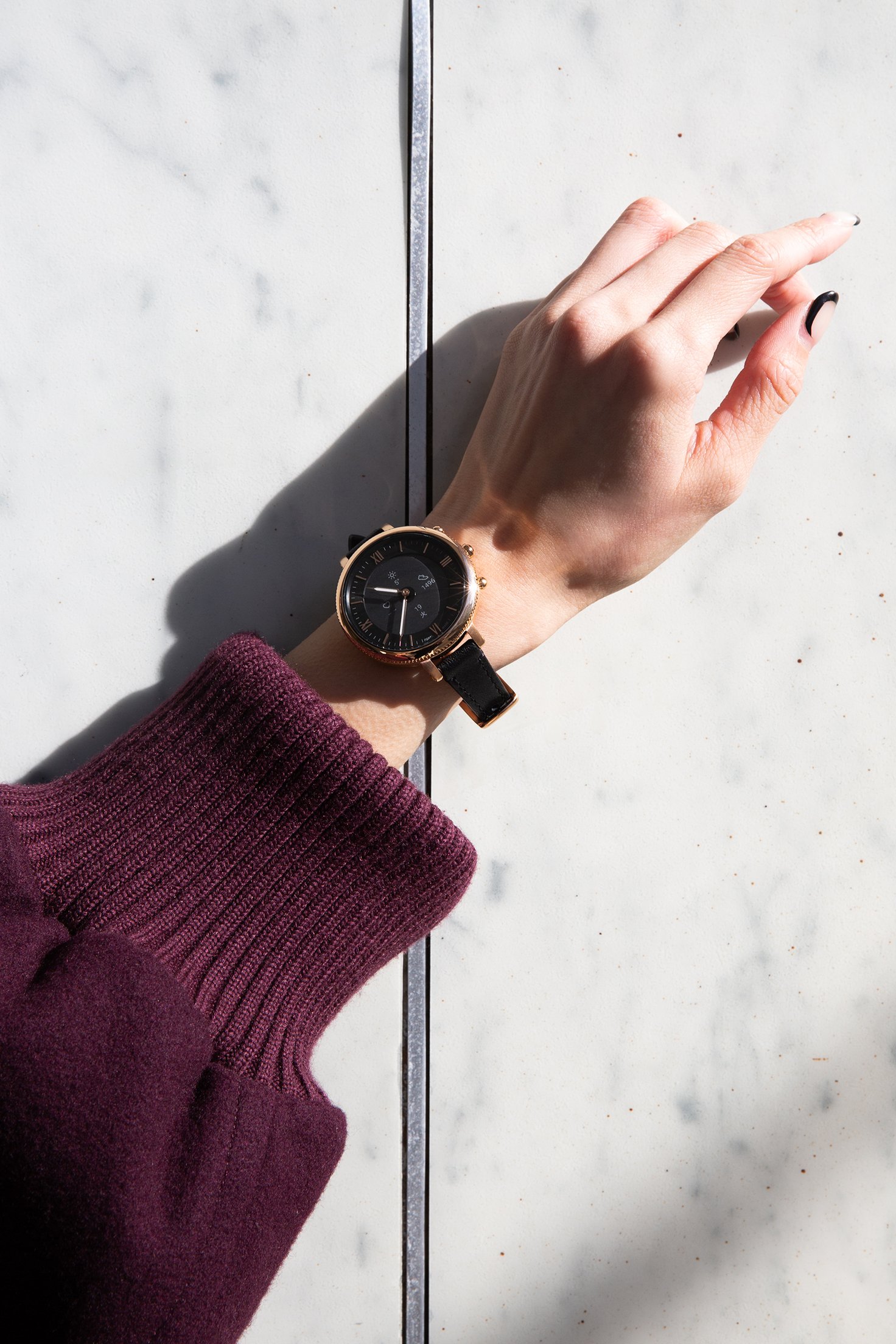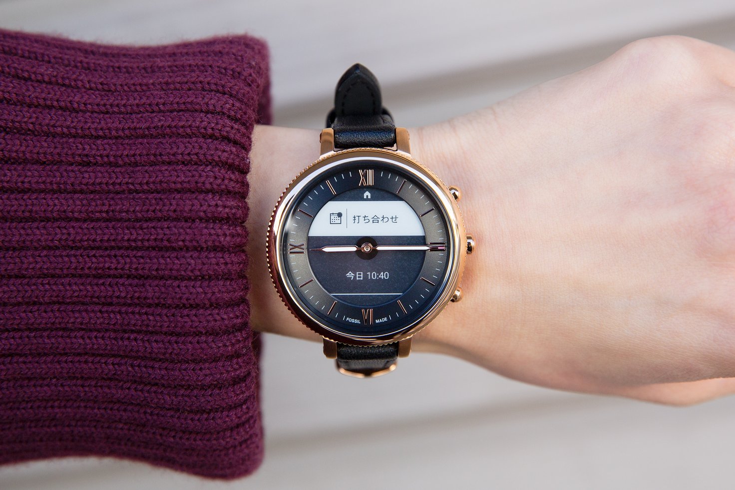 岩本ライラさんが着用した「MONROE ブラックレザー」は、アナログ時計のようなデザインでありながら、スマートウォッチの便利な機能が楽しめるモデル。時間はもちろん、スケジュールからワークアウトの進捗、リアルタイムの天気など、必要な情報をE-Ink方式の電子ペーパーディスプレイで一目で確認できます。ブレスレットが細めの華奢なデザインで、ファッション的にも取り入れやすい一本です。
