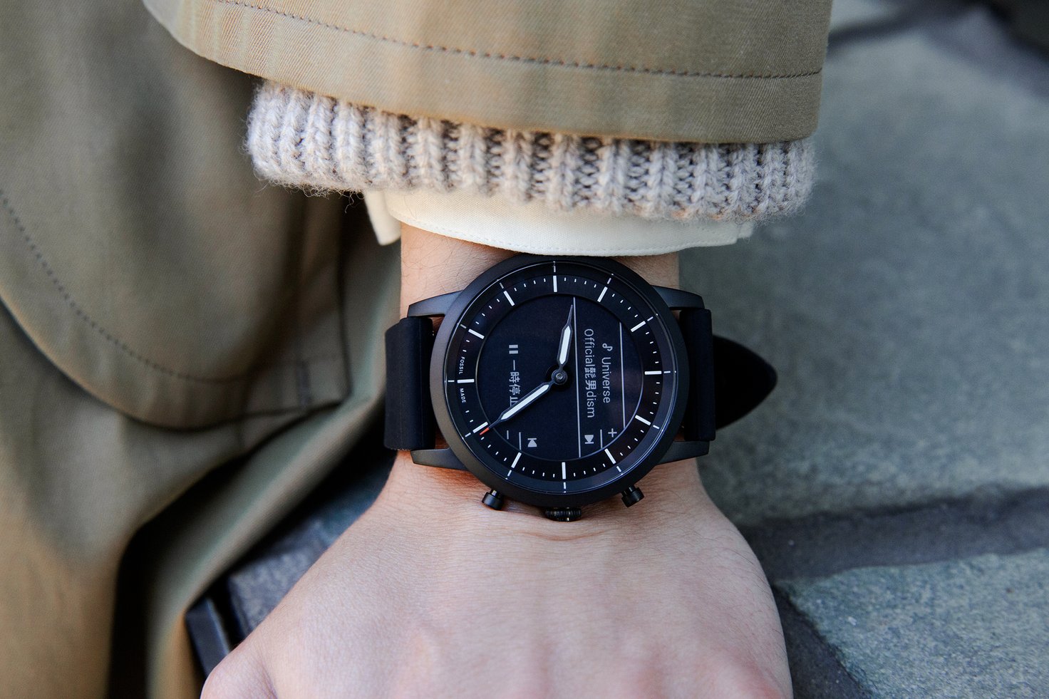 KYOさんが着用したのは、ジェネレーション5Eのモデル「ブラックシリコン」。フォッシル独自のフィットネスアプリ「Cardiogram」を搭載し、歩数をはじめ、睡眠、心拍数まで自動追跡してくれます。家での時間が長くなり、ついつい運動不足になりがちな今、自分の健康状態を把握するサポートに。