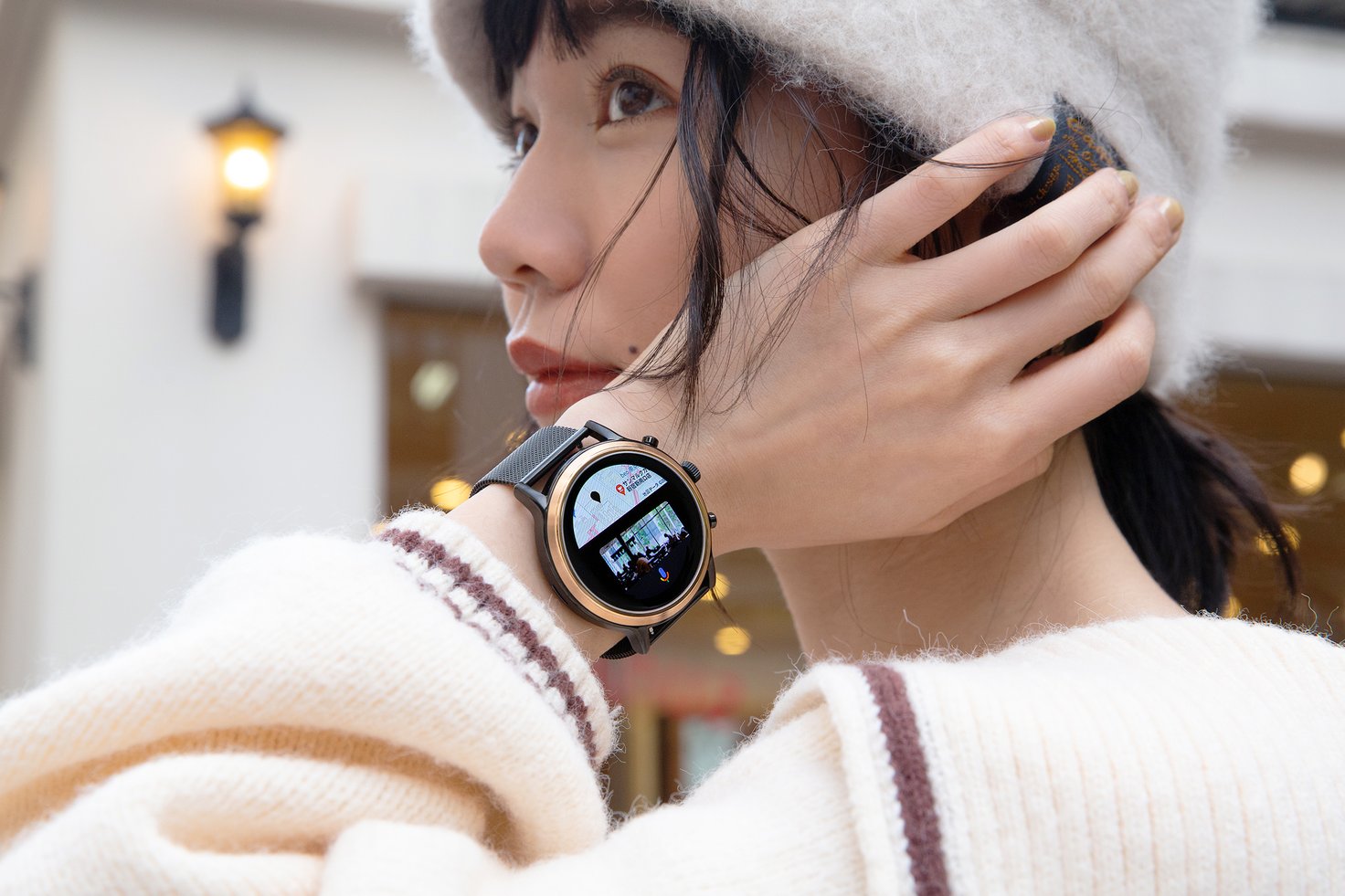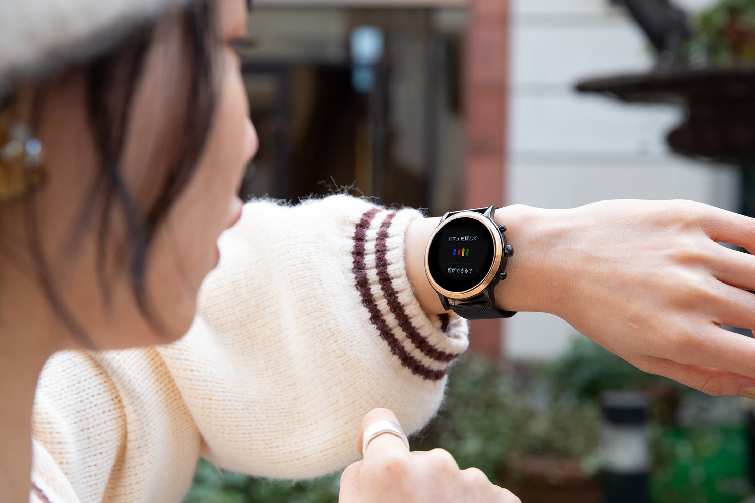 葉媚さんが着用したのは、ジェネレーション5のモデル「JULIANNA HR スモークステンレススチール」。スピーカーを搭載しているので、Googleアシスタント機能を使ってウォーキングの合間に近くのカフェを音声検索! 検索機能の他にも、「◯◯さんにメールする」「午前6時に起こして」といったアラームやリマインダー、メモ機能をはじめ、通話やメールの送信、音楽の操作など様々な場面であなたのアシスタント代わりに活躍します。