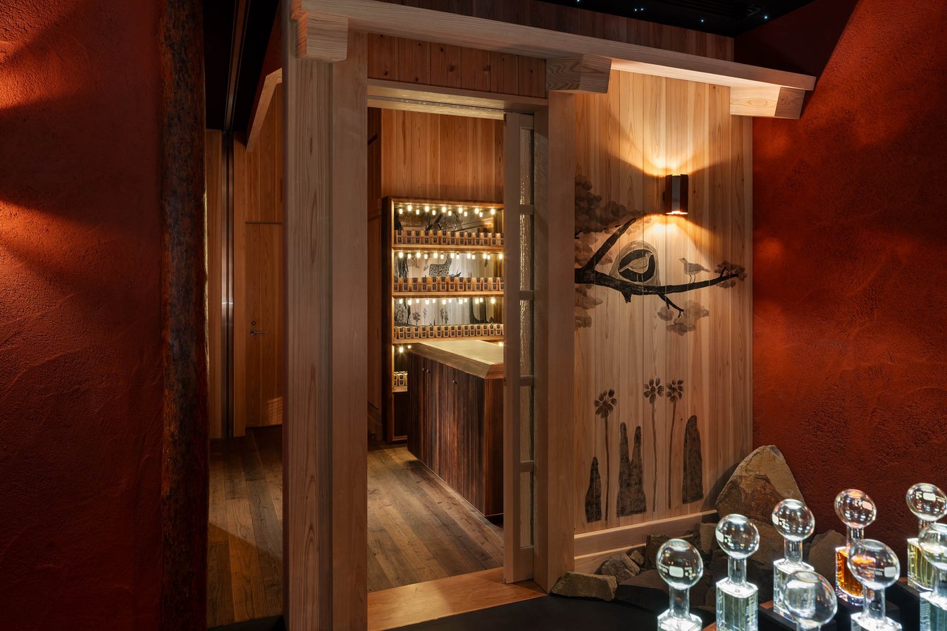 入り口に宮城県産の伊達冠石を積み、天井には1833年にティエラ・デル・フエゴの空に広がっていた星の配置を再現。奥には山口洋佑による墨のミューラルアートを施した木造空間を設置
