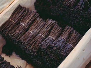ゲランの香りの真髄“ゲルリナーデ”を構成する6つの素材。(左上から反時計回りに)トンカビーン、ベルガモット、ジャスミン、ヴァニラ、アイリス、ローズ
