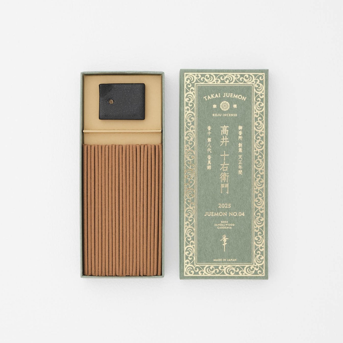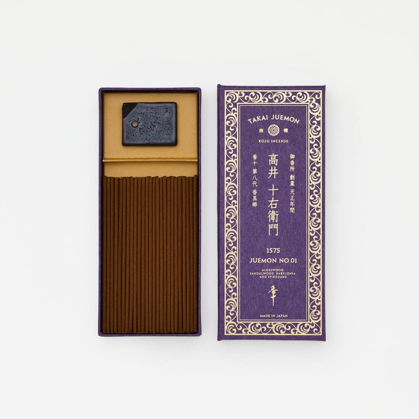 「香十 高井十右衛門 薫物家傳調合覚書」に基づき1575年に作られた銘香を現代の香原料を用いて再現。「高井十右衛門 1575 JUEMON NO.1」(50本入り 香立付き 3300円)