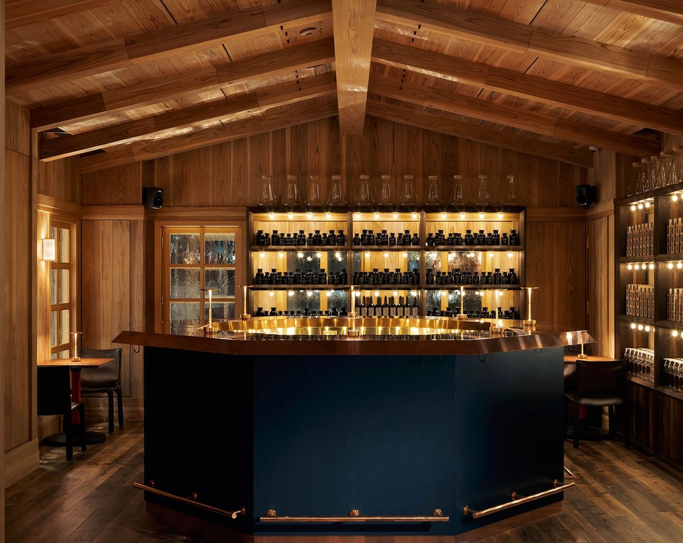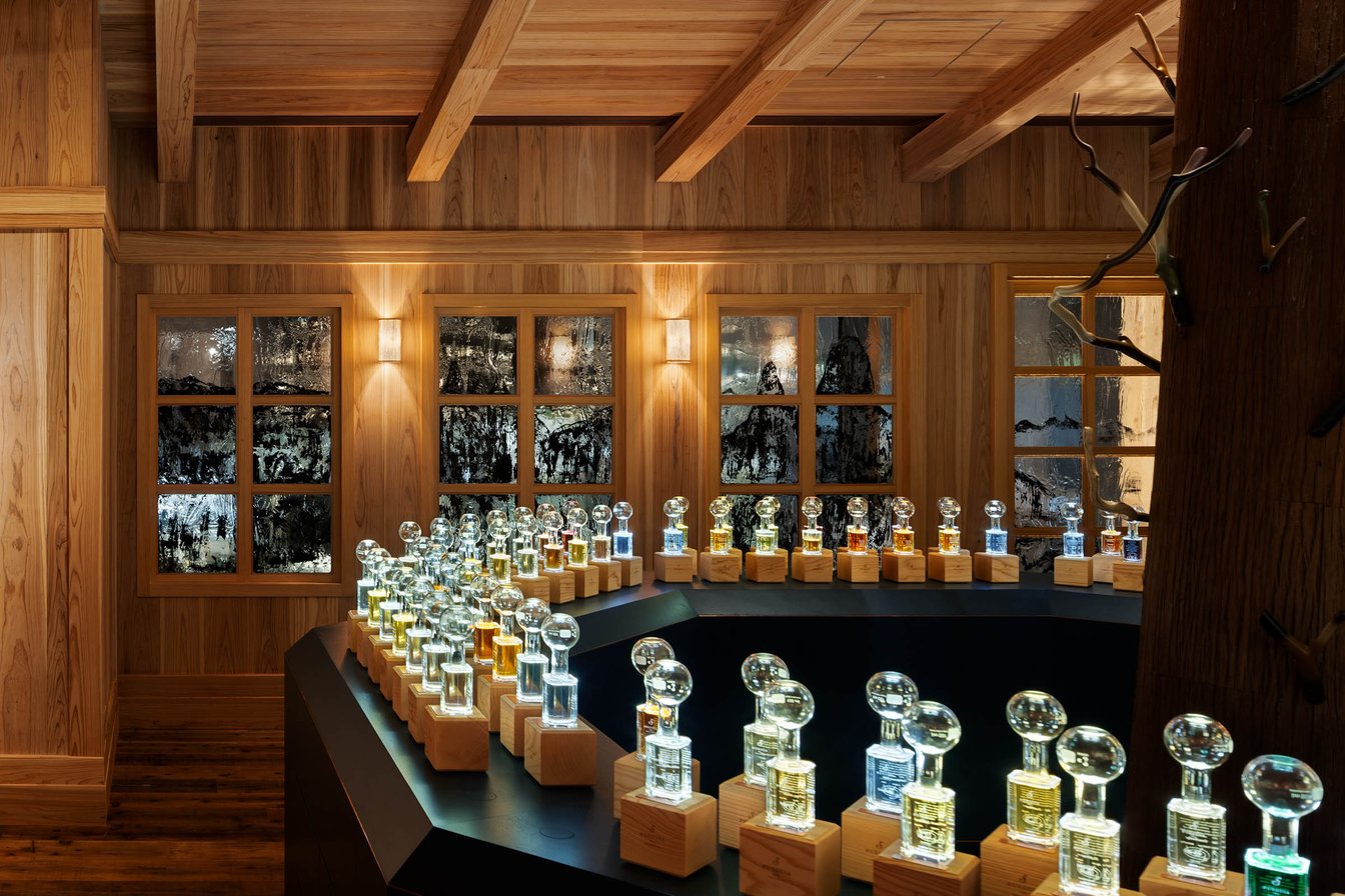 また、その壁面を埋め尽くしているボトルには、原材料で使用されるエッセンシャルオイルが詰められ、いつでも自由に嗅ぐことができるようになる。