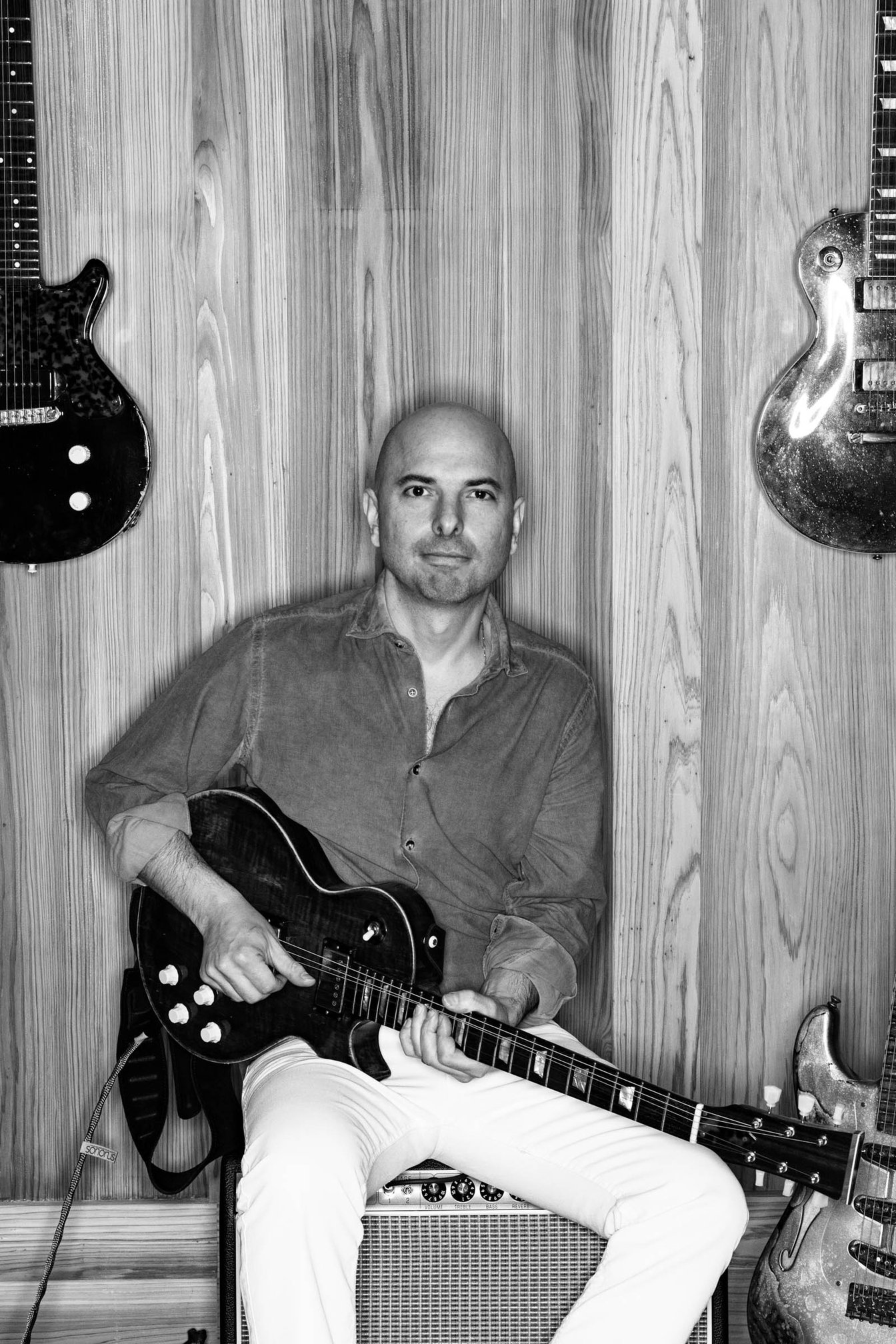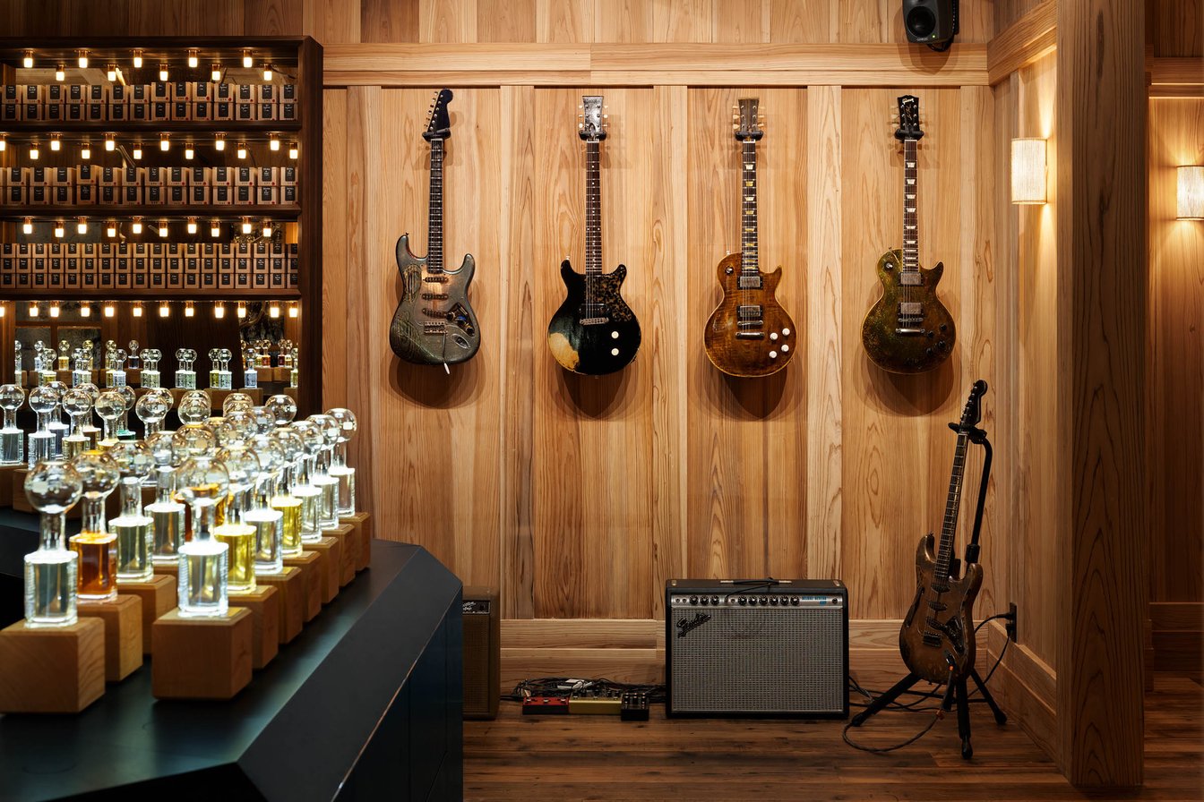 天井の梁や窓の木枠、ジェネレックのスピーカーなど細かく挙げればキリがないが、なかでも象徴的なのが壁に並ぶギターだ。弦楽器製作家でもあるジュリアンが、ヴィンテージパーツを揃えて創り上げたギターの数々。フレグランスと同じ名前がつけられたギターは1本数百万円程度にはなるが、購入可能だ。