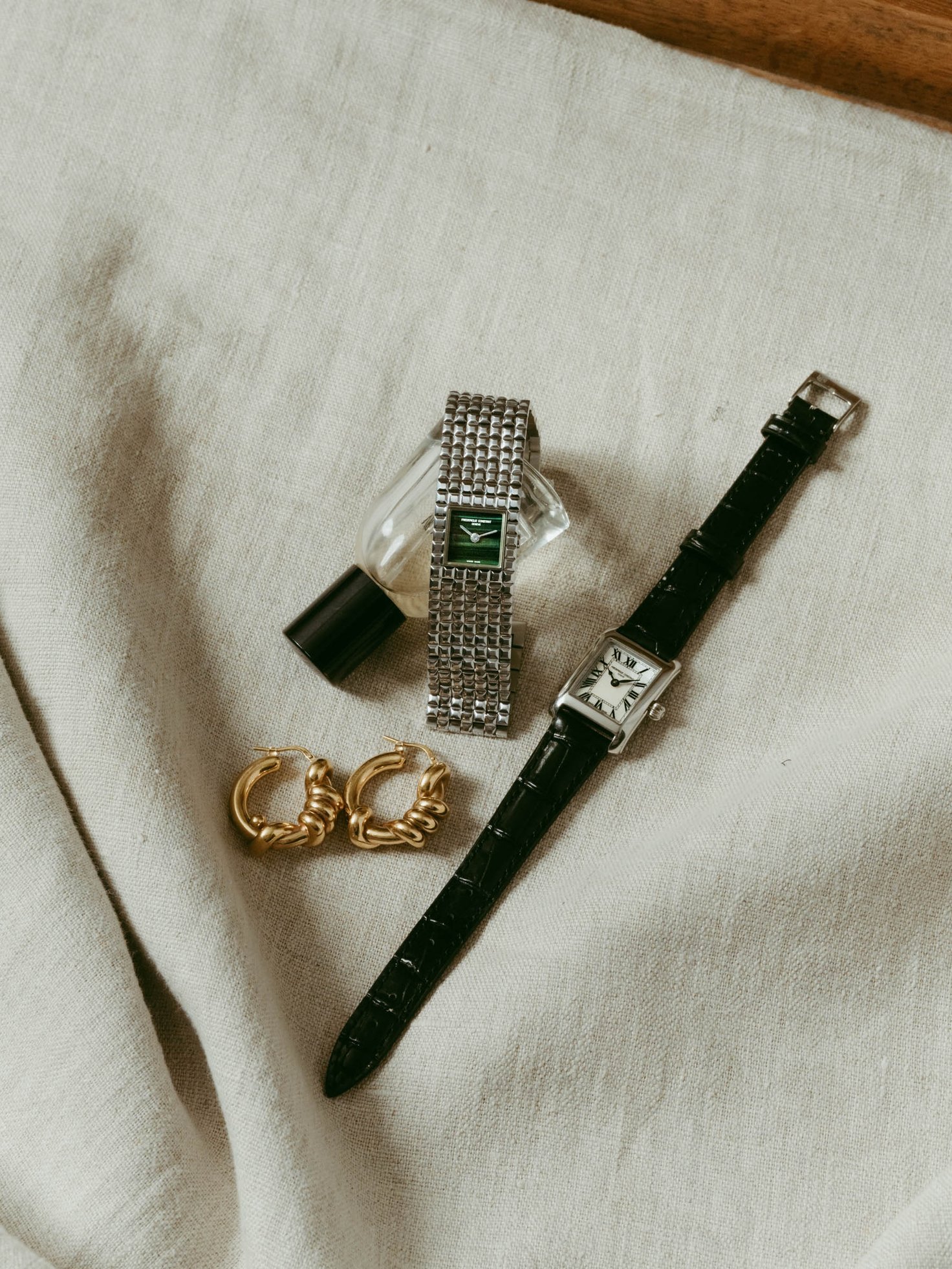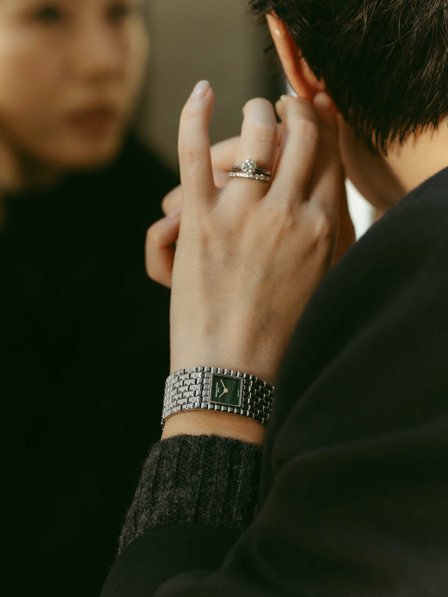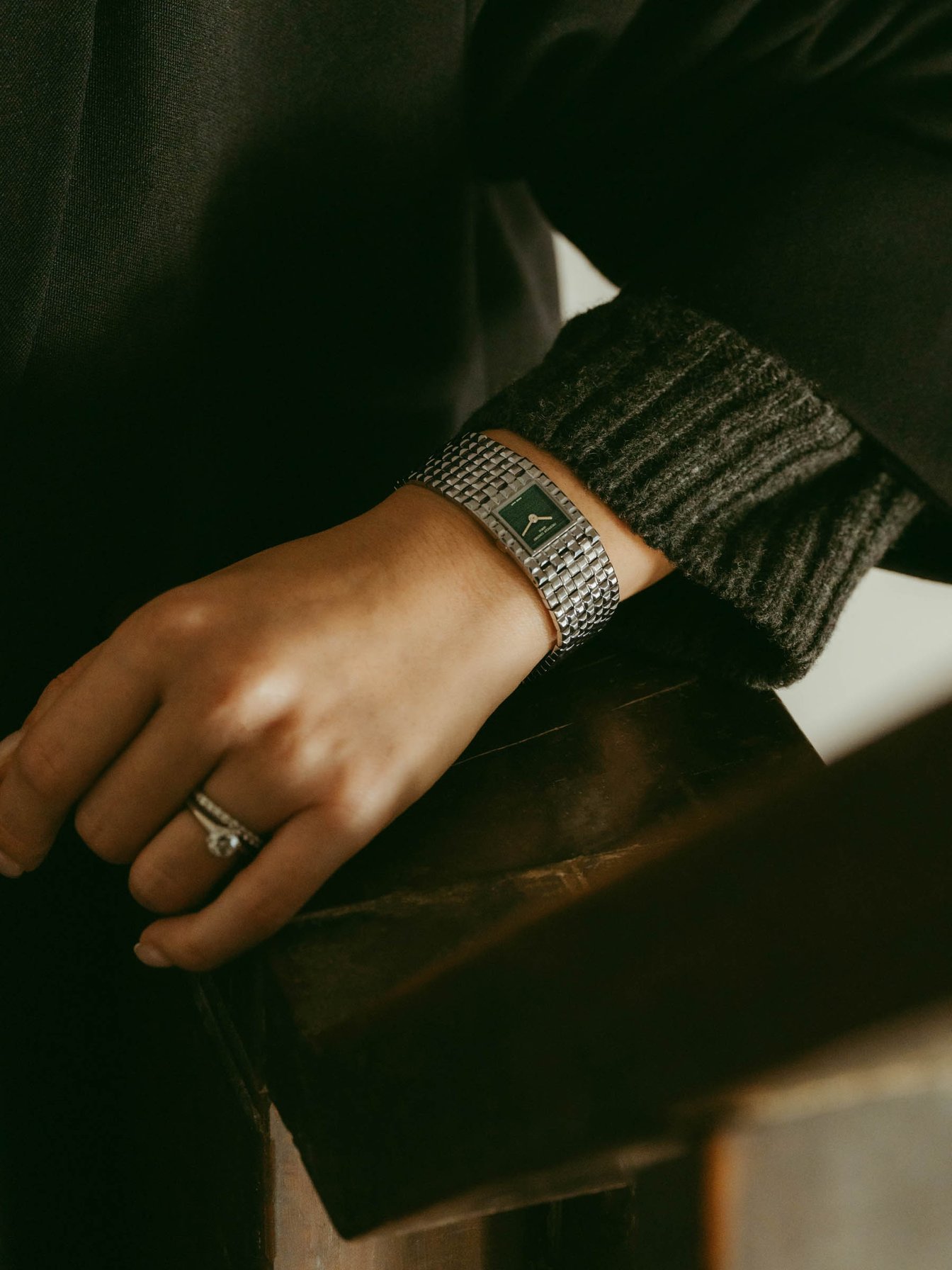 「スウェットやニットをクラスアップしてくれるような品のあるデザインですが、フェイスのグリーンがいい意味で少しカジュアル感があってかっこいい。ブレスレット部分のスタッズのようなデザインは、エレガントさもありつつエッジが効いているので、クールなスタイルに合わせるのも良いと思って」。