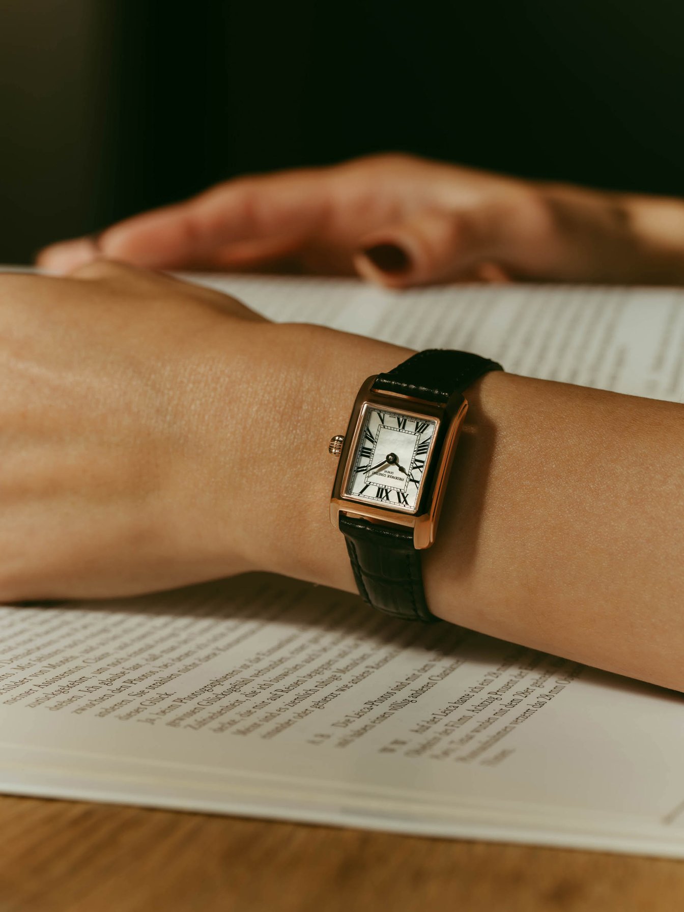 妥協のない選択は、カラー選びにも言えること。フレデリック・コンスタントの1番人気モデル「クラシック カレ レディース」の今冬の新作である日本限定モデルは、シルバーとローズゴールドの2色をラインナップしている。ジュエリーとの組み合わせにもこだわりたいからこそ、手持ちのジュエリーのカラーとバランスが取れるケースカラーを優先する人も多いかもしれない。「ローズゴールドカラーのジュエリーを持っていないからといって、つい安心感のあるシルバーを買ってしまう人が多いと思います。でも、ローズゴールドに心が惹かれているなら、絶対にローズゴールドを選ばなきゃ。自分の好きなことや直感を大事にして、自分のワードローブを固めていかなくては、結局自分の軸を見失ってしまいます。ローズゴールドは肌馴染みも良いですし、手元にゴールド、耳元にシルバーなど、ミックスして合わせると色が違っても取り入れやすいですよ」。