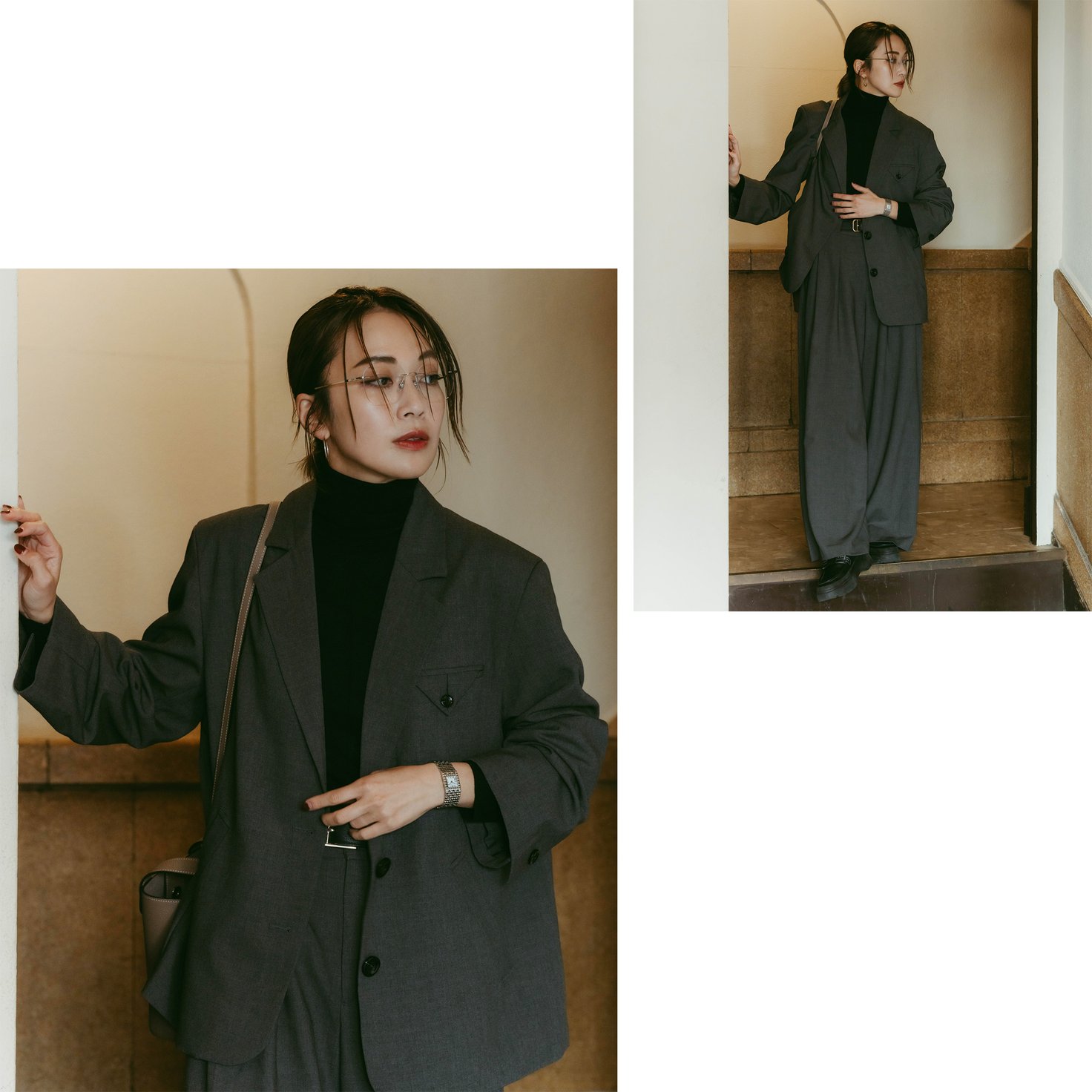 正中さんが「時計モード」になるONスタイルは、ブラックジャケットにバルーンシルエットのニットパンツを合わせることで柔らかな抜け感も。「クラシック マンシェット」を主役にシルバーで統一したジュエリーで引き締める。
