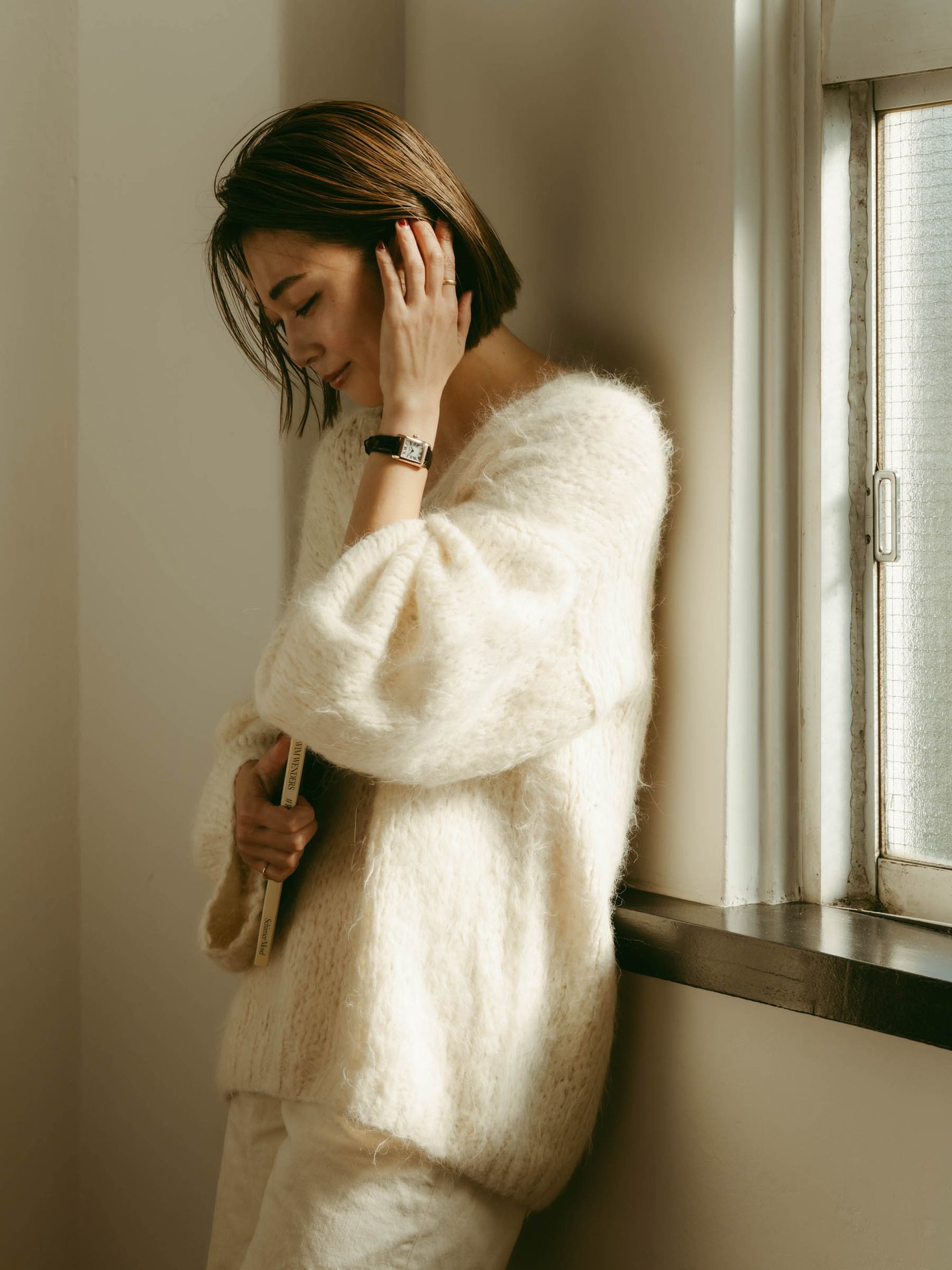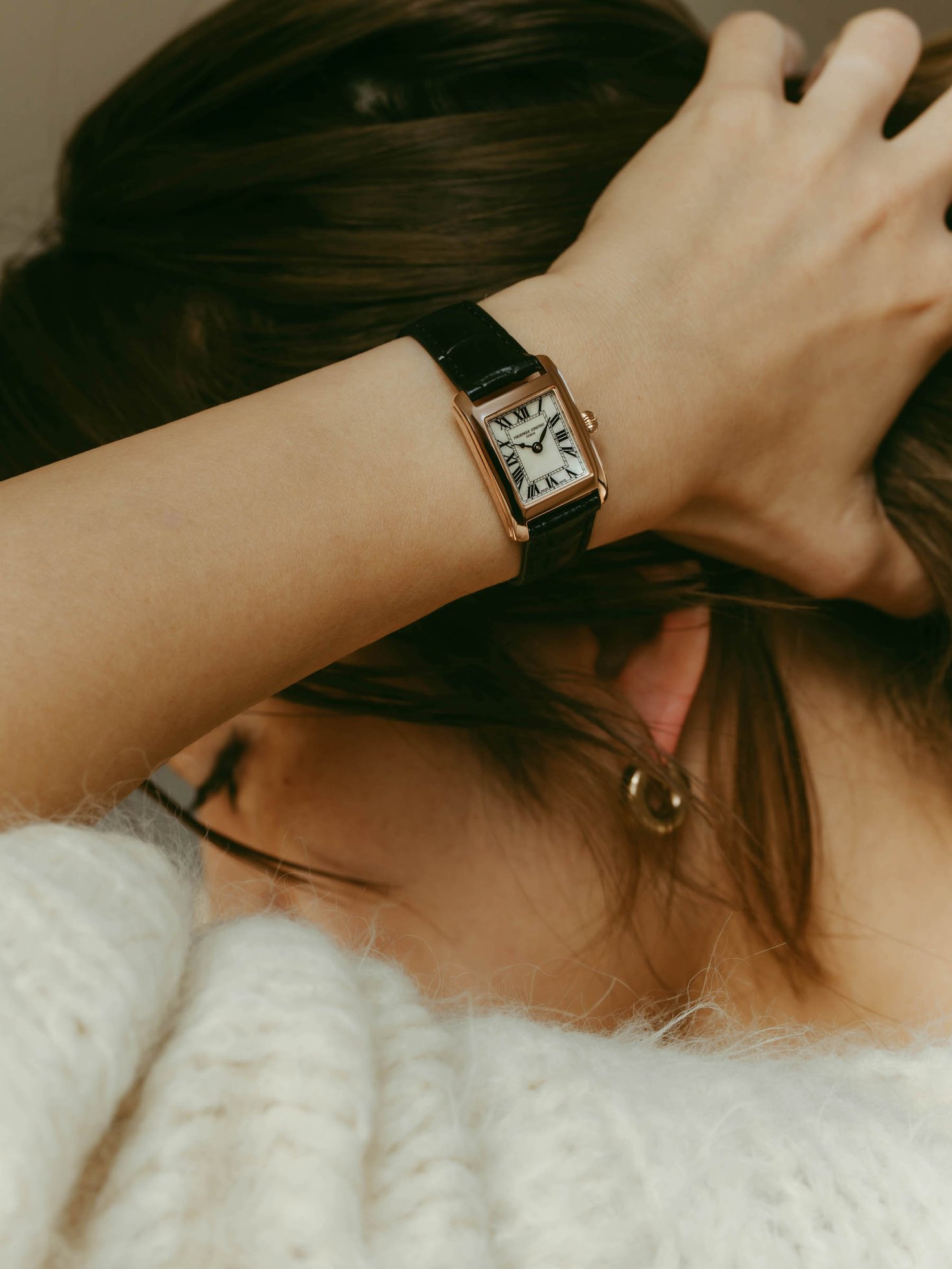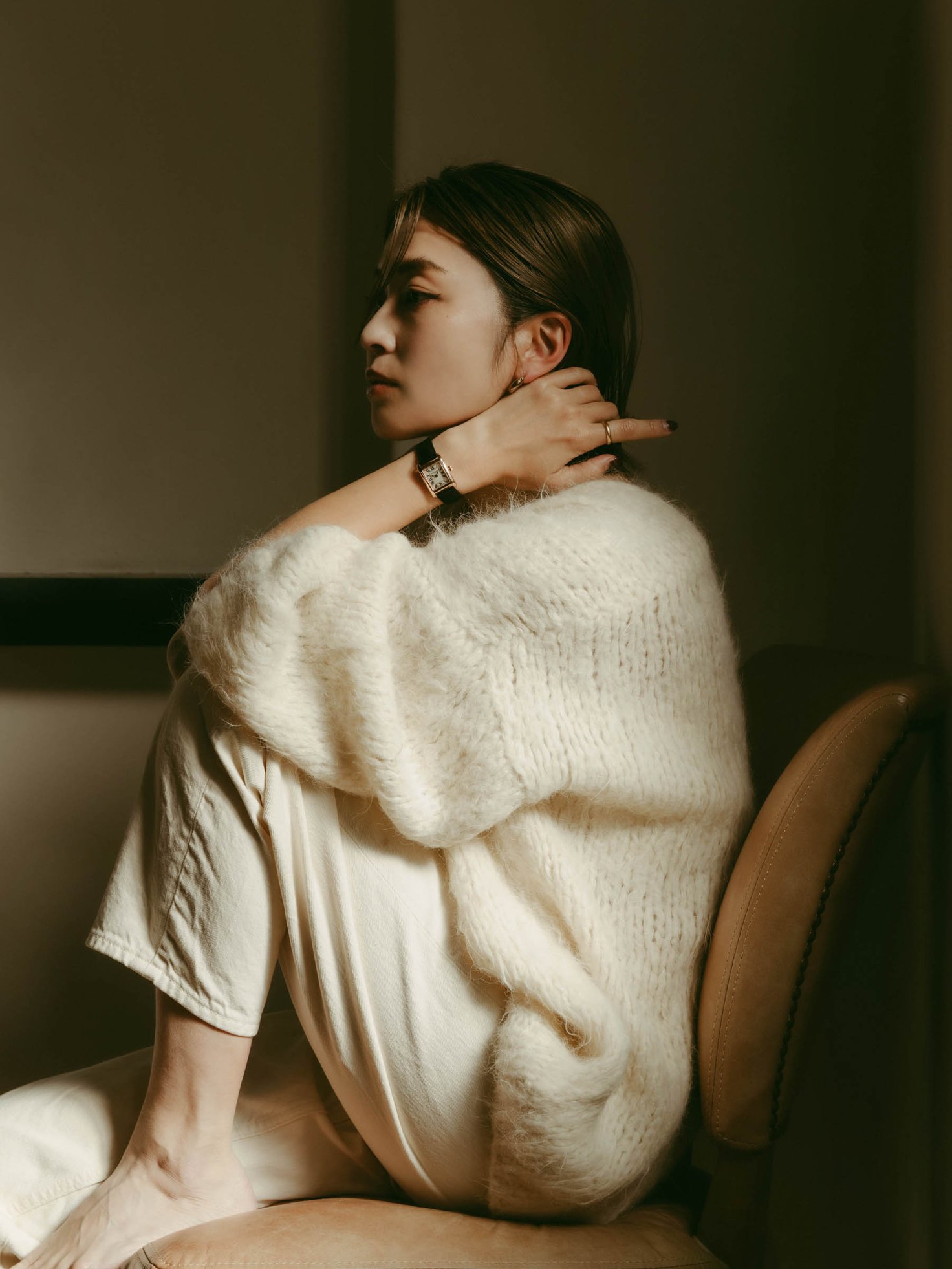 ローズゴールドのクラシック カレ レディースを主役にした、ホワイトのニットとパンツ、ゴールドジュエリーでまとめた柔らかなワントーンのリラックススタイル。ブラックの牛革に四角いフェイスのシンプルなデザインは、さまざまなブランドが発表しているからこそ選ぶのが難しい。「1本持っていたら、一生愛せるくらいシンプルで飽きのこないデザイン。女性らしさもあるけど華奢すぎず、日常使いもしやすいけどジュエリーとしての存在感もある絶妙なバランスです。フェイスは日本人女性の腕にフィットする秀逸なサイズ感ですし、文字盤が少し湾曲していて腕に沿うような丸みがあるのもまろやかで良いですね」。
