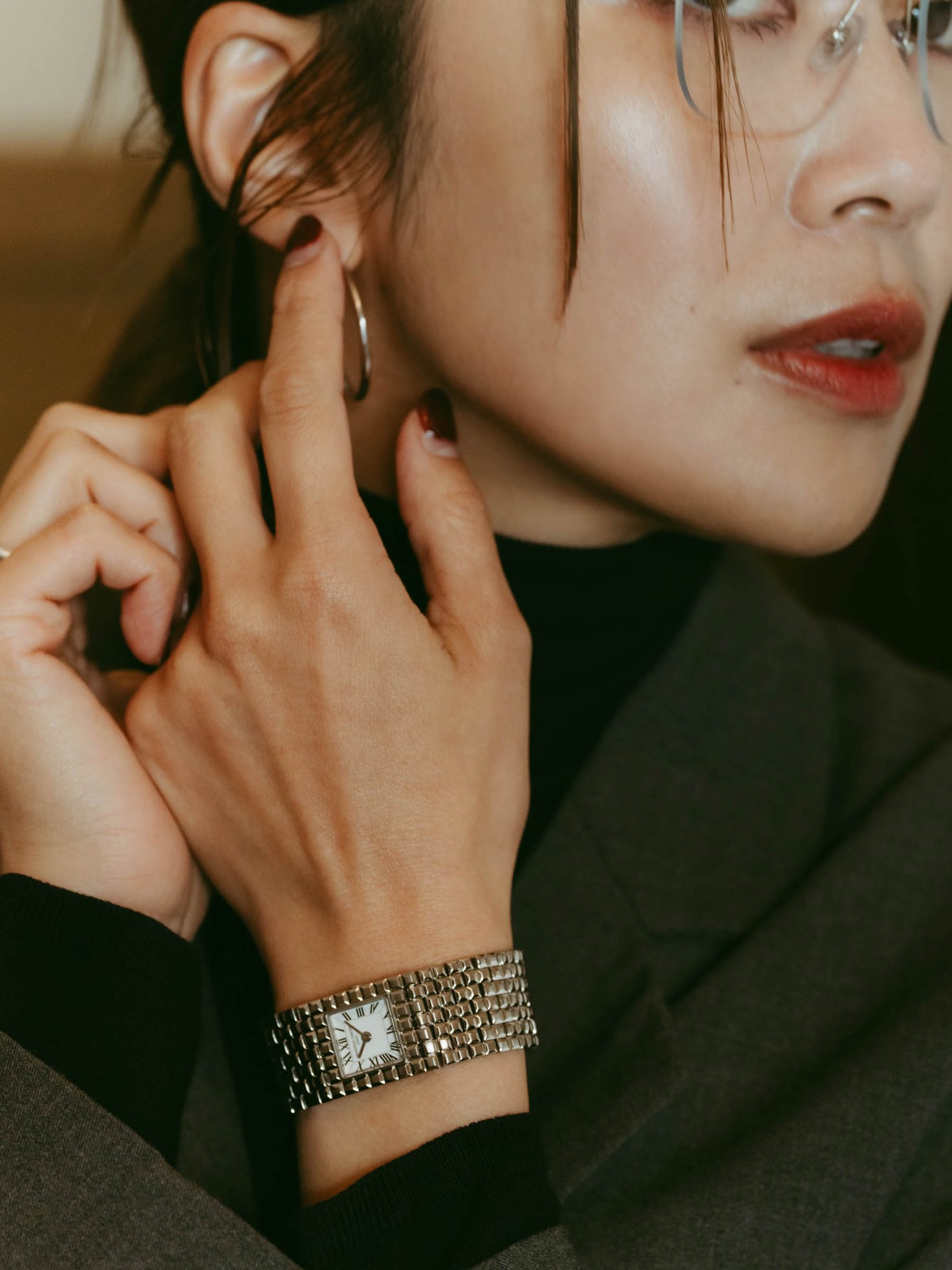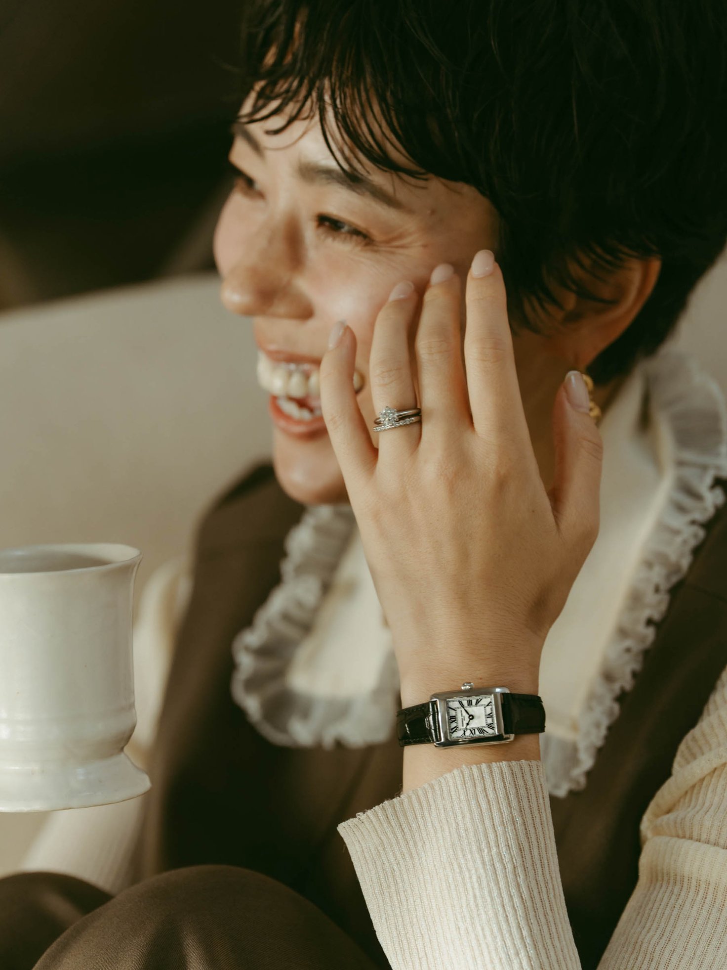 綺麗めなベージュのセットアップにはフリルの襟元で女性らしさや優しさをプラスし、シルバーフェイスで新たな表情を見せる「クラシック カレ レディース」でスパイスを。「女性らしさやエレガントさがありながら、それだけではなく“良い意味での強さ”のようなものを感じました。写真で見るだけでは伝わりにくい、凛とした佇まいが素敵です。デニムに合わせてもカッコ良さそう」。手元はシルバーとダイヤのリングに合わせ、耳元には大ぶりなゴールドのイヤリングを添えることでベージュトーンのセットアップとも調和。