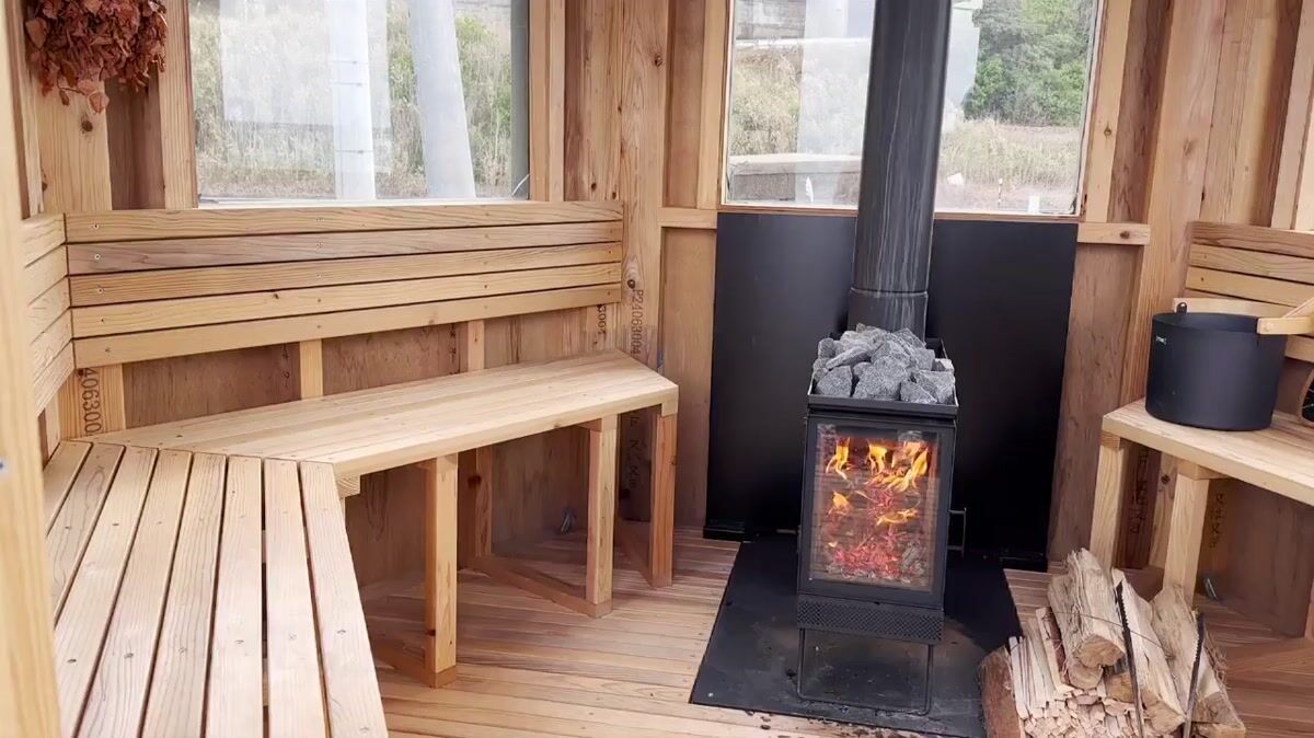 内装は木製。ストーブ側と入口以外の4辺がベンチで、薪の置き場などを加味すると定員は体感4〜5人という感じでした。