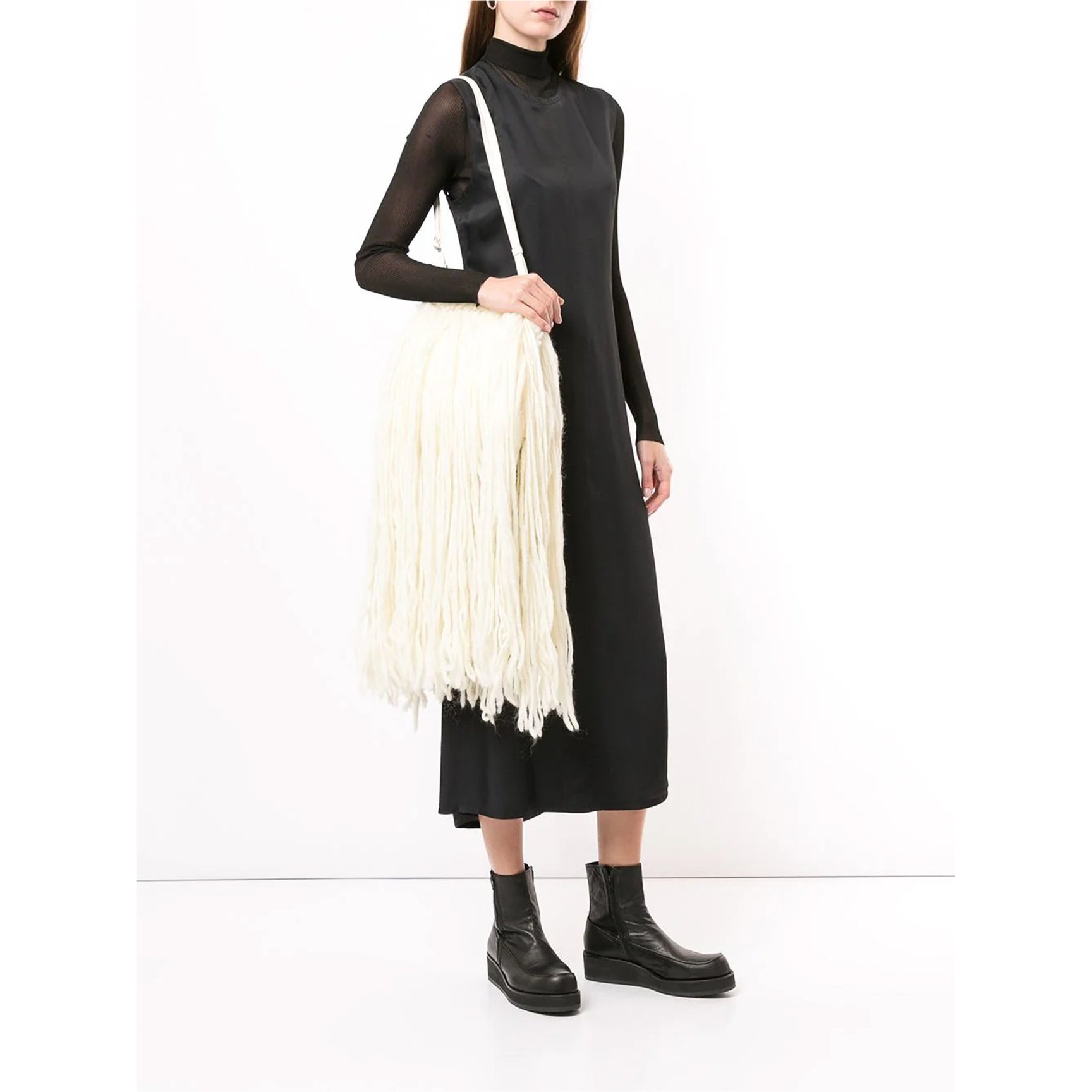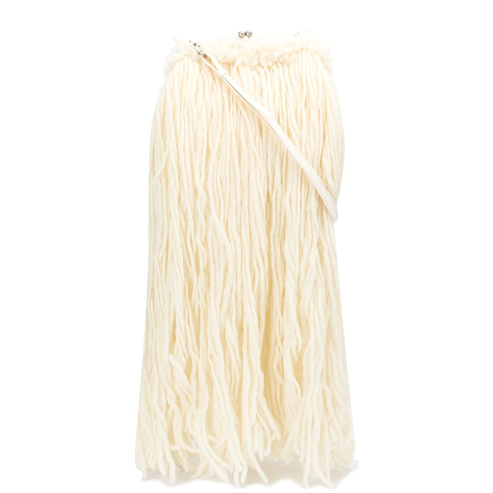 ラムウール100%、まるで本当の羊を抱えているかのような大きなフリンジが特徴のバッグは「ディスコード・ヨウジヤマモト(Discord Yohji Yamamoto)」のもの。日本ならではの繊細さや控えめなエレガンスに、エッジの効いたひねりを加えたバッグはひと目でわかるヨウジヤマモトの美学を体現しています。