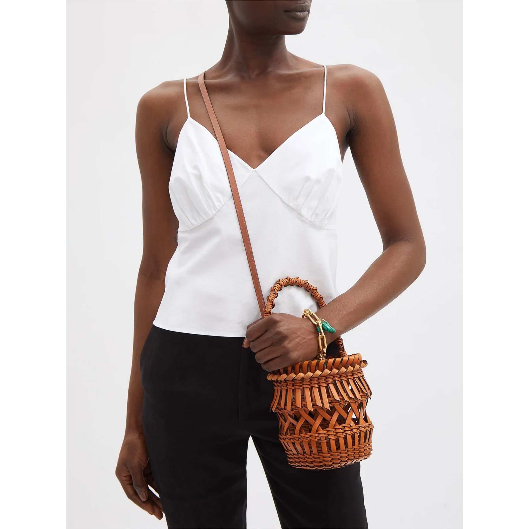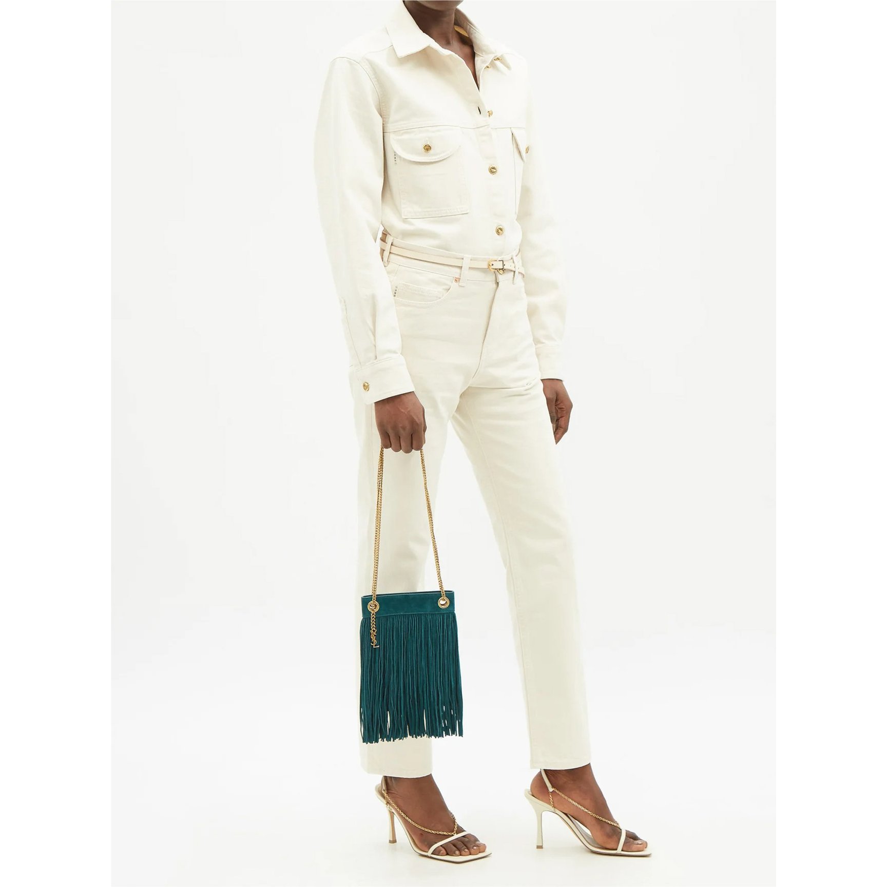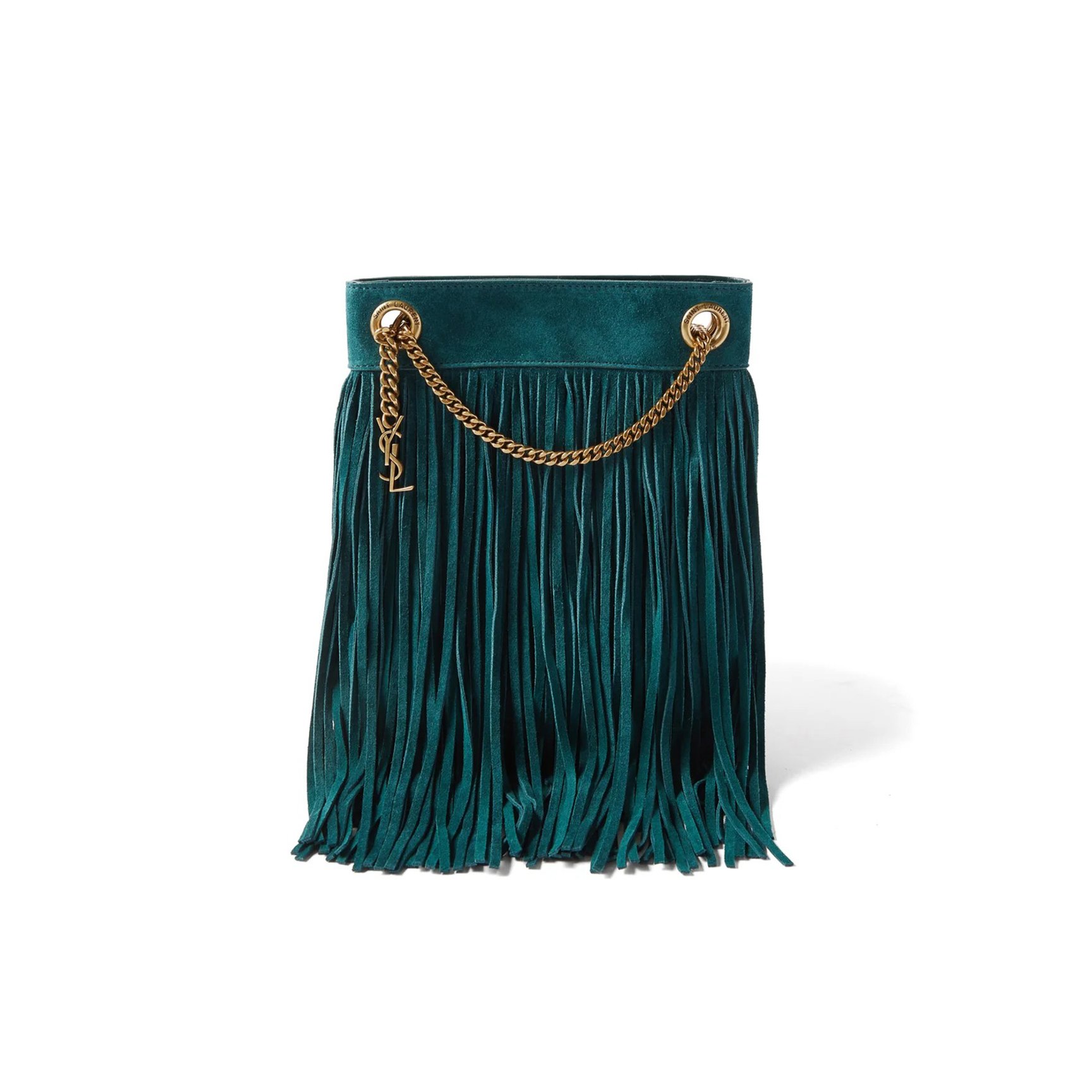 スエード素材のフリンジが高級感を高めるバッグは「サンローラン(SAINT LAURENT)」のもの。2022年リゾートコレクションで披露されたアクセサリーのキーカラーであるティールグリーンが、レトロに洗練されたムードをプラス。さりげなく付属するYSLのチャームもワンポイントです。