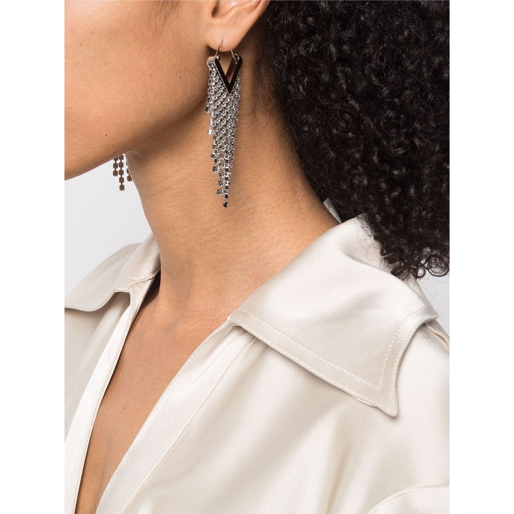 クリスタルのラグジュアリーなフリンジテイストのピアスは「イザベル・マラン(Isabel Marant)」のもの。真鍮とガラスでできたピアスは、耳元に輝きと透明感を演出。動くたびに顔まわりでクリスタルの輝きが散りばめられます。