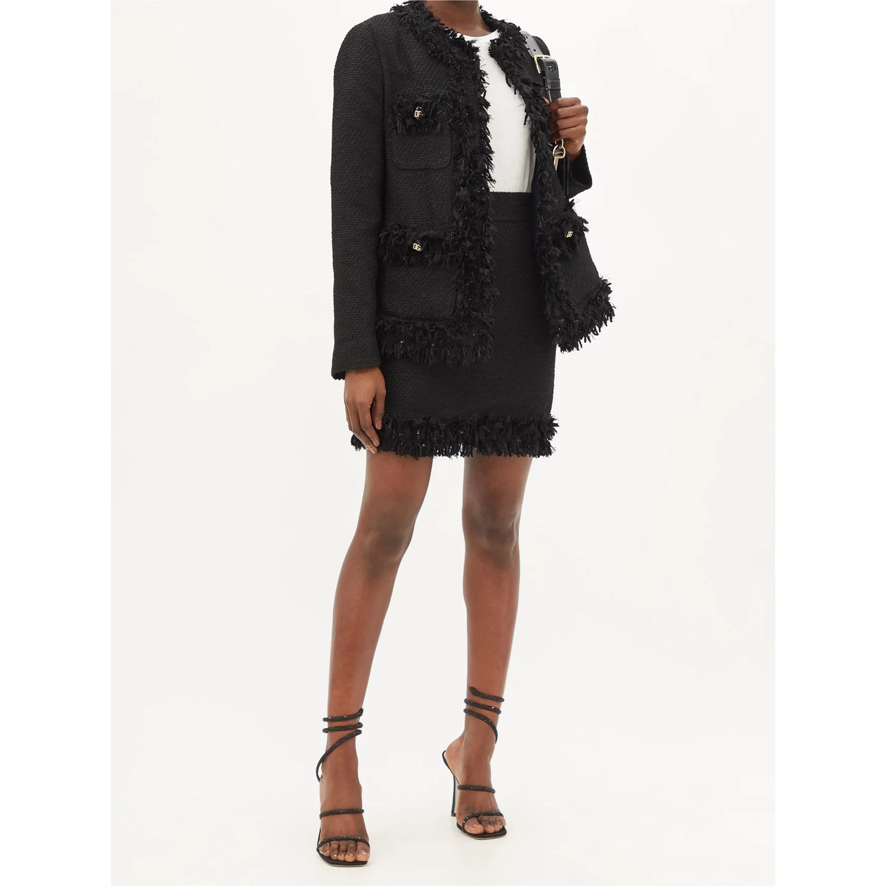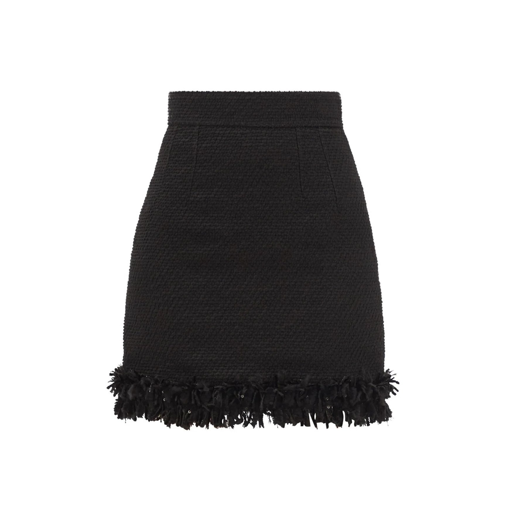 ツイード素材で上品な印象を与えるフリンジスカートは「ドルチェ&ガッバーナ(DOLCE & GABBANA)」のもの。こちらのスカートは、質感と素材にフォーカスしたブラックカラーのアイテムを提案する「Hot Stuff」コレクションからの一着。細かく短めのフリンジとツイード素材が、女性らしい上品なルックを叶えます。