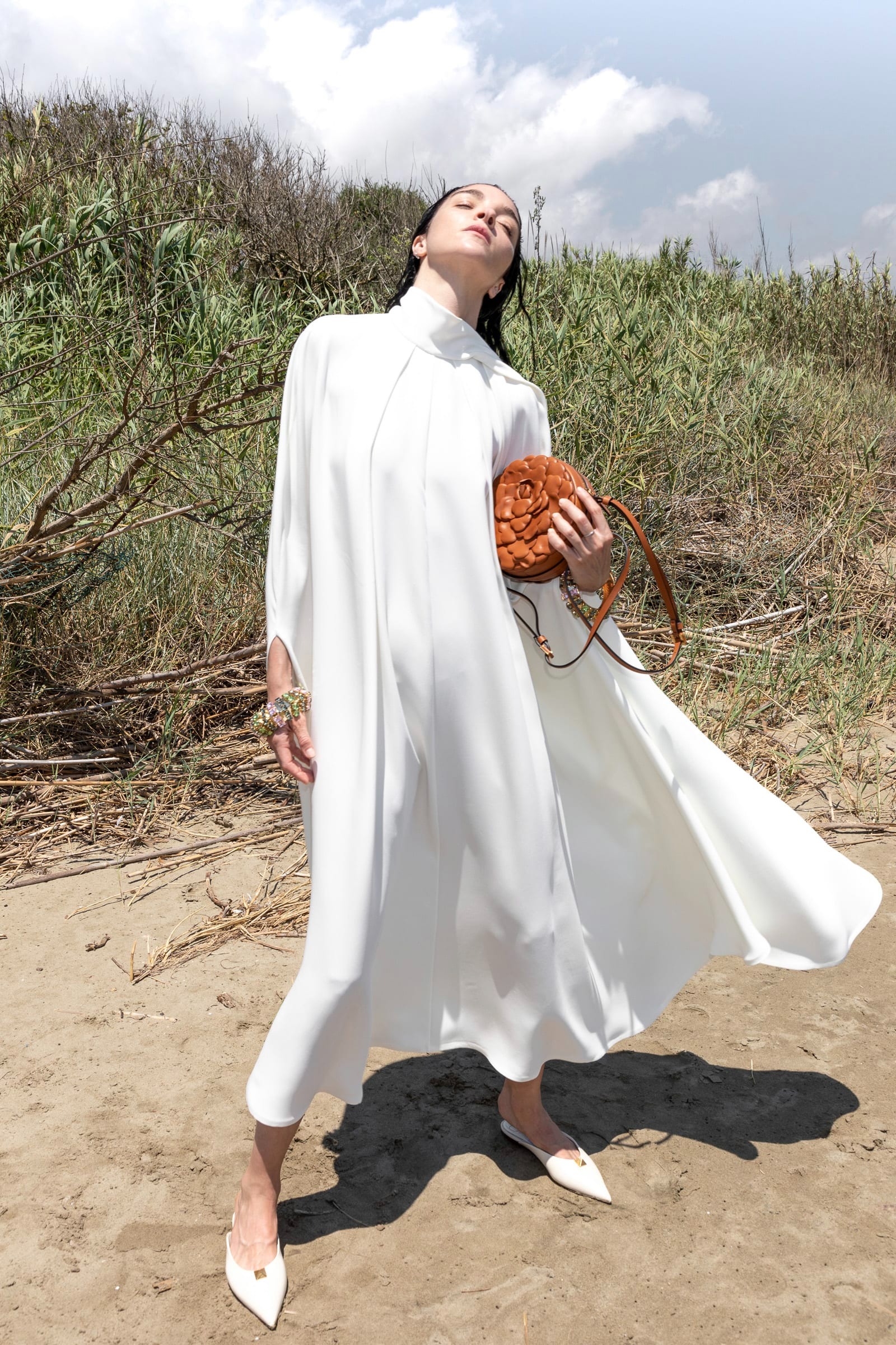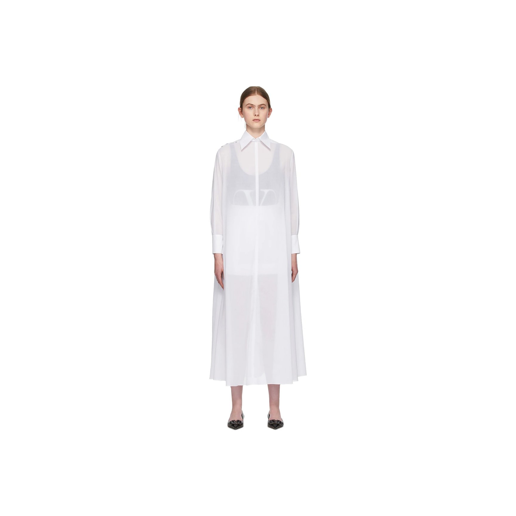 シルエットが美しい「ヴァレンティノ」のホワイトドレス。セミシアーなコットン素材を使用したふんわりとしたAラインのシルエットに、シャツ風のディテールのコンビネーションが絶妙。サイドラインは深いスリットが入っているので、チュニック風に着こなして、インナーと合わせたスタイリングを楽しみましょう。ベルトでウエストをマークして、シルエットに変化をつけるのもおすすめです。