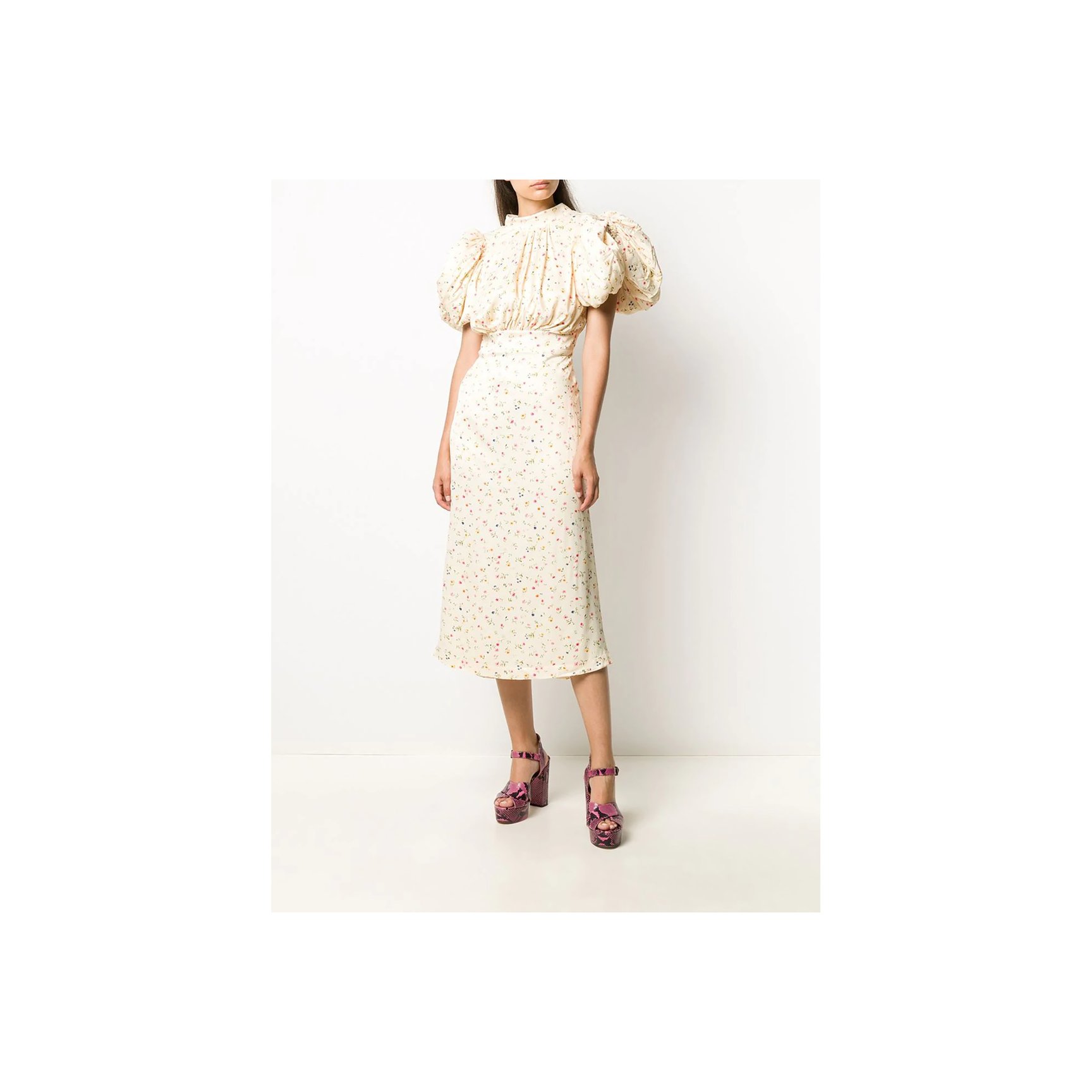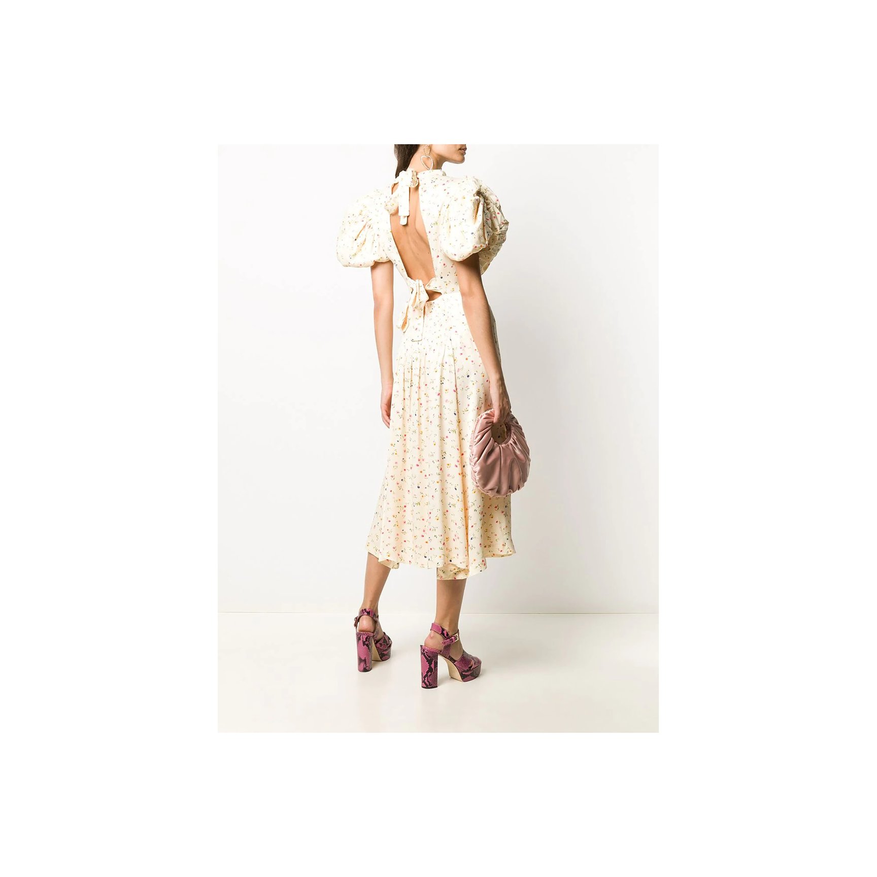 臼田さんの着用の衣装とカラー違いの「ローテート バーガー クリステンセン」のワンピースがこちら。優しいクリームカラーと小花柄で、よりスイートな雰囲気に。バックシャンなスタイルはこちらも同様です。