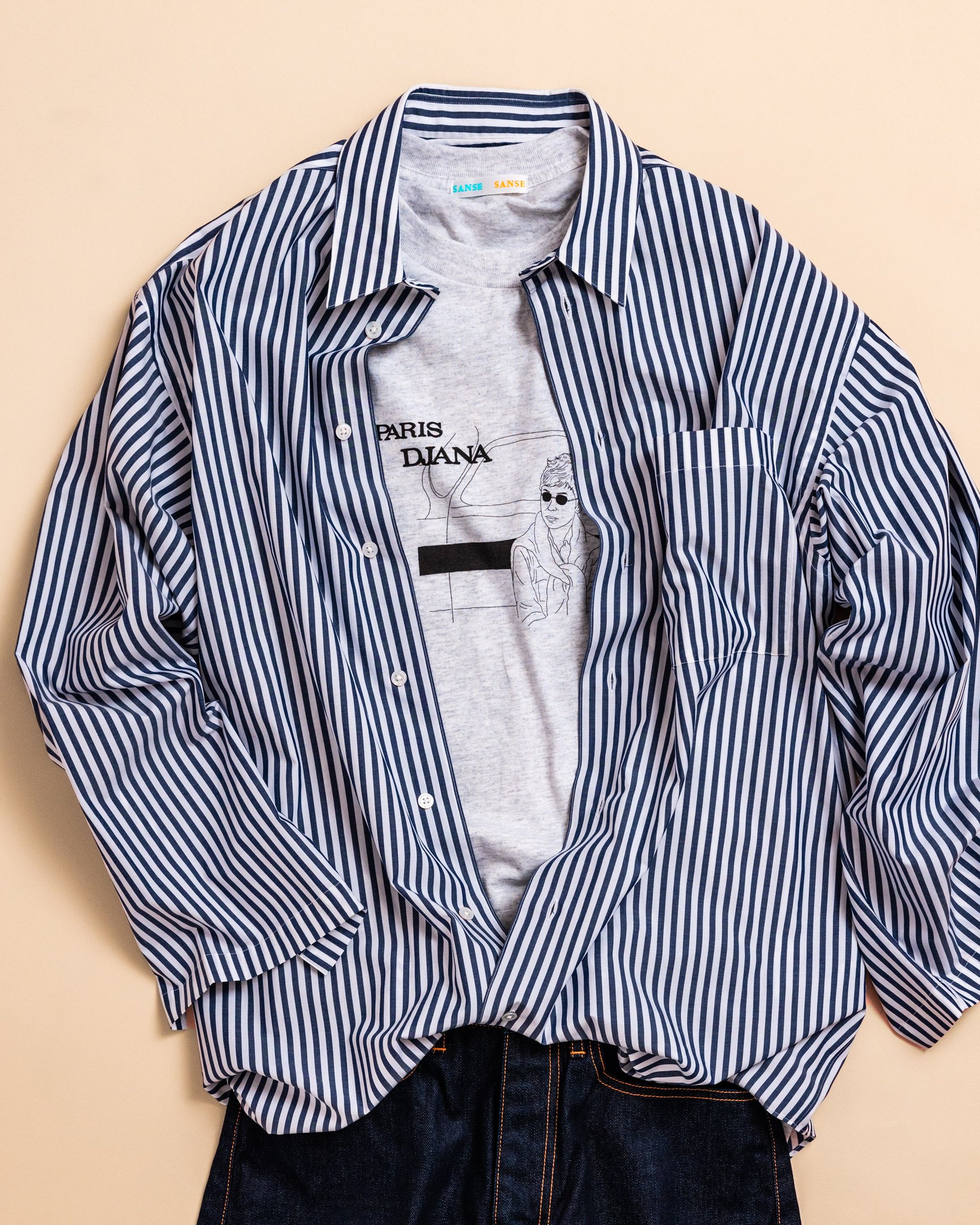 線の細い手書き風のプリントが可愛いTシャツは、スタイリスト 梶雄太がディレクションする「サンセサンセ(SANSE SANSE)」のもの。身幅にたっぷりとゆとりを持たせたシルエットで、カチッとしすぎないバランスが今っぽいです。アーバンな「ポステレガント(POSTELEGANT)」のストライプシャツと組み合わせてイラストをチラ見せしても良し。肌触りが良いコットン素材なので、もう少し肌寒くなってきたらスウェットやニットのインナーとしても活躍してくれそう。